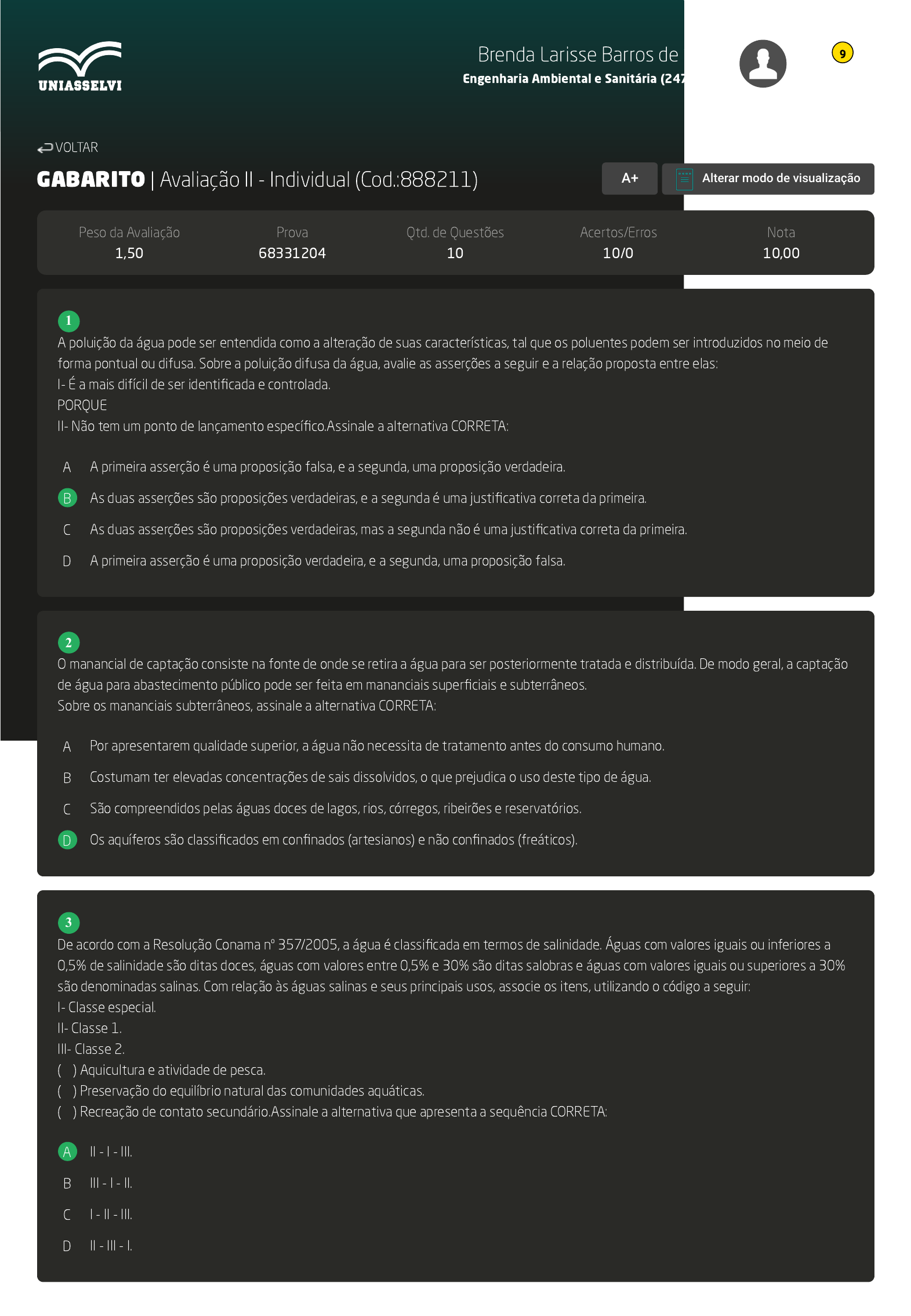 GABARITO | Avaliação II - Individual (Cod.:888211) Peso da Avaliação 1,50 Prova 68331204 Qtd. de Questões 10 Acertos/Erros 10/0 Nota 10,00 A poluição da água pode ser entendida como a alteração de suas características, tal que os poluentes podem ser introduzidos no meio de forma pontual ou difusa. Sobre a poluição difusa da água, avalie as asserções a seguir e a relação proposta entre elas: I- É a mais difícil de ser identificada e controlada. PORQUE II- Não tem um ponto de lançamento específico.Assinale a alternativa CORRETA: A A primeira asserção é uma proposição falsa, e a segunda, uma proposição verdadeira. B As duas asserções são proposições verdadeiras, e a segunda é uma justificativa correta da primeira. C As duas asserções são proposições verdadeiras, mas a segunda não é uma justificativa correta da primeira. D A primeira asserção é uma proposição verdadeira, e a segunda, uma proposição falsa. O manancial de captação consiste na fonte de onde se retira a água para ser posteriormente tratada e distribuída. De modo geral, a captação de água para abastecimento público pode ser feita em mananciais superficiais e subterrâneos. Sobre os mananciais subterrâneos, assinale a alternativa CORRETA: A Por apresentarem qualidade superior, a água não necessita de tratamento antes do consumo humano. B Costumam ter elevadas concentrações de sais dissolvidos, o que prejudica o uso deste tipo de água. C São compreendidos pelas águas doces de lagos, rios, córregos, ribeirões e reservatórios. D Os aquíferos são classificados em confinados (artesianos) e não confinados (freáticos). De acordo com a Resolução Conama nº 357/2005, a água é classificada em termos de salinidade. Águas com valores iguais ou inferiores a 0,5% de salinidade são ditas doces, águas com valores entre 0,5% e 30% são ditas salobras e águas com valores iguais ou superiores a 30% são denominadas salinas. Com relação às águas salinas e seus principais usos, associe os itens, utilizando o código a seguir: I- Classe especial. II- Classe 1. III- Classe 2. ( ) Aquicultura e atividade de pesca. ( ) Preservação do equilíbrio natural das comunidades aquáticas. ( ) Recreação de contato secundário.Assinale a alternativa que apresenta a sequência CORRETA: A II - I - III. B III - I - II. C I - II - III. D II - III - I. VOLTAR A+ Alterar modo de visualização 1 2 3 Brenda Larisse Barros de Sena Engenharia Ambiental e Sanitária (2471351) 9 Em uma rede de distribuição de água, emprega-se para acúmulo de água o reservatório de distribuição, com o objetivo de atender às variações do consumo horário, manter pressão mínima ou constante na rede e atender às demandas de emergência. Com relação à localização e à forma construtiva dos reservatórios, associe os itens, utilizando o código a seguir: I- Reservatório de montante. II- Reservatório de jusante. III- Reservatório enterrado. ( ) É responsável pelo fornecimento de água à rede, e fica situado no início da rede de distribuição. ( ) Pode receber ou fornecer água na rede de distribuição, nos períodos de maior ou menor demanda. ( ) É construído abaixo da cota do terreno.Assinale a alternativa que apresenta a sequência CORRETA: A II - III - I. B III - I - II. C II - I - III. D I - II - III. A Resolução Conama nº 357/2005 classifica a água em termos de salinidade, de modo que águas com valores iguais ou inferiores a 0,5% de salinidade são ditas doces, águas com valores entre 0,5% e 30% são ditas salobras e águas com valores iguais ou superiores a 30% são denominadas salinas. Com relação à nobreza dos mananciais de águas doces, ordene os itens a seguir: I- Classe 1. II- Classe 2. III- Classe 3. IV- Classe 4. V- Classe especial.Assinale a alternativa que apresenta a sequência CORRETA: A V - III - IV - II - I. B III - IV - II - I - V. C I - II - III - IV - V. D V - I - II - III - IV. A escolha do tipo de tratamento a ser utilizado em uma ETA está relacionada, diretamente, com a qualidade da água do manancial de captação, bem como do enquadramento de sua classe, conforme disposto pela Resolução Conama nº 357/2005, alterada e complementada pela Resolução Conama nº 430/2011, e também da qualidade da água desejada para a água tratada. Com relação ao tratamento da água de acordo com a classificação do manancial de captação, associe os itens, utilizando o código a seguir: I- Classe 1. II- Classe 2. III- Classe 3. ( ) Clarificação por meio de filtração e desinfecção e correção de pH. ( ) Clarificação por meio de coagulação e floculação, seguida de desinfecção e correção de pH. ( ) Remoção e/ou inativação de constituintes que podem conferir à água características como sabor, odor, e cor. Assinale a alternativa que apresenta a sequência CORRETA: A I - II - III. B II - I - III. C III - I - II. D II - III - I. O tratamento da água é feito nas ETAs (Estações de Tratamento da Água) com vistas a torná-la potável ao consumidor. Dentre as várias etapas do tratamento da água, destaca-se a coagulação. Sobre a coagulação, assinale a alternativa CORRETA: 4 5 6 7 Brenda Larisse Barros de Sena Engenharia Ambiental e Sanitária (2471351) 9 A Na etapa de mistura rápida, há a aproximação e colisão das partículas, formando os flocos. B É responsável pela desestabilização das partículas coloidais, para posterior remoção na ETA. C Coagulantes à base de sais de alumínio e de ferro apresentam caráter básico. D O sulfato de alumínio é um coagulante químico proibido no Brasil. Por definição, o sistema convencional de abastecimento de água inclui manancial, captação, adução da água bruta, tratamento da água bruta, adução da água tratada, reservação e distribuição da água tratada. Sobre o sistema de abastecimento da água, classifique V para as sentenças verdadeiras e F para as falsas: ( ) O tr