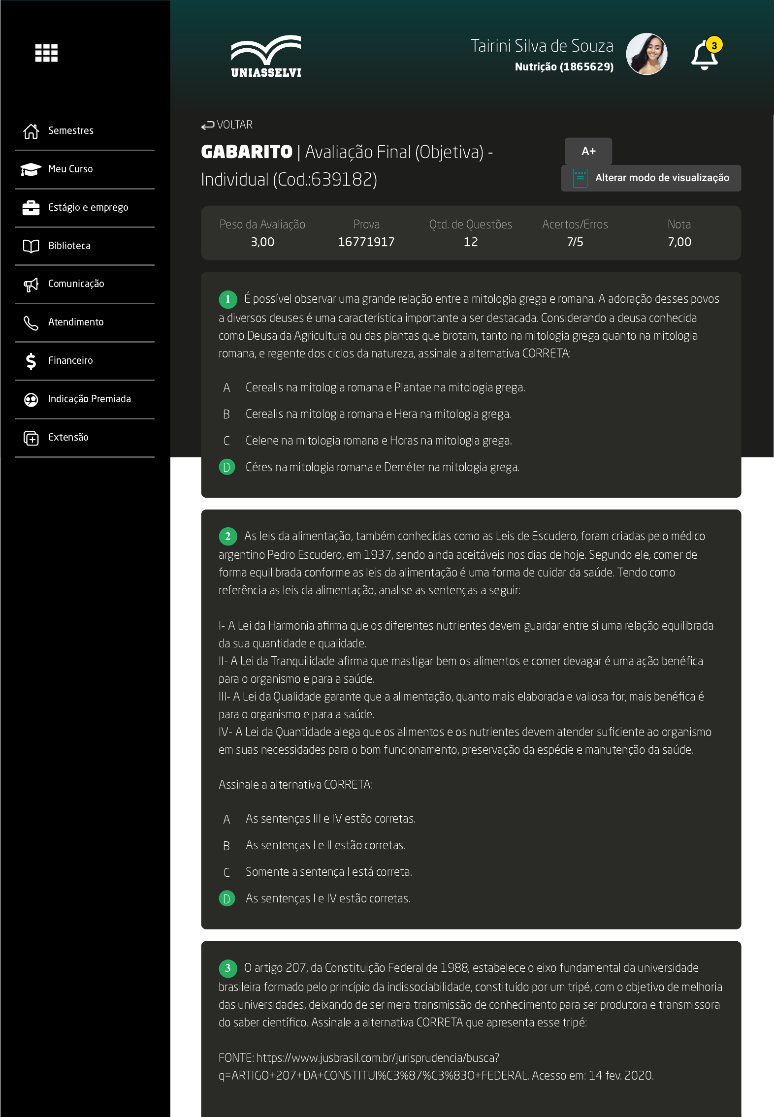 25/09/2023, 22:10 AVA https://ava2.uniasselvi.com.br/subject/grades-and-tests/answer-book/eyJ0ZXN0Ijp7InRlc3RDb2RlIjoiNjM5MTgyIiwiZGVzY3JpcHRpb24iOiJBdmFsaWHDp8OjbyBGaW5hbCAoT2JqZXRpdmEpIC0gSW5kaXZpZHVhb… 1/5 GABARITO | Avaliação Final (Objetiva) - Individual (Cod.:639182) Peso da Avaliação 3,00 Prova 16771917 Qtd. de Questões 12 Acertos/Erros 7/5 Nota 7,00 É possível observar uma grande relação entre a mitologia grega e romana. A adoração desses povos a diversos deuses é uma característica importante a ser destacada. Considerando a deusa conhecida como Deusa da Agricultura ou das plantas que brotam, tanto na mitologia grega quanto na mitologia romana, e regente dos ciclos da natureza, assinale a alternativa CORRETA: A Cerealis na mitologia romana e Plantae na mitologia grega. B Cerealis na mitologia romana e Hera na mitologia grega. C Celene na mitologia romana e Horas na mitologia grega. D Céres na mitologia romana e Deméter na mitologia grega. As leis da alimentação, também conhecidas como as Leis de Escudero, foram criadas pelo médico argentino Pedro Escudero, em 1937, sendo ainda aceitáveis nos dias de hoje. Segundo ele, comer de forma equilibrada conforme as leis da alimentação é uma forma de cuidar da saúde. Tendo como referência as leis da alimentação, analise as sentenças a seguir: I- A Lei da Harmonia afirma que os diferentes nutrientes devem guardar entre si uma relação equilibrada da sua quantidade e qualidade. II- A Lei da Tranquilidade afirma que mastigar bem os alimentos e comer devagar é uma ação benéfica para o organismo e para a saúde. III- A Lei da Qualidade garante que a alimentação, quanto mais elaborada e valiosa for, mais benéfica é para o organismo e para a saúde. IV- A Lei da Quantidade alega que os alimentos e os nutrientes devem atender suficiente ao organismo em suas necessidades para o bom funcionamento, preservação da espécie e manutenção da saúde. Assinale a alternativa CORRETA: A As sentenças III e IV estão corretas. B As sentenças I e II estão corretas. C Somente a sentença I está correta. D As sentenças I e IV estão corretas. O artigo 207, da Constituição Federal de 1988, estabelece o eixo fundamental da universidade brasileira formado pelo princípio da indissociabilidade, constituído por um tripé, com o objetivo de melhoria das universidades, deixando de ser mera transmissão de conhecimento para ser produtora e transmissora do saber científico. Assinale a alternativa CORRETA que apresenta esse tripé: FONTE: https://www.jusbrasil.com.br/jurisprudencia/busca? q=ARTIGO+207+DA+CONSTITUI%C3%87%C3%83O+FEDERAL. Acesso em: 14 fev. 2020. VOLTAR A+ Alterar modo de visualização 1 2 3 Tairini Silva de Souza Nutrição (1865629) 3 Semestres Meu Curso Estágio e emprego Biblioteca Comunicação Atendimento Financeiro Indicação Premiada Extensão https://ava2.uniasselvi.com.br/home https://ava2.uniasselvi.com.br/my-course https://ava2.uniasselvi.com.br/internships-and-jobs https://ava2.uniasselvi.com.br/communication https://ava2.uniasselvi.com.br/attendance https://ava2.uniasselvi.com.br/financial https://ava2.uniasselvi.com.br/award-indication https://ava2.uniasselvi.com.br/extension 25/09/2023, 22:10 AVA https://ava2.uniasselvi.com.br/subject/grades-and-tests/answer-book/eyJ0ZXN0Ijp7InRlc3RDb2RlIjoiNjM5MTgyIiwiZGVzY3JpcHRpb24iOiJBdmFsaWHDp8OjbyBGaW5hbCAoT2JqZXRpdmEpIC0gSW5kaXZpZHVhb… 2/5 A Ensino, ciência e assistência. B Bacharelado, licenciatura e tecnólogo. C Ensino, pesquisa e extensão. D Educação, atendimento e metodologia. As vitaminas são um grupo de micronutrientes formados por moléculas químicas que podem ser bastante distintas entre si. Elas diferem até mesmo na sua solubilidade nos compartimentos orgânicos, uma vez que temos vitaminas lipossolúveis e hidrossolúveis. As funções das vitaminas no organismo são distintas e sua carência ou excesso estão diretamente ligadas a diversas patologias. Sobre o exposto, classifique V para as sentenças verdadeiras e F para as falsas: ( ) A vitamina A é essencial para a manutenção e integridade dos tecidos e epitélios. Quando a vitamina A é ingerida em excesso, ela é excretada pela urina, pois é hidrossolúvel. ( ) A vitamina E é considerada um ótimo antioxidante, podendo ser obtida de óleos vegetais e sementes oleaginosas. É uma vitamina lipossolúvel e sua função é proteger as membranas celulares. ( ) As vitaminas do complexo B são amplamente encontradas em frutas, vegetais e hortaliças. Por serem lipossolúveis, devem ser consumidas com alimentos ricos em gordura poli-insaturadas. ( ) A vitamina C é um potente antioxidante, combatendo o excesso de radicais livres, atuando na produção e manutenção do colágeno e na absorção do ferro não heme. Assinale a alternativa que apresenta a sequência CORRETA: A V - F - V - F. B V - V - F - V. C F - V - F - V. D F - V - V - F. Observamos a evolução do consumo de alimentos industrializados, da alimentação fora do domicílio, a preferência pelos supermercados para a compra dos alimentos, a busca de praticidade, de economia de tempo e na evolução dos hábitos alimentares (GARCIA; FERNANDES, 2011). Sobre o exposto, avalie as asserções a seguir e a relação proposta entre elas: I- Uma das consequências da Revolução Industrial na saúde humana se deu sobre a alteração do perfil lipídico, resultado do aumento do consumo de óleos e gorduras por meio de frituras. PORQUE II- Houve maior consumo de óleos vegetais, ricos em ácidos graxos ômega 6, causando um desequilíbrio na relação com o ômega 3, visto que ambos competem pela mesma enzima para metabolizar no corpo humano. Assinale a alternativa CORRETA: FONTE: GARCIA, Monic Macedo Alves; FERNANDES, Marilne Thomazello Mendes. A revolução alimentar: da cozinha aos fast foods. In: XIV Encontro latino americano de iniciação científica e X Encontro latino americano de pós-graduação, 2011, São José 