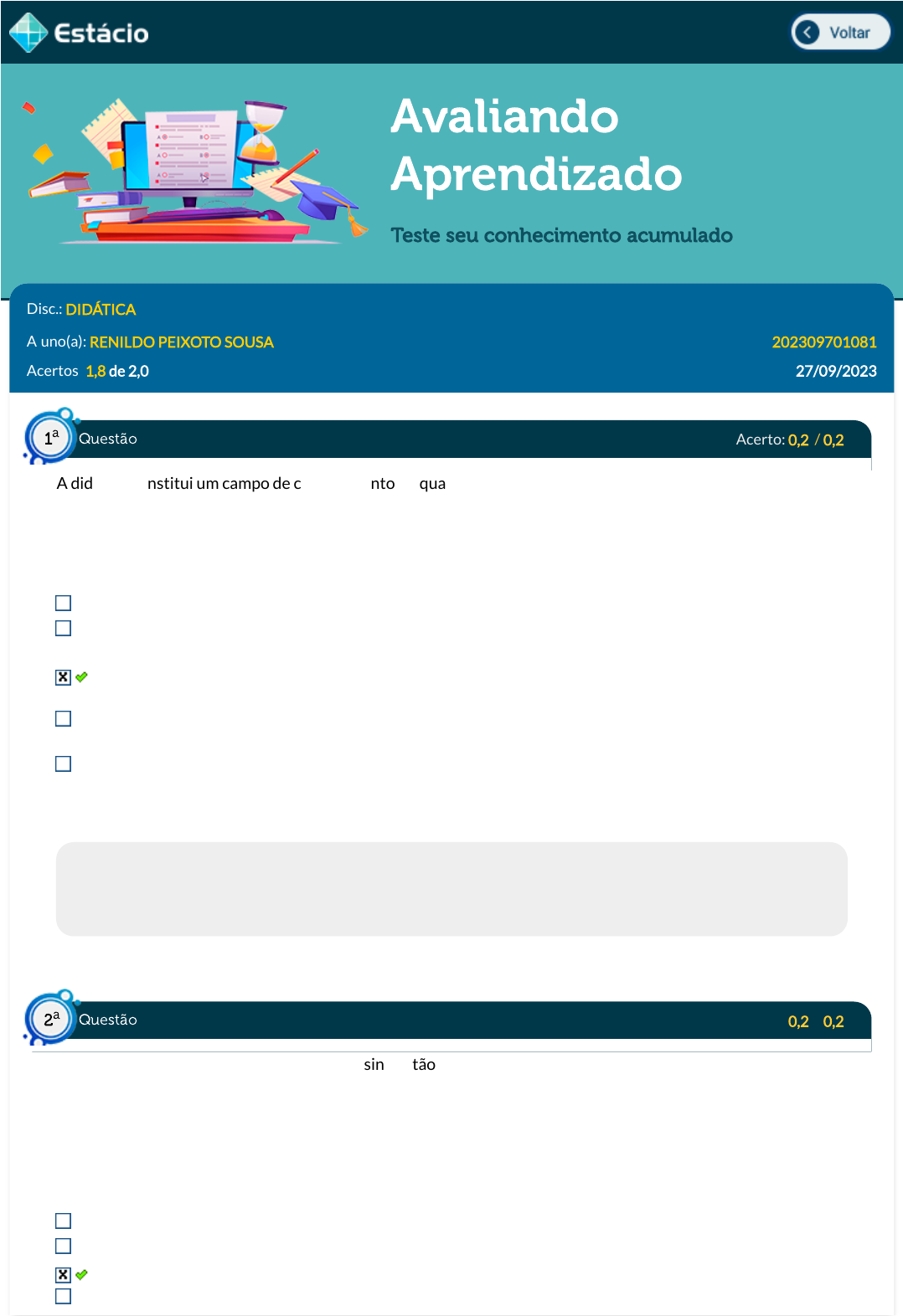 27/09/2023, 20:57 Estácio: Alunos https://simulado.estacio.br/alunos/ 1/6 Avaliando Aprendizado Teste seu conhecimento acumulado Disc.: DIDÁTICA Aluno(a): RENILDO PEIXOTO SOUSA 202309701081 Acertos: 1,8 de 2,0 27/09/2023 Acerto: 0,2 / 0,2 A didática constitui um campo de conhecimento no qual está inserida a atividade pro�ssional do professor. Nesse sentido, alguns princípios didáticos que podem ser listados são: o objetivo da aula, as estratégias metodológicas adotadas pelo professor, os objetos de conhecimento selecionados e sua adequação com as características individuais dos estudantes e da turma, os instrumentos avaliativos e sua aplicação de maneira coesa. Nesse sentido, considerando os princípios da didática assinale a alternativa que julgar verdadeira. Os instrumentos avaliativos são medidas classi�catórias e não podem ser �exibilizados. É importante que o professor mantenha o foco no objetivo da sua aula independente dos objetivos estabelecidos pela instituição. Os objetivos da aula devem estar alinhados aos objetivos da escola, a �m de garantir uma formação conjunta. Os objetos de conhecimento são selecionados pelo professor independente das características indivuais da turma. Os alunos precisam se adequar as estratégias metodológicas aplicadas pelo professor. Respondido em 27/09/2023 20:14:02 Explicação: O aluno, o professor e a escola precisam estar alinhados didaticamente para atingir aos objetivos estabelecidos pelo processo educativo garantido a partir da proposta pedagógica adotada pela instituição de ensino. Acerto: 0,2 / 0,2 Nesta tendência pedagógica, as ações de ensino estão centradas na exposição dos conhecimentos pelo professor. O professor assume funções como vigiar e aconselhar os alunos, corrigir e ensinar a matéria. É visto como a autoridade máxima, um organizador dos conteúdos e estratégias de ensino e, portanto, o único responsável e condutor do processo educativo. PEREIRA, A. L. DE F. As tendências pedagógicas e a prática educativa nas ciências da saúde. Cadernos de Saúde Pública, v. 19, n. 5, p. 1527¿1534, out. 2003. Esta de�nição corresponde a qual tendência pedagógica? Crítico-Social dos conteúdos. Tecnicista. Tradicional. Libertadora. Questão1 a Questão2 a https://simulado.estacio.br/alunos/inicio.asp https://simulado.estacio.br/alunos/inicio.asp javascript:voltar(); javascript:voltar(); 27/09/2023, 20:57 Estácio: Alunos https://simulado.estacio.br/alunos/ 2/6 Renovadora. Respondido em 27/09/2023 20:50:32 Explicação: Nesta abordagem, o professor é a autoridade em sala de aula, pois é ele quem domina o conhecimento cientí�co. Ele deve valorizar a disciplina e estabelecer uma relação de respeito perante os alunos. Os conteúdos são os conhecimentos enciclopédicos, aqueles acumulados pela sociedade, que possuem valor intelectual. Os métodos são expositivos, focam na comunicação oral do conteúdo e na demonstração feitas pelo professor. Os exercícios de repetição são valorizados, pois permitem que o aluno memorize os conceitos e as fórmulas. A aprendizagem é receptiva e mecânica, o aluno deve seguir todos os passos estabelecidos pelo professor para assimilar o conteúdo. Por isso, são usados exercícios de repetição para garantir que o aluno aprendeu a matéria. A avaliação é feita por meio de provas orais e escritas, testes e exercícios para casa, com o objetivo de metri�car o conhecimento. Acerto: 0,2 / 0,2 Originada em teorias do campo da psicologia, o objetivo desta abordagem é a análise do comportamento considerando-o como resultado de in�uências sociais. Segundo esta abordagem é possível moldar o sujeito, recorrendo a estratégias de estímulos e respostas. Marque a alternativa que apresenta a teoria de�nida no trecho acima. Construtivista. Behaviorista. Cognitivista. Signi�cativa. Sociointeracionista. Respondido em 27/09/2023 20:14:28 Explicação: O nome Behaviorismo tem origem no termo em inglês Behavior, que signi�ca comportamento. O Behaviorismo, também chamado de Comportamentismo ou Comportamentalismo, tem como objeto de estudo o comportamento. Originada em estudos feitos no campo da Psicologia, essa corrente de pensamento compreende e de�ne o comportamento humano como o resultado de in�uências sociais. Segundo a teoria behavorista, o sujeito pode ser moldado de acordo com estímulos e respostas. Acerto: 0,2 / 0,2 Sabemos que quando transformamos os conceitos cientí�cos necessários para o aprendizado escolar e trabalhamos de forma que eles passem a ter signi�cado para o aluno, chamamos esse processo de Transposição Didática. Mas para compreendermos melhor o conceito devemos dar atenção às a�rmativas abaixo: I - Somos todos docentes-discentes-docentes-docentes. Ou seja, em uma sala de aula, estamos o tempo todo aprendendo e ensinando. II - O fato do professor ser geralmente mais velho, e ser mais experiente, não signi�ca que ele terá carga de conhecimento diferente dos alunos. III - Quanto mais os alunos trazem para a sala de aula suas experiências, mais rica pode ser a aula, quando o docente consegue aproveitar tais experiências. Das a�rmativas acima: Somente I é verdadeira. II e III são verdadeiras. Questão3 a Questão4 a 27/09/2023, 20:57 Estácio: Alunos https://simulado.estacio.br/alunos/ 3/6 Somente III é falsa. I e II são falsas. Somente II é falsa. Respondido em 27/09/2023 20:16:25 Explicação: A resposta correta é: Somente II é falsa. Acerto: 0,2 / 0,2 Philippe Perrenoud é um dos autores que marcam o período de transição da Educação do �m do século XX para o início do século XXI. Em sua obra Dez novas competência para ensinar, mostra uma preocupação especí�ca com a formação docente e, consequentemente, com a aprendizagem. Considerando esse aspecto, assinale a alternativa que não apresenta uma dessas competências. Substituir novas tecnologias pela ética Participa