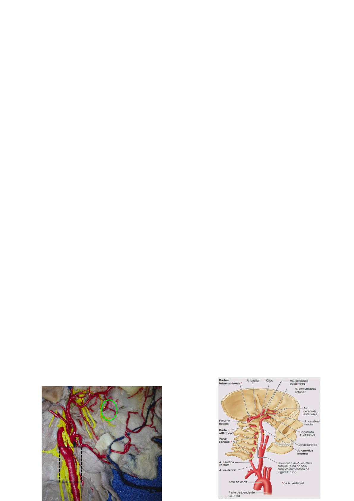 Circulatório da cabeça e do pescoço Linfático e veia são sistemas de drenagem, trazendo sangue dos tecidos e não apenas sangue venoso, mas também a linfa e artéria são sistemas de irrigação conduzindo sangue para os tecidos. Muito difícil dissecar vasos linfáticos é preciso pegar peças anatômicas diferentes que não foram formalizadas, mas é fácil de dissecar os linfonodos Amarelo = nervos Vermelho = Artérias Azul = veias Verde = Vasos linfáticos Ossos, músculos, vísceras, glândulas, sendo todos irrigados por artérias e sendo drenados por veias e vasos linfáticos. Sendo assim, é possível perceber o quanto o corpo humano é integrado. Principais artérias É necessário estudar, uma vez que podem acontecer hemorragias, é preciso para que saiba como estancar fazendo uma sutura, saber fazer uma ligadura para amarrar o vaso, anastomoses (ligações entre vasos), onde está cada vaso para fazer cirurgias, acessos cirúrgicos, pulções, estudar imagens, entre outros fatores. A importância para áreas de cirurgia de cabeça e pescoço C i r u r g i a c a b e ç a e p e s c o ç o , otorrinolaringologia, plástica, traumatologia e ortopedia da face, neurologia e neurocirurgia, cirurgia bucomaxilofacial, harmonização orofacial, entre outras áreas. É necessário compreender que vasos pequenos e considerados sem importância por muitos profissionais, estão tubulados a vasos calibrosos e com muita pressão Exemplo Essa artéria circulada em verde é alvolar superior posterior quando chega na maxila é muito pequena, mas ela vem da maxilar que já é mais calibrosa, a qual vem da carótida externa que é ainda mais calibrosa que por sua vez é oriunda da carótida comum que é bem calibrosa a qual vem do tronco braçocefálico (direito) ou do arco da aorta (esquerdo). Quando o sangue sai pela artéria ele possui uma pressão e ao chegar na periferia, essa pressão chega com base na pressão arterial, podendo compreender que o sistema circulatório é um sistema fechado. Artérias Necessário saber onde localizá-las para não pegar um vaso calibroso e evitar incisões e hemorragias. Caso o paciente chegue com uma hemorragia é necessário saber como fazer uma ligadura, hemostasia. Além de ter que saber como afastar esse vaso. Troncos principais Carótida comum = restrita à região do pescoço. A divisão da carótida comum começa na margem superior da cartilagem tireóide se dividindo em externa e interna Carótida externa = região externa da face. Fica no trígono carotídeo, o qual é delimitado pelo omo-hióideo, esternocleidomastóideo e digástrico Carótida interna = sai da carótida comum e entra na parte petrosa do osso temporal indo para o endocrâncio Vertebral = sai da subclávia e sobe pelos forames transversos das vértebras cervicais penetrando no forame magno, importante por conduzir sangue para a região posterior do endocrânio. Anastomoses Existem várias anastomoses entre as artérias, que são uniões entre vasos que favorece a irrigação diante de bloqueios evitando a necrose. Podem aumentar o sangramento da região quando rompidos em uma região de rica anastomose. Círculo arterial de Willis, que fica debaixo do encéfalo com a ligações das carótidas internas, através das artérias basilar e cerebral posterior. Ramos colaterais e terminais Cada artéria tem seus ramos que são chamados de ramos colaterais e terminais. Ramos colaterais = a artéria segue seu trajeto e emite seus ramos para os lados (posterior, anterior) Ramos terminais = ponto em que as artérias terminam Os ramos terminais podem emitir novamente ramos colaterais e terminar novamente até chegar nas arteríolas Ex: Artéria facial é colateral anterior da carótida externa. Importante ressaltar que os inúmeros vasos da carótida interna e artéria vertebral no interior do crânio são numerosos e qualquer AVC, obstrução, derrame são problemáticos. Nervo hioglosso cruza a divisão das artérias carótidas interna e externa Carótida comum esquerda e subclávia esquerda saem direto do arco aórtico Carótida comum direita e subclávia direita saem do tronco braquiocefálico. Só tem tronco braquiocefálico do lado direito, pois o coração fica desviado para o lado esquerdo, então esse tronco é para permitir uma distância menor do trajeto da carótida comum. Traumas e Lesões no tórax Caso acometa ramos arteriais importantes as hemorragias serão violentas. Relação anatomia muscular da carótida Pescoço possui pouca proteção óssea então qualquer instumento cortante pode lesionar esses vasos. Seio e corpo carotídeo A estrutura nervosa na bifurcação da carótida comum chama-se corpo carotídeo importante para a identificação química do sangue. O abaulamento da parede da carótida interna chama-se seio carotídeo, importante por ajudar no fluxo sanguíneo. Ramos da carótida externa Tireoidea superior Faríngea ascendente Lingual Facial Occipital Auricular posterior Maxilar Temporal superficial Associe os nomes com áreas de irrigação Colaterais anteriores da carótida externa Tireoidea superior Lingual Facial Colaterais posteriores da carótida externa Occipital Auricular posterior Ramo colateral interno da carótida externa Faríngea ascendente Ramos terminais da carótida externa Temporal superficial Maxilar Artéria tireoide Artéria tireoide possui ramos para o osso hioide, laringe e glândula tireoide. Objetivo principal dela é a própria glândula tireoide. Ela possui anastomoses. Ligadura do pedículo superior na artéria tireoide superior Pedículo é o conjunto de vasos e nervos. Os vasos do pedículo superior devem ser ligados individualmente para minimizar o risco de lesão do nervo laríngeo superior, vasos menores podem ser cauterizados com pinça bipolar. Artéria Lingual Acima da tireoide Ela vai para a língua Se divide em lingual profunda (ou ranina) e sublingual = são duas de cada sempre A língua possui uma raiz e um ápice Art