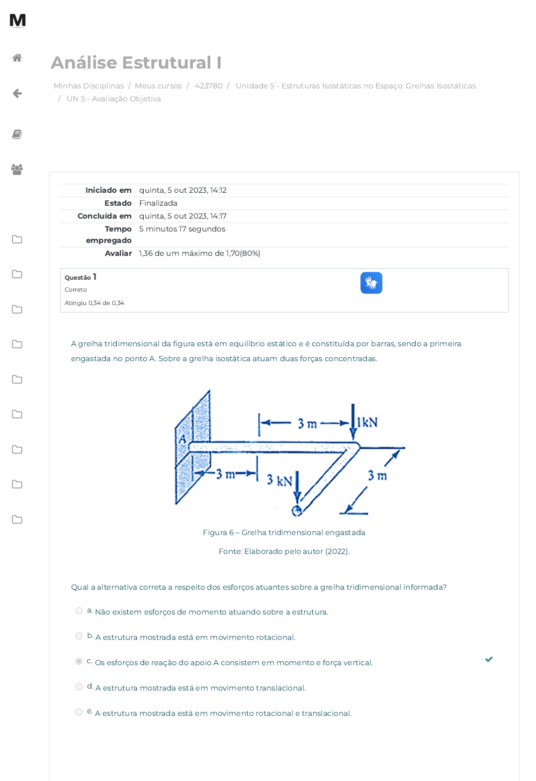 05/10/2023, 14:17 UN 5 - Avaliação Objetiva: Revisão da tentativa https://avap.multivix.edu.br/mod/quiz/review.php?attempt=4028908&cmid=1535581 1/5 Minhas Disciplinas / Meus cursos / 423780 / Unidade 5 - Estruturas Isostáticas no Espaço: Grelhas Isostáticas / UN 5 - Avaliação Objetiva Análise Estrutural I Iniciado em quinta, 5 out 2023, 14:12 Estado Finalizada Concluída em quinta, 5 out 2023, 14:17 Tempo empregado 5 minutos 17 segundos Avaliar 1,36 de um máximo de 1,70(80%) Questão 1 Correto Atingiu 0,34 de 0,34 A grelha tridimensional da �gura está em equilíbrio estático e é constituída por barras, sendo a primeira engastada no ponto A. Sobre a grelha isostática atuam duas forças concentradas. Figura 6 – Grelha tridimensional engastada Fonte: Elaborado pelo autor (2022). Qual a alternativa correta a respeito dos esforços atuantes sobre a grelha tridimensional informada? a. Não existem esforços de momento atuando sobre a estrutura. b. A estrutura mostrada está em movimento rotacional. c. Os esforços de reação do apoio A consistem em momento e força vertical. d. A estrutura mostrada está em movimento translacional. e. A estrutura mostrada está em movimento rotacional e translacional. https://avap.multivix.edu.br/my/ https://avap.multivix.edu.br/course/view.php?id=23921 https://avap.multivix.edu.br/course/view.php?id=23921§ion=6 https://avap.multivix.edu.br/mod/quiz/view.php?id=1535581 https://avap.multivix.edu.br/my/ https://avap.multivix.edu.br/course/view.php?id=23921 https://avap.multivix.edu.br/user/index.php?id=23921 https://avap.multivix.edu.br/course/view.php?id=23921§ion=1 https://avap.multivix.edu.br/course/view.php?id=23921§ion=2 https://avap.multivix.edu.br/course/view.php?id=23921§ion=3 https://avap.multivix.edu.br/course/view.php?id=23921§ion=4 https://avap.multivix.edu.br/course/view.php?id=23921§ion=5 https://avap.multivix.edu.br/course/view.php?id=23921§ion=6 https://avap.multivix.edu.br/course/view.php?id=23921§ion=7 https://avap.multivix.edu.br/course/view.php?id=23921§ion=8 https://avap.multivix.edu.br/course/view.php?id=23921§ion=9 https://avap.multivix.edu.br/course/view.php?id=23921§ion=10 https://avap.multivix.edu.br/ https://avap.multivix.edu.br/ https://avap.multivix.edu.br/ https://avap.multivix.edu.br/ https://avap.multivix.edu.br/ https://avap.multivix.edu.br/ 05/10/2023, 14:17 UN 5 - Avaliação Objetiva: Revisão da tentativa https://avap.multivix.edu.br/mod/quiz/review.php?attempt=4028908&cmid=1535581 2/5 Questão 2 Correto Atingiu 0,34 de 0,34 Uma grelha trata-se de uma estrutura tridimensional, além disso, as forças que atuam na malha não estão no mesmo plano, apesar das barras ou vigas estarem. “Quanto ao equilíbrio estático as grelhas podem ser classi�cadas em: hipostáticas, quando as restrições oferecidas pelos apoios não são insu�cientes para manter a grelha estável. Isostáticas, quando a quantidade de restrições oferecidas pelos apoios para manter a grelha estável são exatamente iguais aos graus de liberdade possíveis da estrutura e hiperestáticas, quando o número de restrições oferecidas pelos apoios é superior aos graus de liberdade possíveis para a grelha.” (LEET et al., 2022, p.68). LEET, Kenneth M.; UANG, Chia M.; GILBERT, Anne M. Fundamentos da Análise Estrutural. Porto Alegre: Grupo A, 2009 Sobre as grelhas tridimensionais é correto a�rmar que: a. A categoria denominada “grelha somente de vigas” direciona-se aos projetos estruturais de pavimentos sem lajes, um exemplo clássico de estrutura com esta classi�cação são as fundações feitas com vigas baldrame. b. O modelo de grelha de lajes nervuradas é direcionado para análise de pavimentos que não possuem nervuras. Alguns exemplos incluídos nesta categoria são as: lajes tipo cogumelos, Lajes convencionais e lisas. c. As grelhas com denominação “lajes planas” possuem aplicação direta em projetos de pavimentos com nervuras. Alguns exemplos incluídos nesta categoria são as: lajes tipo cogumelos, Lajes convencionais e lisas. d. O modelo de grelha somente de vigas é direcionado para análise de pavimentos que possuem nervuras. Alguns exemplos incluídos nesta categoria são as: lajes tipo cogumelos, Lajes convencionais e lisas. e. As grelhas com denominação “somente vigas” possuem aplicação direta em projetos de pavimentos sem nervuras. Alguns exemplos incluídos nesta categoria são as: lajes tipo cogumelos, Lajes convencionais e lisas. https://avap.multivix.edu.br/my/ https://avap.multivix.edu.br/course/view.php?id=23921 https://avap.multivix.edu.br/user/index.php?id=23921 https://avap.multivix.edu.br/course/view.php?id=23921§ion=1 https://avap.multivix.edu.br/course/view.php?id=23921§ion=2 https://avap.multivix.edu.br/course/view.php?id=23921§ion=3 https://avap.multivix.edu.br/course/view.php?id=23921§ion=4 https://avap.multivix.edu.br/course/view.php?id=23921§ion=5 https://avap.multivix.edu.br/course/view.php?id=23921§ion=6 https://avap.multivix.edu.br/course/view.php?id=23921§ion=7 https://avap.multivix.edu.br/course/view.php?id=23921§ion=8 https://avap.multivix.edu.br/course/view.php?id=23921§ion=9 https://avap.multivix.edu.br/course/view.php?id=23921§ion=10 https://avap.multivix.edu.br/ https://avap.multivix.edu.br/ https://avap.multivix.edu.br/ https://avap.multivix.edu.br/ https://avap.multivix.edu.br/ https://avap.multivix.edu.br/ 05/10/2023, 14:17 UN 5 - Avaliação Objetiva: Revisão da tentativa https://avap.multivix.edu.br/mod/quiz/review.php?attempt=4028908&cmid=1535581 3/5 Questão 3 Incorreto Atingiu 0,00 de 0,34 A �gura apresenta um esquema de uma grelha tridimensional com dois carregamentos externos. Uma carga distribuída de 1000 N/m ao longo de um trecho de 5 metros e uma carga concentrada de 1000 N. Figura 3 – Grelha tridimensional engastada Fonte: Elaborada pelo autor (2022). É correto a�rmar que a força de reação vertical A devido ao apoio A ter