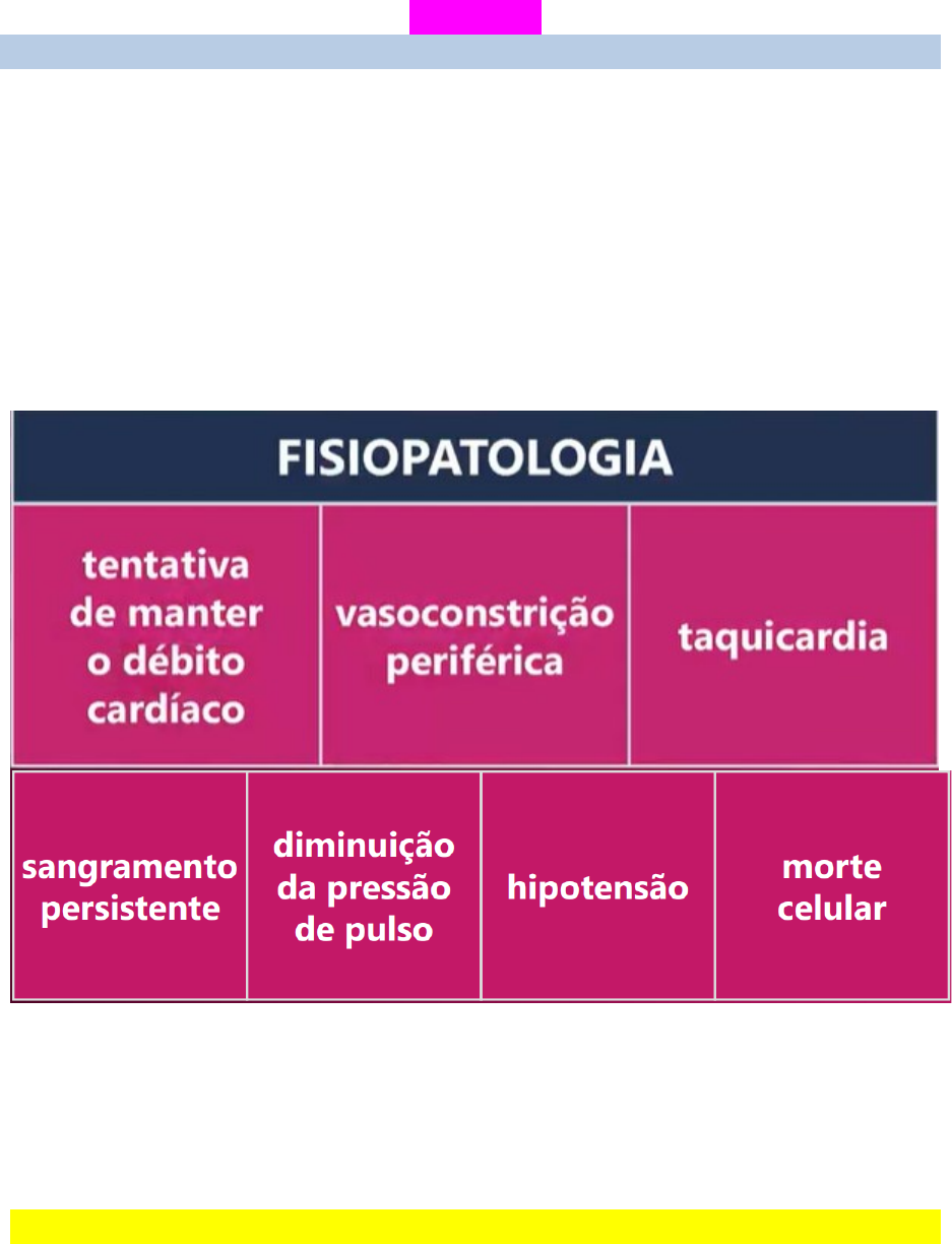 CHOQUE CHOQUE ≠ HIPOTENSÃO Choque – má perfusão tecidual; Liberação deficiente de O₂ para a mitocôndria; Aumento do metabolismo anaeróbico; Aumento de ácido lático; Morte celular – insuficiência do órgão -> morte do órgão -> morte do dono do órgão. O QUE É CHOQUE? Choque é caracterizado por um quadro de hipoperfusão tecidual sistêmico agudo devido a uma incapacidade do sistema circulatório em atender às demandas metabólicas, levando à disfunções orgânicas. HIPOPERFUSÃO SISTÊMICA AGUDA · Incapacidade do sistema circulatório e demandas + · Metabólicas: distúrbios celulares graves, hipóxia tecidual, disfunção de múltiplos órgãos e morte. Ta sangrando? Aumenta a resistencia vascula periférica= aumenta a pressão diastólica= diminui a pressão de pulso (120x110). EPIDEMIOLOGIA Melhorou bastante no Brasil, mas ainda não é visto como país desenvolvido. Varia entre as instituições, com mortalidade entre 40-50%. Na África, 60-70%, os EUA lutam para alcançar os 30%. - Conseguir identificar precocemente o choque! OFERTA VS. CONSUMO DE O2 DO2 : oferta de oxigênio; VO2 : consumo de oxigênio; TEO2 : taxa de extração de oxigênio; SvO2 : saturação venosa mista de oxigênio; Gap CO2 : gradiente de pressão parcial de gás carbônico da mucosa gástrica. MECANISMOS Depleção do volume vascular (hipovolêmico); Compressão do coração e grandes vasos (obstrutivo); -Tamponamento cardíaco, pneumotórax hipertensivo; Falha da bomba (cardiogênico); Perda do controle autonômico/ simpático (neurogênico); Paciente tetraplégico, com lesão medular superior, pode ficar bradicárdico ou com FC normal, mesmo estando em choque, porque ele perde o controle autonômico, diminuindo a RVP, e por isso ficando com PA baixa! CUIDADO! Pode ter choque hipovolêmico associado! Simula choque; -Reflexo vagal (distensao abdominal, bexigoma); Resposta inflamatória sistêmica grave por infecção (séptico); Rarissímo. ( C h r i s t ia n e N o vai s - 6 º s e m e s t r e m e d i c i n a ) CONCEITOS IMPORTANTES PA = DC x RVS DC = VS x FC (volume sistólico cai, aumenta a FC para compensar e manter o DC e, consequentemente, a PA). O VS depende da pré e pós carga. DO2 (oferta de O2) = CaO2 x DC x 10. Difusão pulmão- circulação? Transporte para a periferia (DC)? Difusão para mitocôndria (pH- acidose)? Ligação O2- Hemoglobina. VO2 – consumo de oxigênio. SvCO2 (saturação venosa central) e SvO2 (saturação venosa mista) GRÁFICO TRIMODAL DO TRAUMA 1ª momento (0-15 minutos)- devido ao trauma (50%)- PREVENÇÃO; 2ª momento (primeiros minutos até 24 horas)- Potencial de cura. Insuficiência respiratória/ trauma abdominal, torácico e tratamento adequado na hora de ouro (1ª hora)= evitar muitas mortes! (30%) 3ª momento (após 24 horas)- complicações do trauma. TEP, infecções... (20%). Uma boa medicina, alta o mais breve possível. Frequência cardíaca considerada taquicardia: PARAMÊTROS CLÍNICOS Diurese, taquicardia, perfusão periférica, hipotensão e consciência! Dedo com a falange distal dobrada, apertar por 12 segundos e esperar 5 segundos. HEMORRAGIA EXTERNA Compressão e empacotamento! Ligadura (nunca as cegas); Torniquete <1 hora: isquemia da extremidade! 10 MANDAMENTOS Providenciarás acesso venoso periférico; Colherás sangue para exame e tipagem sanguínea; Infudirás apenas 1000 ml de ringer lactato; Prescreverás ácido tranexâmico 1g nas primeiras 3 horas; Classificarás o choque; Iniciarás hemoderivados conforme a classificação; Procurarás o foco do sangramento; Reavaliarás a resposta hemodinâmica; Medirás o débito urinário; Fecharás a torneira se estiver aberta; E SE NÃO CONSEGUIR ACESSO VENOSO PERIFÉRICO? Punção intraósseo! Punção tibial- crianças e adultos! 2 dedos abaixo e medial a crista/ espinha tibial onde vem o tendão patelar. Em adultos pode usar a punção intraóssea umeral (abaixo da cabeça do úmero/ articulação com a clavícula); Veio medula/ sangue pode fazer tudo nele. CLASSIFICAÇÃO DO CHOQUE REPOSIÇÃO DE SANGUE – DERIVADOS -> Concentrado de hemácias Indicada – perda estimada acima de 30%; Choque classe III – sangue tipo específico com prova cruzada (se hipotenso, faz sangue); Choque classe IV – sangue; - Rh negativo se mulheres em idade fértil (se homens, O+) e hemoderivados; MARCADORES CLÍNICOS DO ESTADO DE CHOQUE A – Hipotensão Pouco sensível (porém específico) de choque; PAS < 90 mmHg = CHOQUE; Hipotensão postural – queda de 10 mmHg por período superior a 30 segundos ao adquirir posição supina; B – Pressão diferencial (pressão de pulso) Diferença entre diastólica < 20 mmHg – choque; C – Taquicardia/bradicardia e taquipneia Taquicardia – manifestação evidente (atletas, marca-passo, medicamentos); Taquipneia – compensar a acidose- expulsar o CO2; D – Hipoperfusão cutânea Descarga adrenérgica e vasoconstrição; E – Alteração do nível de consciência Fluxo cerebral inadequado – distúrbios do sensório (sensível, porém não específico); Politraumatizados – álcool, drogas podem confundir; F – Oligúria Mais sensível e específico dos sinais de choque; G – Isquemia miocárdica Choque – sinais ECG de isquemia – problemas primários ou secundários; H – Acidose metabólica Aumento da frequência respiratória e redução do excesso de base; DIAGNÓSTICO – CHOQUE HIPOVOLÊMICO Taquicardia e vasoconstrição; Pele fria e diaforética; Redução do débito urinário; Taquipneia; Alteração dos níveis de consciência; Perda >40% da volemia; RESPOSTA À REPOSIÇÃO VOLÊMICA NÃO ESQUEÇA Líquidos infundidos em temperatura entre 37º-39ºC Hipotermia= impacto sobre coagulopatia, função plaquetária, vasorregulação e condução cardíaca; Aquecimento de soluções- menores calafrios; Pós- operatórios; INDICAÇAO DA REPOSIÇÃO VOLÊMICA Otimizar a oferta de oxigênio com a melhora da pré-carga (volume); Tratamen