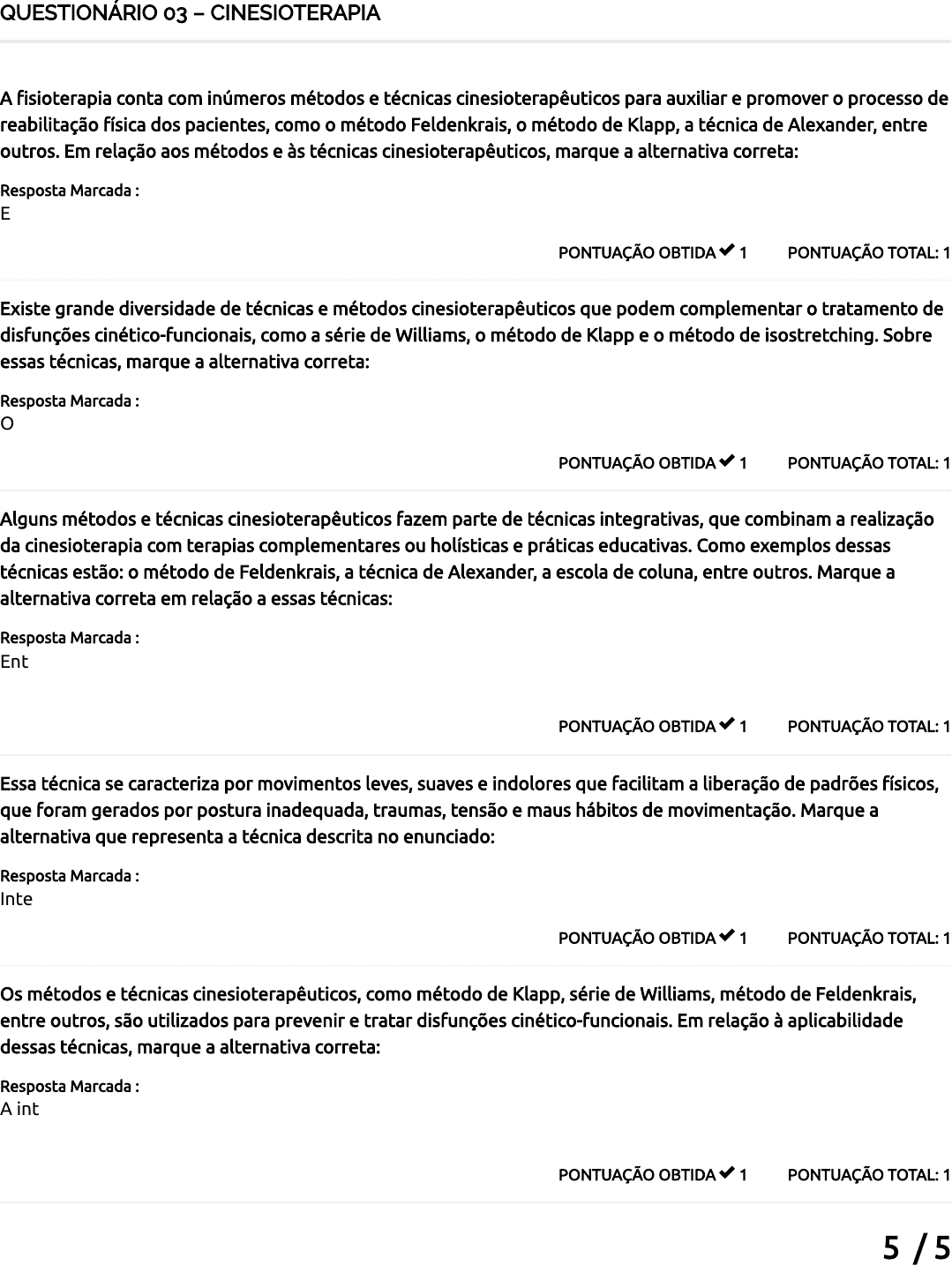 5 / 5 QUESTIONÁRIO 03 – CINESIOTERAPIA PONTUAÇÃO TOTAL: 1PONTUAÇÃO OBTIDA 1 A �sioterapia conta com inúmeros métodos e técnicas cinesioterapêuticos para auxiliar e promover o processo de reabilitação física dos pacientes, como o método Feldenkrais, o método de Klapp, a técnica de Alexander, entre outros. Em relação aos métodos e às técnicas cinesioterapêuticos, marque a alternativa correta: Resposta Marcada : Entre os objetivos desses métodos estão a redução da dor e a melhora da força e da �exibilidade muscular. PONTUAÇÃO TOTAL: 1PONTUAÇÃO OBTIDA 1 Existe grande diversidade de técnicas e métodos cinesioterapêuticos que podem complementar o tratamento de disfunções cinético-funcionais, como a série de Williams, o método de Klapp e o método de isostretching. Sobre essas técnicas, marque a alternativa correta: Resposta Marcada : O método de Klapp foi desenvolvido para tratar a escoliose, que é uma alteração postural. PONTUAÇÃO TOTAL: 1PONTUAÇÃO OBTIDA 1 Alguns métodos e técnicas cinesioterapêuticos fazem parte de técnicas integrativas, que combinam a realização da cinesioterapia com terapias complementares ou holísticas e práticas educativas. Como exemplos dessas técnicas estão: o método de Feldenkrais, a técnica de Alexander, a escola de coluna, entre outros. Marque a alternativa correta em relação a essas técnicas: Resposta Marcada : Entre os objetivos da técnica de Alexander está a redução das tensões excessivas por meio de técnicas respiratórias e posturais. PONTUAÇÃO TOTAL: 1PONTUAÇÃO OBTIDA 1 Essa técnica se caracteriza por movimentos leves, suaves e indolores que facilitam a liberação de padrões físicos, que foram gerados por postura inadequada, traumas, tensão e maus hábitos de movimentação. Marque a alternativa que representa a técnica descrita no enunciado: Resposta Marcada : Integração psicofísica de Trager. PONTUAÇÃO TOTAL: 1PONTUAÇÃO OBTIDA 1 Os métodos e técnicas cinesioterapêuticos, como método de Klapp, série de Williams, método de Feldenkrais, entre outros, são utilizados para prevenir e tratar disfunções cinético-funcionais. Em relação à aplicabilidade dessas técnicas, marque a alternativa correta: Resposta Marcada : A integração psicofísica de Trager pode ser aplicada em casos de paralisia cerebral, disfunção espinal, dor espinal crônica e artrite. Total de Pontos
