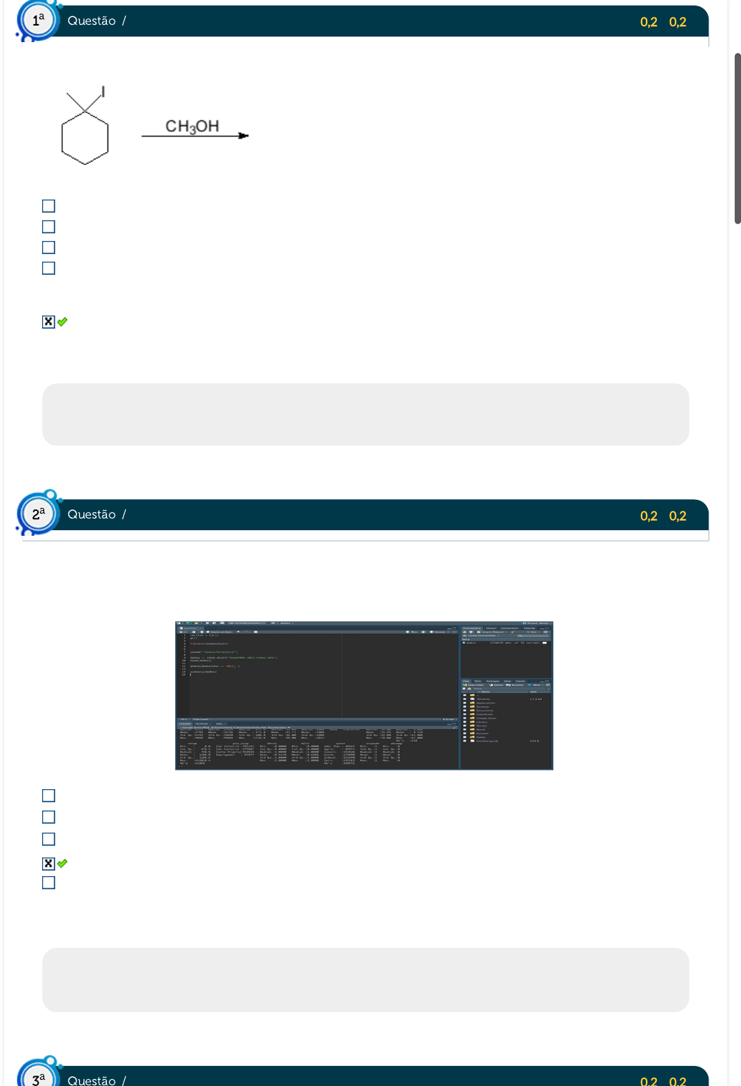 20/11/2023, 11:20 Estácio: Alunos https://simulado.estacio.br/alunos/ 1/1 Acerto: 0,2 / 0,2 Observe a reação abaixo e assinale a alternativa correta: A presença do Iodeto terciário favorece a SN2. A reação ocorrerá tanto para substituição nucleofílica quanto para eliminação. A presença do nucleó�lo forte favorece a SN2. A reação é uma solvólise e o mecanismo favorecido é o SN2. A reação é uma solvólise e o mecanismo favorecido é o SN1. Respondido em 04/10/2023 20:53:44 Explicação: A resposta correta é: A reação é uma solvólise e o mecanismo favorecido é o SN1. Acerto: 0,2 / 0,2 Considerando os dois compostos aromáticos a seguir, a nomenclatura correta destes é, respectivamente: 4-metil-1,3,5-trinitrobenzeno e 6-amino-5-cloro-etilbenzeno 2,4-6-trinitro-metilbenzeno e 2-cloro-6-etil-aminobenzeno 2,4-6-trinitro-metilbenzeno e 2-cloro-6-etil-aminobenzeno 2-metil-1,3,5-trinitrobenzeno e 2-amino-3-etil-clorobenzeno 2-metil-1,3,5-trinitrobenzeno e 6-amino-5-cloro-etilbenzeno Respondido em 04/10/2023 20:54:17 Explicação: A resposta correta é: 2-metil-1,3,5-trinitrobenzeno e 2-amino-3-etil-clorobenzeno Acerto: 0,2 / 0,2 Questão / 1 a Questão / 2 a Questão / 3 a 20/11/2023, 11:20 Estácio: Alunos https://simulado.estacio.br/alunos/ 1/1 Acerto: 0,2 / 0,2 Grupos acetais são extremamente importantes na síntese orgânica por permitirem a proteção de aldeídos e cetonas de reações indesejadas. Um aluno de doutorado, querendo proteger um grupo cetona de uma reação de redução, reagiu o 3-oxobutanoato de metila com o metanol utilizando catálise ácida para formar um acetal, conforme o esquema abaixo: Qual das estruturas abaixo representa o acetal A formado nesta reação? Respondido em 04/10/2023 20:55:58 Explicação: Resposta correta é: D. Questão / 3 a 20/11/2023, 11:20 Estácio: Alunos https://simulado.estacio.br/alunos/ 1/1 Acerto: 0,2 / 0,2 O composto abaixo pode ser encontrado nas abelhas, formigas, urtigas e alguns frutos com a �nalidade de ataque e defesa. A função química e o nome o�cial IUPAC desse composto, respectivamente, são: Ácido carboxílico; ácido metanóico. Éster; éster etílico. Éster; éster metílico. Cloreto de ácido; cloreto de metanoíla. Ácido carboxílico; metanal. Respondido em 04/10/2023 20:56:26 Explicação: A resposta correta é: Ácido carboxílico; ácido metanóico. Acerto: 0,0 / 0,2 A síntese de ésteres é uma reação química amplamente utilizada na indústria e em laboratórios, sendo de grande importância para a produção de fragrâncias, sabores, solventes e outros compostos químicos. Sobre a síntese de ésteres, analise as asserções I e II. I - A síntese de ésteres, como no éter dietílico, é uma reação de desidratação de álcoois que é catalisada pelo ácido sulfúrico. Porque, II - Nessa reação, a desidratação ocorre a uma temperatura maior que 150°C, onde é perdido uma molécula de água e o grupo -OH do álcool reage com o grupo -COOH do ácido, formando uma ligação éster. Marque a alternativa que apresenta a relação correta entre as asserções I e II. A asserção I é verdadeira e a asserção II é falsa. Ambas as asserções são verdadeiras, mas a asserção II não é uma justi�cativa para a asserção I. Ambas as asserções são falsas. A asserção I é falsa e a asserção II é verdadeira. Ambas as asserções são verdadeiras, e a asserção II é uma justi�cativa para a asserção I. Respondido em 04/10/2023 21:02:01 Explicação: O éter dietílico e outros éteres simétricos são preparados industrialmente pela reação de desidratação de álcoois catalisada por ácido sulfúrico. A desidratação ocorre a uma temperatura mais baixa que a desidratação em um alceno (aprox. 140). A formação do éter ocorre por um mecanismo SN2 com uma molécula de álcool agindo como o nucleó�lo e com uma outra molécula protonada de álcool agindo como o substrato. Questão / 4 a Questão / 5 a 20/11/2023, 11:21 Estácio: Alunos https://simulado.estacio.br/alunos/ 1/1 Acerto: 0,2 / 0,2 Considerando a ligação C-X entre um carbono alifático e um halogênio considere as seguintes a�rmativas: I- Devido a maior eletronegatividade dos halogênios em relação ao carbono esta ligação é polarizada. II- A cisão das ligações C-X quando ocorrem com deslocamento desigual dos elétrons é chamada de eletrolítica. III ¿ As quebras de ligação eletrolíticas geram Nucleó�los e Eletró�los. São verdadeiras as a�rmativas: I e II Apenas a a�rmativa III está correta I e III I, II e III estão corretas II e III Respondido em 04/10/2023 20:57:23 Explicação: A resposta correta é: I, II e III estão corretas. Acerto: 0,2 / 0,2 Considerando a reação de nitração a seguir, frente a um substituinte X no benzeno e analisando os produtos formados, podemos a�rmar que: O �uorbenzeno é o mais reativo da série e o mais seletivo para o produto para. Questão / 6 a Questão / 7 a 20/11/2023, 11:21 Estácio: Alunos https://simulado.estacio.br/alunos/ 1/1 Acerto: 0,2 / 0,2 Reações de halogenação alfa à carbonila são extremamente úteis, pois fornecem intermediários para outros tipos de reação. É o caso da bromação alfa, exemplo, no qual o átomo de bromo pode ser perdido na forma de HBr e levar à formação de um composto α,β-insaturados. Um estagiário, interessado em entender melhor essas reações, promoveu uma série de halogenações utilizando tanto catálise ácida quanto catálise básica e variando os halogênios moleculares (Cl2, Br2 e I2). O que ele observou é que a mudança dos halogênios não alterava a velocidade da reação em nenhum dos dois tipos de catálise. Assinale a alternativa que apresenta uma justi�cativa para essa observação: A etapa lenta da reação é a ruptura homolítica da ligação entre os halogênios e a velocidade com que ela acontece é a mesma em todos os casos. Cloro, bromo e iodo em suas 