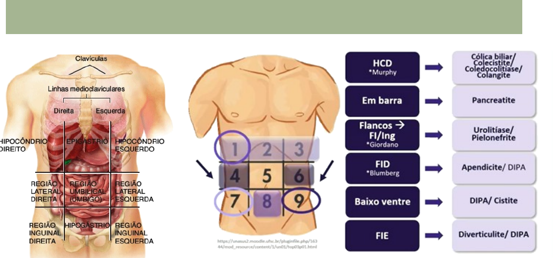 SP2 UC13 Evelin Salvi TXIV Dor Abdominal Aguda citar as principais causas de dor abdominal aguda correlacionando com a topografia abdominal Diferenciar as principais síndromes abdominais agudas Abdome agudo é uma síndrome clínica caracterizada por dor na região abdominal, não traumática, súbita e de intensidade variável associada ou não a outros sintomas e que necessita de diagnóstico e conduta terapêutica imediata, cirúrgica ou não. · Dor visceral – difusa (T6-L1), fibras C, distensão, processo inflamatório e isquêmico · Maciças: pressão · Ocas: cólica · Com ácido: queimação · Dor parietal- dor localizada, intensa, posterior. · Espasmos de musculatura A apendicite é mais comum em jovens, enquanto a doença biliar, obstrução intestinal, isquemia e diverticulite são mais comuns em idosos. IMPORTANTE: A DOR ABD DE TRAUMA NÃO CONTA!! Rotina do abdome agudo · Anamnese · Exame físico · Exames laboratoriais · Hemograma · Exame qualitativo de urina · Amilase · Teste de gravidez para mulheres em idade fértil · Exames de imagem · Avaliação radiológica → radiografia abdominal em “rotina de abdome agudo” (decúbitos dorsal, ortostático, lateral esquerdo e tórax). · Outros exames: ultrassonografia, tomografia computadorizada, ressonância magnética e arteriografia. Classificações A classificação mais utilizada do abdome agudo é de acordo com o seu processo desencadeante: Abdome agudo obstrutivo · Presença de obstáculo mecânico ou funcional que leve a interrupção da progressão do conteúdo intestinal. Gravidade variável e caráter evolutivo necessitando rápida intervenção Associadamente surgem náuseas, vômitos, distensão abdominal, distúrbios eletrolíticos, hipocalemia, hipovolemia, parada da eliminação de flatos e fezes, oligúria, ruídos metálicos, percussão timpânica Classificação · Funcional – peristaltismo, desordens eletrolíticas e metabólicas · Mecânica – tumor, volvo, torção · Alta- acima da válvula ileocecal · Baixa- abaixo da válvula ileocecal · Simples- não há sofrimento de alça, não é tão urgente · Complicada- peritonite, isquemia, iminência de rotura, emergência, laparotomia epidemiologia • Aderência é a causa mais frequente em cx prévia no intestino delgado • Segunda síndrome abdominal aguda mais frequente • Principal obstrução de intestino grosso: câncer de cólon e volvo de sigmoide (torção do sigmoide ao redor da sua fixação) MANIFESTAÇÕES CLÍNICAS • QD variável e dependente do local e tempo de obstrução • Dor: início súbito, em cólica e depois periumbilical • Associação com náuseas, vômitos e parada de eliminação de gases e fezes • Sinais: distensão abdominal no centro da obstrução do intestino e em flancos, ou abdome superior nas obstruções baixas (“em moldura”) • Ruídos metálicos e posteriormente ausentes • Percussão timpânica em todo o abdome • Gasometria alcaloide • Obstrução em alça fechada- válvula ileocecal competente (não deixa contaminar conteúdo fecal- somente entra e não sai) diagnóstico Clínica compatível + RX • RX de tórax em PA • RX de abdome em pé- níveis hidroaéreos escalonados (gás em cima, líquido embaixo) • RX de abdome deitado- empilhamento em moeda (válvulas 360°/ alças de luta) e edema de parede de alça · OBS: no cólon não forma o empilhamento de moeda Tratamento · Se complicada: sinais de peritonite, alça fechada (acima de 12 cm) laparotomia exploratória · Se for brida não complicada, cx prévia TTO clínico com sonda nasogástrica + reavaliação Abdome agudo perfurativo • Ocorre por perfuração de uma víscera oca, NÃO traumático (FACADAS/TIROS NÃO CONTAM, apenas perfurações que acontecem de maneira interna ex: corpo estranho) evoluindo com extravasamento da secreção na cavidade, levando uma inflamação peritoneal química de intensidade variável • Segue com invasão bacteriana e processo infeccioso, levando a peritonite bacteriana com manifestações locais e sistêmicas · A dor em geral é de início súbito e difuso e frequentemente vem associado com choque e septicemia. · Etiologias: decorrente de trauma, processos infecciosos, neoplásicos, inflamatórios, ingestão de corpo estranho, traumatismos, iatrogênicas (ex: doença de Crohn, diverticulites, doença celíaca) Classificação • Ligamento de Treitz: dividem as perfurações em altas e baixas · Altas: peritonite química à proliferação bacteriana à processo infeccioso · Baixa: peritonite infecciosa de região já colonizada, podendo ter septicemia epidemiologia · Principal causa é úlcera péptica Principais no estômago: úlcera gástrica na parede anterior, mais perfurante, associada à ingestão de álcool, corticoides e AINES • No duodeno: úlcera duodenal na parede posterior, associada a eventos hemorrágicos • Principais no restante do ID: progressão de outros processos inflamatórios (diverticulite e apendicite), doença inflamatória intestinal, volvos de ceco e sigmoide, megacólon tóxico, neoplasias e síndrome de Olgivie • Principais no IG: infecção, corpo estranho, divertículo de Meckel, doença inflamatória intestinal, AA obstrutivo com necrose intestinal MANIFESTAÇÕES CLÍNICAS • Dor: súbita, intensa e difusa; pode ser lombar ou irradiar para os ombros • Sinais e sintomas: peritonite, descompressão brusca positiva, abdome em tábua (ponto crítico), distensão abdominal, ausência de ruídos hidroaéreos e evolução rápida • pode ser acompanhada de sinais de sepse, hipotensão ou choque, além de desconforto respiratório · Sinal de Jobert: perda da macicez hepática à percussão do hipocôndrio direito Diagnóstico • RX de tx em PA- pneumoperitôneo (ar na cavidade) • RX de abd em pé • RX de abd deitado Tratamento •Cirúrgico para tratar a perfuração- videolaparoscopia/ laparotomia exploratória ulcerorrafia com pat
