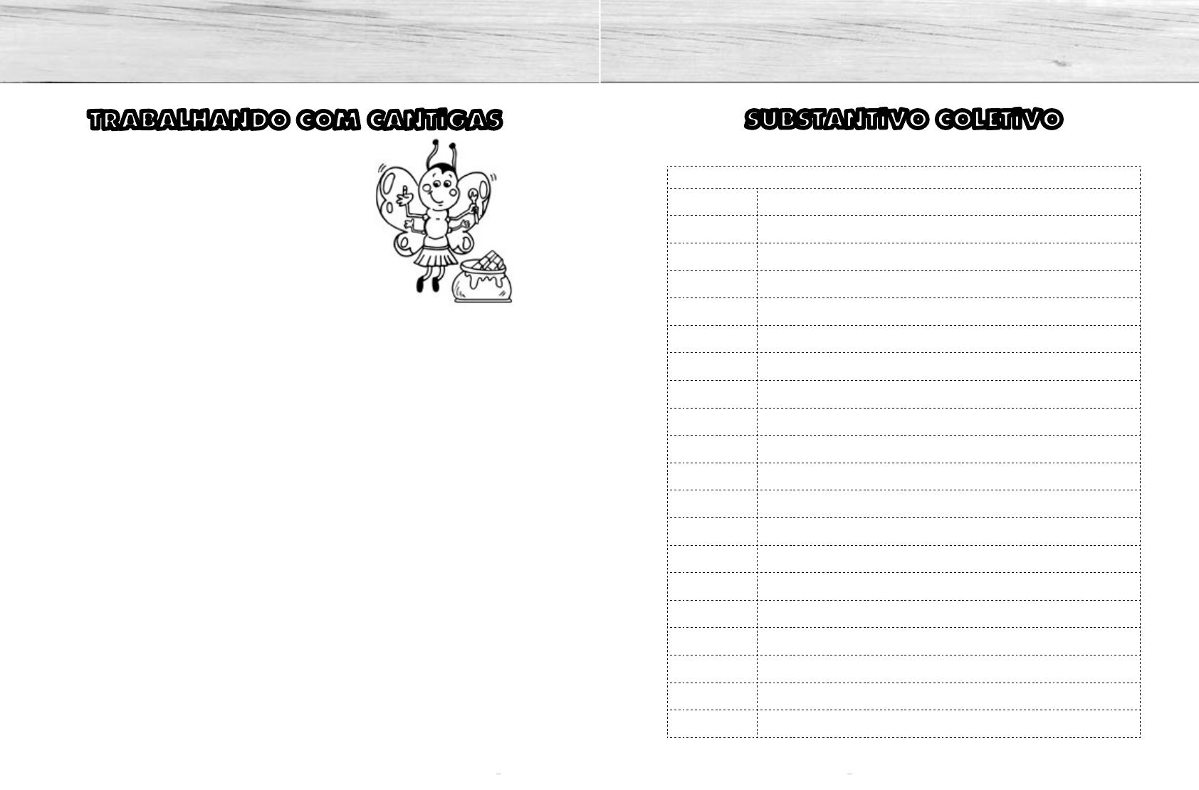 42 43 REFORÇO ESCOLAR – 3O ANO REFORÇO ESCOLAR – 3O ANO SUBSTANTIVO COLETIVO Escreva a que se refere cada substantivo. Coletivo é o nome que expressa um grupo de seres da mesma espécie. Exemplos: acervo obras de arte álbum retratos, autógrafos, selos alcateia antologia armada arquipélago arsenal assembleia atlas baixela banca banda bando bateria biblioteca bosque buquê cacho cáfila cambada TRABALHANDO COM CANTIGAS Escreva a cantiga separando as palavras. Borboletinhatánacozinha fazendochocolateparaamadrinha poti,poti pernadepau olhodevidro enarizdepica-pau(pau) _____________________________________________________________ _____________________________________________________________ _____________________________________________________________ _____________________________________________________________ _____________________________________________________________ _____________________________________________________________ _____________________________________________________________ De acordo com a cantiga, escreva os substantivos comuns. a) Animal invertebrado que voa: __________________________________________ b) Doce feito de cacau: __________________________________________________ c) Membro inferior: _____________________________________________________ d) Órgão responsável pela visão: __________________________________________ e) Órgão responsável pelo olfato: __________________________________________ f) Animal vertebrado que voa e tem topete: _________________________________ lobos textos navios de guerra ilhas armas de parlamentares, de membros de qualquer associação mapas objetos de servir à mesa examinadores músicos pessoas, aves, malfeitores de canhões, de instrumentos de percussão, de perguntas livros árvores flores bananas, uvas camelos desordeiros, malfeitores Borboletinha tá na cozinha fazendo chocolate para a madrinha poti, poti perna de pau olho de vidro e nariz de pica-pau (pau) borboletinha chocolate pica-pau perna olho nariz 44 45 REFORÇO ESCOLAR – 3O ANO REFORÇO ESCOLAR – 3O ANO esquadra esquadrilha exército fardo fato fauna feixe flora floresta fornada frota galeria grupo hemeroteca horda junta júri legião manada matilha miríade molho multidão cancioneiro caravana cardume caterva cavalgada choldra cinemateca clero colégio coletânea colmeia colônia comitiva comunidade congresso constelação cordilheira corja coro discoteca elenco enxame enxoval navios aviões soldados tecidos, papéis, palha, feno cabras animais lenha plantas ou vegetais árvores pães navios objetos de arte pessoas ou coisas jornais e revistas bárbaros, selvagens médicos, examinadores jurados, pessoas que julgam anjos, soldados, demônios elefantes, bois, búfalos cães insetos, estrelas chaves pessoas canções, poemas viajantes, peregrinos peixes desordeiros, malfeitores cavaleiros bandidos, malfeitores filmes sacerdotes eleitores, cardeais textos, canções abelhas imigrantes, bactérias, insetos acompanhantes cidadãos parlamentares, doutores estrelas montanhas ladrões, desordeiros anjos, cantores discos atores abelhas, marimbondos, vespas roupas