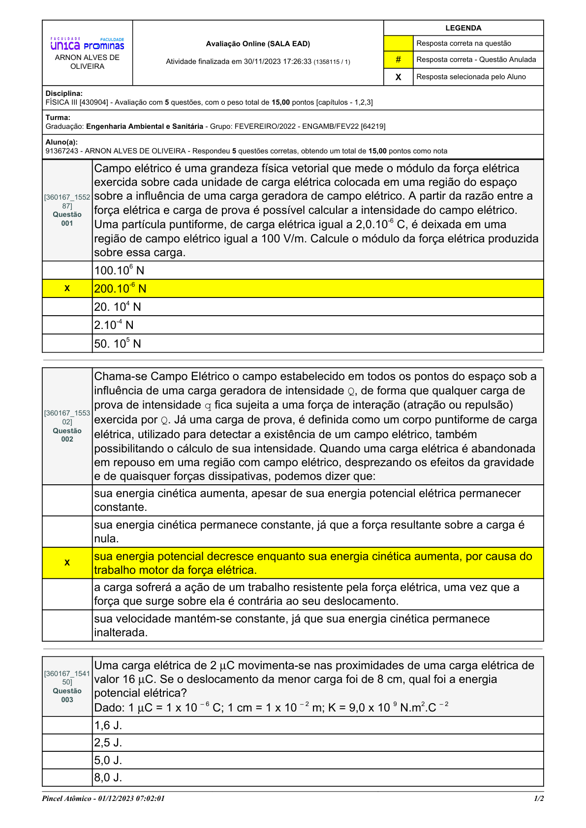 Pincel Atômico - 01/12/2023 07:02:01 1/2 ARNON ALVES DE OLIVEIRA Avaliação Online (SALA EAD) Atividade finalizada em 30/11/2023 17:26:33 (1358115 / 1) LEGENDA Resposta correta na questão # Resposta correta - Questão Anulada X Resposta selecionada pelo Aluno Disciplina: FÍSICA III [430904] - Avaliação com 5 questões, com o peso total de 15,00 pontos [capítulos - 1,2,3] Turma: Graduação: Engenharia Ambiental e Sanitária - Grupo: FEVEREIRO/2022 - ENGAMB/FEV22 [64219] Aluno(a): 91367243 - ARNON ALVES DE OLIVEIRA - Respondeu 5 questões corretas, obtendo um total de 15,00 pontos como nota [360167_1552 87] Questão 001 Campo elétrico é uma grandeza física vetorial que mede o módulo da força elétrica exercida sobre cada unidade de carga elétrica colocada em uma região do espaço sobre a influência de uma carga geradora de campo elétrico. A partir da razão entre a força elétrica e carga de prova é possível calcular a intensidade do campo elétrico. Uma partícula puntiforme, de carga elétrica igual a 2,0.10-6 C, é deixada em uma região de campo elétrico igual a 100 V/m. Calcule o módulo da força elétrica produzida sobre essa carga. 100.106 N X 200.10-6 N 20. 104 N 2.10-4 N 50. 105 N [360167_1553 02] Questão 002 Chama-se Campo Elétrico o campo estabelecido em todos os pontos do espaço sob a influência de uma carga geradora de intensidade Q, de forma que qualquer carga de prova de intensidade q fica sujeita a uma força de interação (atração ou repulsão) exercida por Q. Já uma carga de prova, é definida como um corpo puntiforme de carga elétrica, utilizado para detectar a existência de um campo elétrico, também possibilitando o cálculo de sua intensidade. Quando uma carga elétrica é abandonada em repouso em uma região com campo elétrico, desprezando os efeitos da gravidade e de quaisquer forças dissipativas, podemos dizer que: sua energia cinética aumenta, apesar de sua energia potencial elétrica permanecer constante. sua energia cinética permanece constante, já que a força resultante sobre a carga é nula. X sua energia potencial decresce enquanto sua energia cinética aumenta, por causa do trabalho motor da força elétrica. a carga sofrerá a ação de um trabalho resistente pela força elétrica, uma vez que a força que surge sobre ela é contrária ao seu deslocamento. sua velocidade mantém-se constante, já que sua energia cinética permanece inalterada. [360167_1541 50] Questão 003 Uma carga elétrica de 2 µC movimenta-se nas proximidades de uma carga elétrica de valor 16 µC. Se o deslocamento da menor carga foi de 8 cm, qual foi a energia potencial elétrica? Dado: 1 µC = 1 x 10 – 6 C; 1 cm = 1 x 10 – 2 m; K = 9,0 x 10 9 N.m2.C – 2 1,6 J. 2,5 J. 5,0 J. 8,0 J. Pincel Atômico - 01/12/2023 07:02:01 2/2 X 3,6 J. [360168_1541 53] Questão 004 Uma carga puntiforme de 2.10-8 C, está fixa no vácuo e gera um campo elétrico a sua volta. Qual o potencial elétrico de um ponto situado a uma distância de 60 cm desta carga? Considere k = 9.109 N.m2/C2 e adote como referencial o infinito. X 300V. 30000V. 3000V. 900V. 180V. [360169_1541 43] Questão 005 Considere o campo elétrico gerado por duas cargas elétricas puntiformes, de valores iguais e sinais contrários, separadas por uma distância d. Sobre esse vetor campo elétrico nos pontos equidistantes das cargas, é correto afirmar que: tem a direção perpendicular à linha que une as duas cargas e o mesmo sentido em todos esses pontos. tem a mesma direção da linha que une as duas cargas, mas varia de sentido para cada ponto analisado. X tem a mesma direção da linha que une as duas cargas e o mesmo sentido em todos esses pontos. tem a direção perpendicular à linha que une as duas cargas, mas varia de sentido para cada ponto analisado. tem a direção horizontal à linha que une as duas cargas e o mesmo sentido em todos esses pontos.