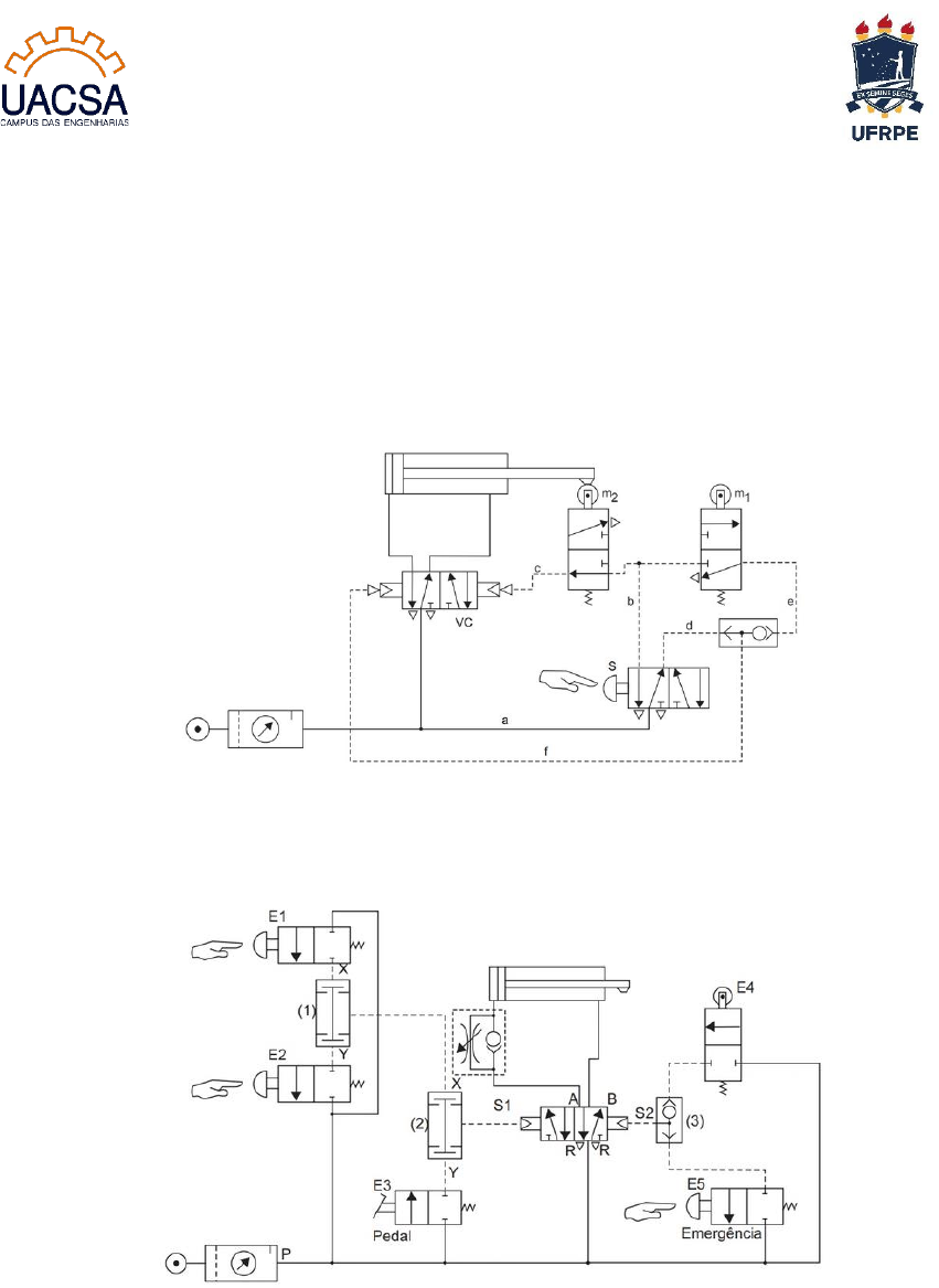Universidade Federal Rural de Pernambuco Unidade Acadêmica do Cabo de Santo Agostinho Disciplina: Automação Industrial e Controle 1 Professor: Philippe Eduardo de Medeiros ATIVIDADE 2 1) Elabore um circuito puramente pneumático para uma prensa rebitadora no qual o acionamento do atuador pneumático seja feito, por medidas de segurança, com comando bimanual e acionamento por pedal, de forma que, se qualquer um dos comandos for liberado antes de a tarefa ser executada, o atuador retorne ao ponto de partida. 2) Refaça o circuito da figura abaixo a seguir com eletroválvulas e crie seu respectivo circuito elétrico de comando. 3) Para este circuito, elimine as válvulas E1, E2, E3, E4, E5, Lógica E e OU e crie um circuito elétrico com as mesmas funções para comutar a válvula 5/2 acionadora do atuador. 4) Crie um circuito pneumático com dois atuadores de forma que o segundo atuador somente seja disparado depois que o primeiro execute 10 ciclos. Ambos deverão retornar juntos. 5) Elabore um circuito pneumático para o dispositivo a seguir, de forma que o acionamento da serra (atuador B) ocorra por válvula de retardo após acionamento do atuador A. As indicações a1 e a2 são chaves de fim de curso. 6) O modelo a seguir (figura abaixo), gerado por computador, refere-se a um mecanismo de gravação cujo princípio funcional é: » O atuador A empurra o bloco de dentro do magazine para posição no final da pista, sob o atuador B, permanecendo distendido. » O atuador B é acionado em sequência após um diferencial de pressão de 1 bar a mais que a pressão de trabalho do atuador A, permanecendo distendido por 30 segundos. » O pulso de retorno do atuador B também acionará o avanço do atuador C empurrando o bloco pela rampa. O atuador C é de simples efeito com retorno por mola, assim como o atuador A. » Desenhe o diagrama trajeto × passo para este circuito. ATENÇÃO! TODOS OS PONTOS LISTADOS ABAIXO DEVEM SER SATISFEITOS PARA QUE A SUA ATIVIDADE SEJA CORRIGIDA. 1) Fazer à mão e com letra legível. 2) Assinar e datar as folhas de resposta. 3) Escanear a atividade ou digitalizar o documento com um app scanner. 4) Anexar um único arquivo com as folhas de resposta da atividade, no formato PDF, no SIGAA. 5) O documento deve estar com qualidade suficiente para ser corrigido. 6) Caso algum ponto listado acima não seja cumprido, a atividade não será considerada.