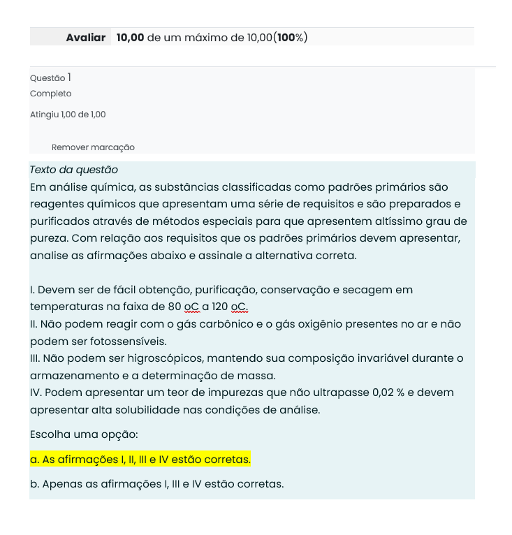 Em análise química, as substâncias classificadas como padrões primários são reagentes químicos que apresentam uma série de requisitos e são preparados e purificados através de métodos especiais para que apresentem altíssimo grau de pureza. Com relação aos requisitos que os padrões primários devem apresentar, analise as afirmacoes abaixo e assinale a alternativa correta. I. Devem ser de obtenção, purificação, conservação e secagem em temperaturas na faixa de 80 a 120. II. Não podem reagir com gás carbônico e gás oxigênio presentes no ar e não podem ser. III. Não podem ser higroscópicos, mantendo sua composição invariável durante a determinação de massa. IV. Podem apresentar um teor de impurezas que não ultrapasse 0,02 % e devem apresentar alta solubilidade nas condições de análise. a. As afirmações I, II, III e IV estão corretas. b. Apenas as afirmações I, III e IV estão corretas.