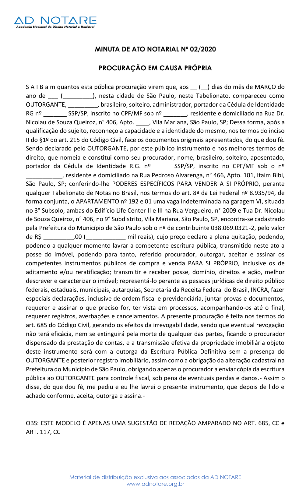 Material de distribuição exclusiva aos associados da AD NOTARE www.adnotare.org.br MINUTA DE ATO NOTARIAL Nº 02/2020 PROCURAÇÃO EM CAUSA PRÓPRIA S A I B a m quantos esta pública procuração virem que, aos __ (__) dias do mês de MARÇO do ano de ___ (_________), nesta cidade de São Paulo, neste Tabelionato, compareceu como OUTORGANTE, _________, brasileiro, solteiro, administrador, portador da Cédula de Identidade RG nº _______ SSP/SP, inscrito no CPF/MF sob nº _______, residente e domiciliado na Rua Dr. Nicolau de Souza Queiroz, n° 406, Apto. ____, Vila Mariana, São Paulo, SP; Dessa forma, após a qualificação do sujeito, reconheço a capacidade e a identidade do mesmo, nos termos do inciso II do §1º do art. 215 do Código Civil, face os documentos originais apresentados, do que dou fé. Sendo declarado pelo OUTORGANTE, por este público instrumento e nos melhores termos de direito, que nomeia e constitui como seu procurador, nome, brasileiro, solteiro, aposentado, portador da Cédula de Identidade R.G. nº _____ SSP/SP, inscrito no CPF/MF sob o nº ___________, residente e domiciliado na Rua Pedroso Alvarenga, n° 466, Apto. 101, Itaim Bibi, São Paulo, SP; conferindo-lhe PODERES ESPECÍFICOS PARA VENDER A SI PRÓPRIO, perante qualquer Tabelionato de Notas no Brasil, nos termos do art. 8º da Lei Federal nº 8.935/94, de forma conjunta, o APARTAMENTO nº 192 e 01 uma vaga indeterminada na garagem VI, situada no 3° Subsolo, ambas do Edifício Life Center II e III na Rua Vergueiro, n° 2009 e Tua Dr. Nicolau de Souza Queiroz, n° 406, no 9° Subdistrito, Vila Mariana, São Paulo, SP, encontra-se cadastrado pela Prefeitura do Município de São Paulo sob o nº de contribuinte 038.069.0321-2, pelo valor de R$ _________,00 (____________ mil reais), cujo preço declaro a plena quitação, podendo, podendo a qualquer momento lavrar a competente escritura pública, transmitido neste ato a posse do imóvel, podendo para tanto, referido procurador, outorgar, aceitar e assinar os competentes instrumentos públicos de compra e venda PARA SI PRÓPRIO, inclusive os de aditamento e/ou reratificação; transmitir e receber posse, domínio, direitos e ação, melhor descrever e caracterizar o imóvel; representá-lo perante as pessoas jurídicas de direito público federais, estaduais, municipais, autarquias, Secretaria da Receita Federal do Brasil, INCRA, fazer especiais declarações, inclusive de ordem fiscal e previdenciária, juntar provas e documentos, requerer e assinar o que preciso for, ter vista em processos, acompanhando-os até o final, requerer registros, averbações e cancelamentos. A presente procuração é feita nos termos do art. 685 do Código Civil, gerando os efeitos da irrevogabilidade, sendo que eventual revogação não terá eficácia, nem se extinguirá pela morte de qualquer das partes, ficando o procurador dispensado da prestação de contas, e a transmissão efetiva da propriedade imobiliária objeto deste instrumento será com a outorga da Escritura Pública Definitiva sem a presença do OUTORGANTE e posterior registro imobiliário, assim como a obrigação da alteração cadastral na Prefeitura do Município de São Paulo, obrigando apenas o procurador a enviar cópia da escritura pública ao OUTORGANTE para controle fiscal, sob pena de eventuais perdas e danos.- Assim o disse, do que dou fé, me pediu e eu lhe lavrei o presente instrumento, que depois de lido e achado conforme, aceita, outorga e assina.- OBS: ESTE MODELO É APENAS UMA SUGESTÃO DE REDAÇÃO AMPARADO NO ART. 685, CC e ART. 117, CC Hamarsom Rodrigues de Sousa - 03748667329