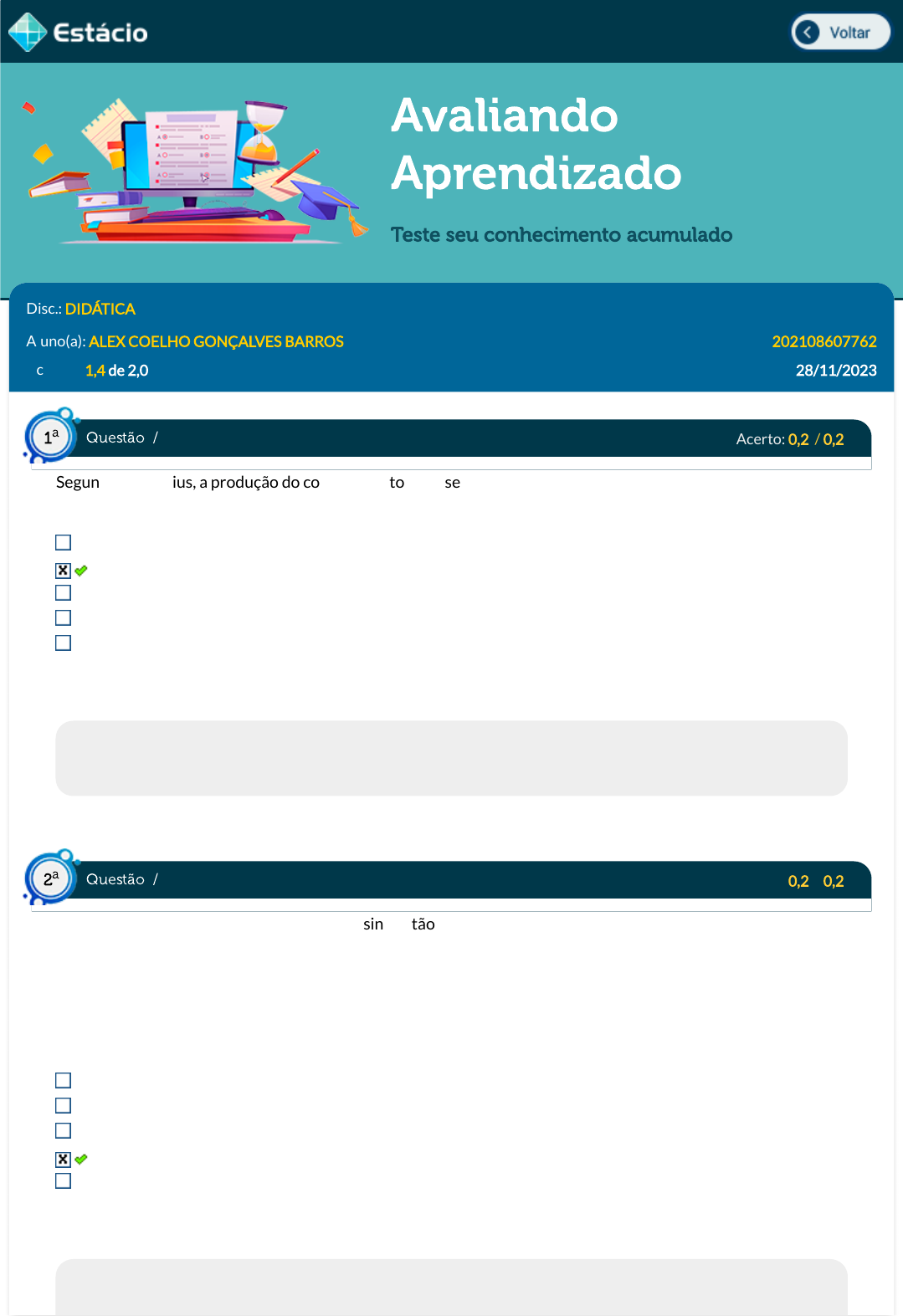 08/02/2024, 14:26 Estácio: Alunos https://simulado.estacio.br/alunos/ 1/6 Avaliando Aprendizado Teste seu conhecimento acumulado Disc.: DIDÁTICA Aluno(a): ALEX COELHO GONÇALVES BARROS 202108607762 Acertos: 1,4 de 2,0 28/11/2023 Acerto: 0,2 / 0,2 Segundo Comenius, a produção do conhecimento deve ser signi�cativa para que o processo de ensino e aprendizagem aconteça de forma efetiva. Para que isso aconteça, na visão este autor, é necessário: cumprir todo o conteúdo programático. utilizar conhecimentos, atitudes e procedimentos de ensino de maneira articulada. estabelecer superioridade do conteúdo escolar e sobre o social. se transformar em fonte de renda. for escolhida pelos responsáveis da criança. Respondido em 28/11/2023 19:34:38 Explicação: A resposta correta é: utilizar conhecimentos, atitudes e procedimentos de ensino de maneira articulada. Acerto: 0,2 / 0,2 Nesta tendência pedagógica, as ações de ensino estão centradas na exposição dos conhecimentos pelo professor. O professor assume funções como vigiar e aconselhar os alunos, corrigir e ensinar a matéria. É visto como a autoridade máxima, um organizador dos conteúdos e estratégias de ensino e, portanto, o único responsável e condutor do processo educativo. PEREIRA, A. L. DE F. As tendências pedagógicas e a prática educativa nas ciências da saúde. Cadernos de Saúde Pública, v. 19, n. 5, p. 1527¿1534, out. 2003. Esta de�nição corresponde a qual tendência pedagógica? Tecnicista. Renovadora. Libertadora. Tradicional. Crítico-Social dos conteúdos. Respondido em 28/11/2023 19:36:32 Explicação: Questão / 1 a Questão / 2 a https://simulado.estacio.br/alunos/inicio.asp https://simulado.estacio.br/alunos/inicio.asp javascript:voltar(); javascript:voltar(); 08/02/2024, 14:26 Estácio: Alunos https://simulado.estacio.br/alunos/ 2/6 Nesta abordagem, o professor é a autoridade em sala de aula, pois é ele quem domina o conhecimento cientí�co. Ele deve valorizar a disciplina e estabelecer uma relação de respeito perante os alunos. Os conteúdos são os conhecimentos enciclopédicos, aqueles acumulados pela sociedade, que possuem valor intelectual. Os métodos são expositivos, focam na comunicação oral do conteúdo e na demonstração feitas pelo professor. Os exercícios de repetição são valorizados, pois permitem que o aluno memorize os conceitos e as fórmulas. A aprendizagem é receptiva e mecânica, o aluno deve seguir todos os passos estabelecidos pelo professor para assimilar o conteúdo. Por isso, são usados exercícios de repetição para garantir que o aluno aprendeu a matéria. A avaliação é feita por meio de provas orais e escritas, testes e exercícios para casa, com o objetivo de metri�car o conhecimento. Acerto: 0,2 / 0,2 Originada em teorias do campo da psicologia, o objetivo desta abordagem é a análise do comportamento considerando-o como resultado de in�uências sociais. Segundo esta abordagem é possível moldar o sujeito, recorrendo a estratégias de estímulos e respostas. Marque a alternativa que apresenta a teoria de�nida no trecho acima. Construtivista. Sociointeracionista. Behaviorista. Signi�cativa. Cognitivista. Respondido em 28/11/2023 19:46:25 Explicação: O nome Behaviorismo tem origem no termo em inglês Behavior, que signi�ca comportamento. O Behaviorismo, também chamado de Comportamentismo ou Comportamentalismo, tem como objeto de estudo o comportamento. Originada em estudos feitos no campo da Psicologia, essa corrente de pensamento compreende e de�ne o comportamento humano como o resultado de in�uências sociais. Segundo a teoria behavorista, o sujeito pode ser moldado de acordo com estímulos e respostas. Acerto: 0,2 / 0,2 Sabemos que quando transformamos os conceitos cientí�cos necessários para o aprendizado escolar e trabalhamos de forma que eles passem a ter signi�cado para o aluno, chamamos esse processo de Transposição Didática. Mas para compreendermos melhor o conceito devemos dar atenção às a�rmativas abaixo: I - Somos todos docentes-discentes-docentes-docentes. Ou seja, em uma sala de aula, estamos o tempo todo aprendendo e ensinando. II - O fato do professor ser geralmente mais velho, e ser mais experiente, não signi�ca que ele terá carga de conhecimento diferente dos alunos. III - Quanto mais os alunos trazem para a sala de aula suas experiências, mais rica pode ser a aula, quando o docente consegue aproveitar tais experiências. Das a�rmativas acima: Somente I é verdadeira. Somente II é falsa. I e II são falsas. II e III são verdadeiras. Somente III é falsa. Respondido em 28/11/2023 19:39:17 Questão / 3 a Questão / 4 a 08/02/2024, 14:26 Estácio: Alunos https://simulado.estacio.br/alunos/ 3/6 Explicação: A resposta correta é: Somente II é falsa. Acerto: 0,2 / 0,2 "Se teve algo que plataformas Online como o Youtube ofereceram no ramo dos negócios, foi a chance de se produzir conteúdo e gerar renda, em qualquer parte do país. Prova disso é a agência curitibana Coletive, que no ano passado chegou ao seu primeiro R$ 1 milhão de faturamento, focando apenas em desenvolver e orientar a carreira de in�uenciadores digitais e youtubers. (Gazeta do Povo, 30/09/19)." É provável que, em algum sentido, todos nós já tivemos contato com algum canal de Youtuber. O impacto trazido pela internet talvez esteja melhor personi�cado neste fenômeno. E esta re�exão já estava presente no chamado Relatório Delors, ao buscar entender as tensões presentes no do século XX e que deveriam ser superadas no século XXI. Sobre estas tensões apresentadas no relatório, considere as seguintes a�rmativas: I - A tensão GLOBAL x LOCAL, ao identi�car a difusão de informações das mídias digitais. O Relatório propõe não perder a identidade e o interesse pela realidade local, regional. II - A tensão UNIVERSAL x SINGULAR, que em tempos de cultura globalizada, propõe a busca de formas de pre