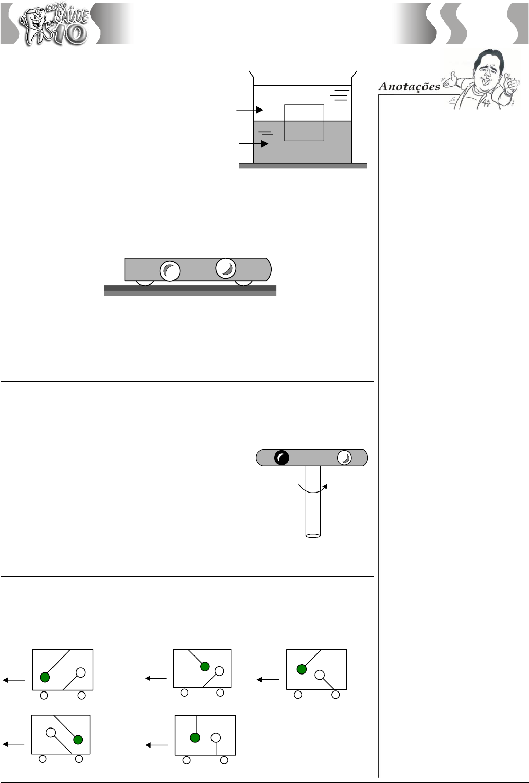 Física Simétrico Pré-Universitário – Há 25 anos ensinando com excelência os estudantes cearenses – www.simétrico.com.br 231 Questão 23 Os líquidos imiscíveis A e B, representados na figura, têm densidades dA = 2 g/cm3 e dB = 3 g/cm3. Um cubo flutua entre os dois líquidos com 40% do seu volume imerso no líquido A, e o restante no líquido B. Determine a densidade do cubo. A B Questão 24 A figura ilustra um tubo de vidro totalmente vedado, completamente preenchido com um líquido de densidade d. inicialmente em repouso. Em seu interior, foram colocadas duas bolas A e B, de densidades respectivamente iguais a dA e dB tais que dA > d > dB . Quando o tubo passar a se mover para a direita com aceleração a, pode-se afirmar que: A B a) a bola A se moverá para a esquerda e a bola B se moverá para a direita, em relação ao tubo; b) a bola B se moverá para a esquerda e a bola A se moverá para a direita, em relação ao tubo; c) ambas as bolas se moverão para a esquerda, em relação ao tubo; d) ambas as bolas se moverão para a direita, em relação ao tubo; e) as bolas permanecerão em repouso em relação ao tubo. Questão 25 A figura ilustra um tubo de vidro totalmente vedado, completamente preenchido com um líquido de densidade d. inicialmente em repouso. Em seu interior, foram colocadas duas bolas A e B, de densidades respectivamentes dA e dB tais que dA < d < dB . Quando o tubo passa a girar com velocidade angular constante em torno do seu eixo central, pode-se afirmar que: a) ambas as bolas se movem em direção ao centro do tubo; b) ambas as bolas se movem se afastando do centro do tubo; c) a bola B se move em direção ao centro, enquanto a bola A se move se afastando do centro; d) a bola A se move em direção ao centro, enquanto a bola B se move se afastando do centro; e) como o tubo gira com velocidade angular constante, ambas as molas permanecem em repouso em relação ao tubo. A B Questão 26 Utilizando fios ideais, uma esfera de ferro e uma bexiga de gás hélio foram amarradas, respectivamente, ao teto e ao chão de uma locomotiva que se desloca em movimento retilíneo para a esquerda. De repente, o maquinista percebe que está atrasado e passa a se mover acelerado. Qual dos desenhos a seguir melhor representa a posição da esfera e da bexiga, quando o balão se move acelerado ? a) a b) a c) a d) a e) a Física Simétrico Pré-Universitário – Há 25 anos ensinando com excelência os estudantes cearenses – www.simétrico.com.br 232 Questão 27 (Medicina Christus 2011) A figura abaixo apresenta o desenho esquemático de uma prensa hidráulica. Com base nele, determine o valor do módulo da força F2, aplicada no ponto B, sabendo que a força F1, aplicada no ponto A, apresenta módulo igual a 20 N, e que a área da superfície B é o triplo da área da superfície A, e o sistema está em equilíbrio. a) 60 N b) 30 N c) 25 N d) 40 N e) 20 N Questão 28 (Mackenzie-SP) O diagrama mostra o princípio do sistema hidráulico do freio de um automóvel. Quando uma força de 50 N é exercida no pedal, a força aplicada pelo êmbolo de área 80 mm2 é de: a) 100 N d) 400 N b) 250 N e) 500 N c) 350 N Física Simétrico Pré-Universitário – Há 25 anos ensinando com excelência os estudantes cearenses – www.simétrico.com.br 233 Pensando em Casa Pensando em Casa ATENÇÃO: É absolutamente necessário ler a teoria desse capítulo antes de resolver as questões referentes a ele. As questões que se seguem não são mera aplicação de fórmulas, requerem uma real compreensão dos aspectos teóricos do assunto. Se você não leu TODA A TEORIA relativa ao assunto já abordado em sala de aula, NÃO INICIE A TAREFA DE CASA AGORA. Questão 01 - (Medicina Christus 2013) A figura mostra uma alimentação endovenosa. A figura indica a altura mínima para que a solução nutriente (de densidade d = 1030 kg/m3) consiga apenas entrar no sangue da veia. O prof. Renato Brito pede que você determine a pressão sanguínea média dessa pessoa em cmHg. Dados: g = 10 m/s2, 1 atm = 76 cmHg = 105 N/m2 a) 4 cmHg b) 5 cmHg c) 6 cmHg d) 7 cmHg e) 8 cmHg Questão 02 - Num hospital psiquiátrico em Fortaleza, um jovem alcoólatra decidiu tomar conhaque diretamente na veia. Sabendo que a pressão sanguínea média do rapaz vale 14 cmHg, a densidade do conhaque 1,2 g/cm3 e g = 10 m/s2, o prof. Renato Brito pede que você determine a altura mínima da “bolsa de conhaque” a fim de que o jovem maluco tenha êxito (jamais tente fazer isso pois você vai morrer). a) 0,82 m b) 1,24 m c) 1,53 m d) 1,62 m e) 0,93 m Dados: 1 g/cm3 = 1 kg/L = 103 kg/m3 1 atm = 76 cm Hg = 105 N/m2 Questão 03 - A Companhia de Água e Esgoto do Ceará (CAGECE) fornece água até a cisterna de uma residência. Para elevar a água até a caixa d’água foi utilizada uma bomba submersa (figura abaixo). A caixa d’água se encontra 10 metros acima do nível da bomba. Portanto, para encher a caixa d’água, a bomba deve vencer uma pressão de (g = 9,8 m/s2). a) 98,0 x 103 N/m2 b) 19,6 x 103 N/m2 c) 12,6 x 103 N/m2 d) 4,9 x 103 N/m2 e) 3,8 x 103 N/m2 Questão 04 - (UNIFOR 2010.2) A chamada camada pré-sal é uma faixa que se estende ao longo de 800 quilômetros entre os Estados do Espírito Santo e Santa Catarina, abaixo do leito do mar, e engloba três bacias sedimentares (Espírito Santo, Campos e Santos). O petróleo encontrado nesta área está a profundidades que superam os 7 mil metros, abaixo de uma extensa camada de sal que, segundo geólogos, conservam a qualidade do petróleo. A profundidade do leito do oceano, nesta região, está compreendida entre 1 mil e 2 mil metros. Considere que a densidade média da água do mar é de 1024 kg/m3. Trabalhar a esta profundidade envolve um problema muito complexo que é devido ao fato de a pressão hidrostática ser muito grande. Sabendo que 1 atm vale 105 Pa (1 Pa = 1 N/m2), a pressão hidrostática entre 1 e 2 mil metros de profundidade, em termos da pressão atmo