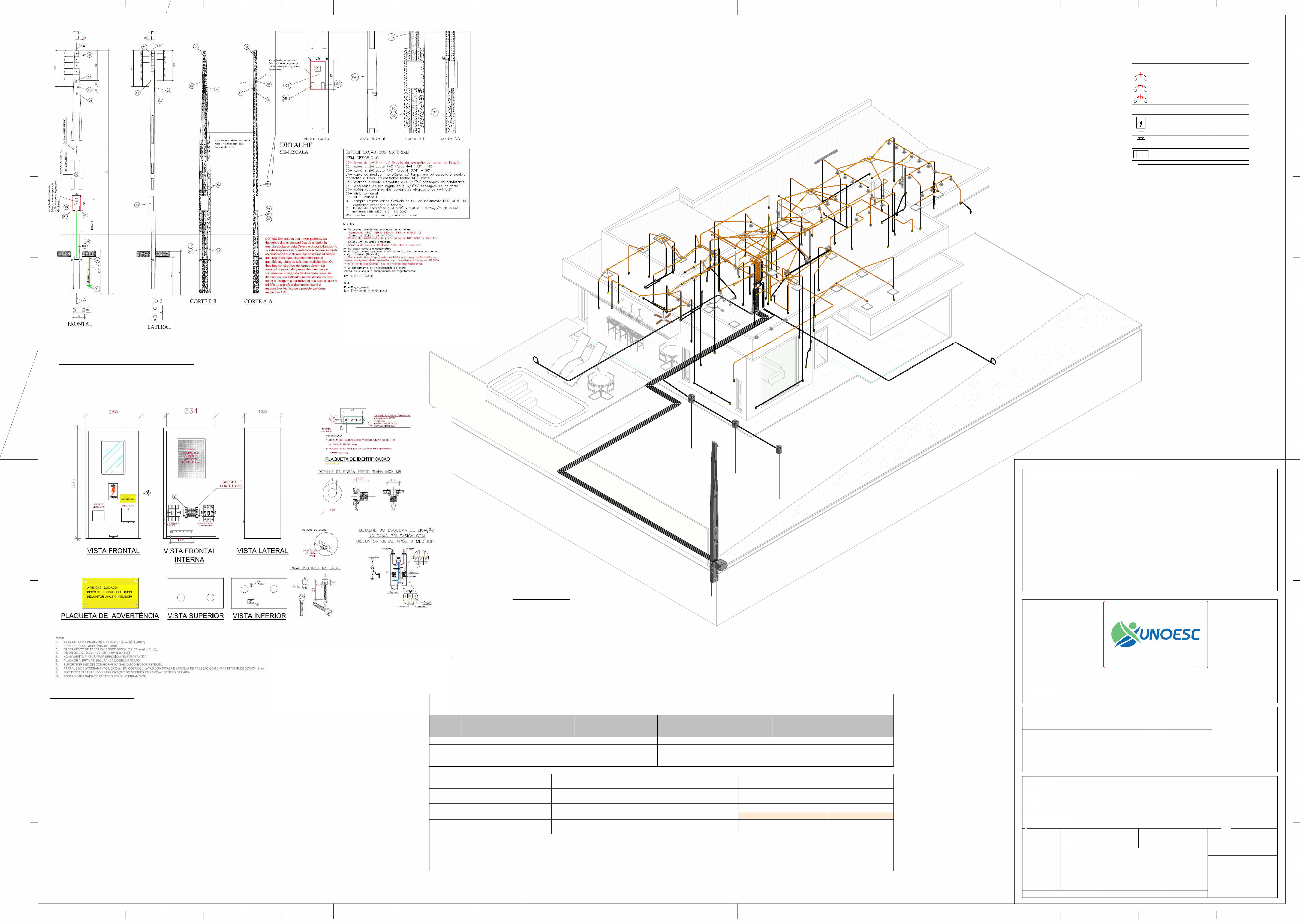 Disjuntor Termomagnético Monopolar LEGENDA DIAGRAMAS UNIFILARES Disjuntor Termomagnético Bipolar Condutores Neutro, Fase, Terra, respectivamente DPS-Dispositivo de proteção contra surtos DR IDR-Interruptor Diferencial Residual (Imax=30mA) kW.h Medidor de Energia DPS Disjuntor Termomagnético Tripolar DESENHO ESCALAS DESENHO(S) RESPONSÁVEL FOLHA PROJETO : LOCAL :PROPRIETÁRIO : Resp. Técnico: PROPRIETÁRIO: CURSO ARQUITETURA E URBANISMO APROVAÇÕES ÓRGÃOS COMPETENTES/ANOTAÇÕES EFICIÊNCIA DO AMBIENTE CONSTRUÍDO Arquivo: INDICADA Data: CPF AREA: 1122334455667788991010111112121313141415151616 1122334455667788991010111112121313141415151616 AA BB CC DD EE FF GG HH II JJ KK AA BB CC DD EE FF GG HH II JJ KK LAURA GHISLENI - KÁTIA CARBONI - LUIMAR DE SOUZA - VANESA GOMES Equipe Técnica : F:\Nova pasta\PROJETO ELETRICO- celesc.rvt 12/04/2023 17:18:55 3 ODÍLIO ELÉTRICO EFICIÊNCIA AMBIENTE CONSTRUÍDO LAS ODÍLIO XX 230 m² URUSANGA 11 CAU / SC 1111 ELE-01 / PADRÃO DE ENTRADA, PAINEL EDETALHE 3D 3D ELÉTRICA Notas: OFE_Tomadas 18000 VA 1,00 18000 VA OFE_Motores Monofásicos 2400 VA 0,75 1800 VA Corrente Total Demandada: 70,80 A OFE_Ar Condicionado 14200 VA 1,00 14200 VA Corrente Total Instalada: 80,03 A OFE_Dispositivos de Aquecimento com potência... 15300 VA 0,65 9945 VA Potência Total Demandada: 46602 VA OFE_Iluminação 4136 VA 1,00 4136 VA Potência Total Instalada: 52671 VA Iluminação+TUGs (Residencial) 1200 VA 0,75 900 VA Classificação da Carga Potência Instalada Fator de Demanda Potência Demandada Totais do Painel 4 3 2 1 QDC 80,00 A [Cu/PVC/750V/70°]-Un-B1-2Cc 3-#25,0(101A), 1-#25,0(101A), 1-#16,0 Circuito Descrição In: Disjuntor (A) Tipo de Instalação Condutor Calculado / Capacidade de conduçãode corrente Sistema de Alimentação: 220/380V Trifásico (3F+N+T) Painel: MED Legenda Diagrama Unifilar DETALHE KIT POSTE ENTRADA DETALHE MEDIDOR REF. MED 1a 1 a 100 1 b 100 1b 1 c 100 1 c 100 1c 1c 1 h 100 1 h 100 1 m 100 1 m 100 1 m 100 1 m 100 1 m 100 1 n 100 1 o 100 1 h 100 1 g 7 1 g 7 1 g 7 1 h 100 1 h 100 2 p 100 2 p 100 2 p 100 2 r 100 2 t 100 2 x 100 2 z 100 2 w 7 2 w 7 2 w 7 2 w 7 2 w 7 2 bb 7 2 aa 100 2 aa 100 2 bb 7 2 bb 7 2 bb 7 2 w 7 2 cc 7 2 cc 7 2 cc 7 2 bb 7 2 cc 7 2 ee 100 2 dd 100 2 dd 100 2 p 7 2 p 7 2 p 7 2 u 100 2 y 7 2 y 7 2 y 7 2 v 100 2 v 100 2 y 7 2 q 7 2 q 7 2 s 100 2 s 100 1 d 7 1 d 7 1 d 7 1 d 7 1 d 7 1 d 7 1 k 7 1 k 7 1 j 100 1 l 7 1 l 7 2 q 7 2 w 7 2 w 7 2 w 7 2 w 100 1 k 7 1 l 7 Ø 40 Ø40 Ø 40 Ø40 1 1 i 100 1 e 7 1 d 7 1f 1d 1e 1f1d1e 1 f 100 1 e 100 1 f 7 1 f 7 1 f 7 1g1h 1i 1g 1i 1h 1j1l 1k 1m 1n 1o 2p 2p 2q 2r 2s 2q 2s 2r 2t 2u 2v 2x 2y 2v 2x 2w2z 2aa 2w 2aa 2z 2bb 2cc 2dd2ee 3 7800 4 7500 5 3200 6 3200 7 2600 8 2600 9 2600 10 600 11 600 11 600 11 600 11 100 14 100 14 600 14 600 14 600 14 100 14 100 14 100 13 1400 12 5500 15 100 15 100 15 10015 100 15 100 15 100 15 100 15 100 15 100 15 100 16 600 16 600 16 600 16 100 18 100 18 100 18 100 18 100 17 100 17 100 17 100 17 100 19 100 19 100 19 100 19 100 20 100 20 100 20 100 20 100 21 100 21 100 18 100 18 100 17 100 19 100 19 100 22 600 23 600 17 100 26 1200 25 1200 2y Ø 32 Ø25 Ø 25 Ø32 Ø32 Ø32 Ø 32 Ø 32 Ø 32 Ø32 Ø 32Ø25 Ø2 5 Ø 32 Ø32 Ø32 Ø32Ø32Ø32 Ø 32 Ø32 Ø32 Ø 32 Ø 25 Ø32 Ø 25 Ø 25 Ø25 Ø32 Ø 32 Ø 32 Centro de cargas 24 100 1m #2,5 24 #4,024 #4,0 1 #2,5 24 #4,0 1m #2,5 24 #4,0 24 #4,0 1m #2,5 ih1g #2,5 1h #2,5 15 #2,5 15 #2,5 ih1g #2,5 1h #2,5 1h #2,5 15 #2,5 15 #2,51g #2,5 1g #2,5 15 #2,5 15 #2,5 15 #2,5 1i #2,5 15 #2,5 15 #2,5 5 #2,5 5 #2,515 #2,5 1m #2,5 1o #2,5 24 #4,0 2p #2,5 21 #2,5 2p #2,5 2p #2,5 2p #2,5 21 #2,5 21 #2,5 4 #10,0 2dd #2,5 2ee #2,5 22 #4,0 2cc #2,5 20 #2,5 20 #2,5 2aa #2,5 zw2aa #2,5 2aa #2,5 w 19 #2,5 20 #2,5 22 #4,0 19 #2,5 2w #2,5 19 #2,5 2aa #2,5 w z 19 #2,5 2 #2,5 20 #2,5 22 #4,0 2w #2,5 20 #2,5 22 #4,0 2aa #2,5 w 20 #2,5 22 #4,0 2aa #2,5 w 20 #2,5 22 #4,0 2aa #2,5 w 20 #2,5 22 #4,0 22 #4,0 20 #2,5 19 #2,5 2 #2,5 17 #2,5yx2v #2,5 2v #2,5 y 17 #2,5 yx2v #2,5 2v #2,5 2v #2,5 2y #2,5 17 #2,5 17 #2,5 y2v #2,5 17 #2,5 2v #2,5 y u2t #2,5 2 #2,5 17 #2,5 19 #2,5 20 #2,5 22 #4,0 23 #4,0 8 #2,5 4 #10,0 21 #2,5 2p #2,5 11 #2,5 10 #2,5 fe1d #2,513 #2,5 12 #4,0 11 #2,5 10 #2,5 fe1d #2,5 14 #2,5 13 #2,5 12 #4,0 11 #2,5 10 #2,5 1 #2,5 12 #4,0 13 #2,5 14 #2,5 14 #2,5 13 #2,5 12 #4,0 12 #4,0 13 #2,5 14 #2,5 14 #2,5 12 #4,0 16 #2,5 10 #2,5 1 #2,5 b1a #2,5 10 #2,5 1c #2,5 16 #2,5 16 #2,5 1l #2,5 16 #2,5 1l #2,5 16 #2,5 1l #2,5 16 #2,5 k1j #2,5 1j #2,5 16 #2,5 15 #2,5 1 #2,5 fe1d #2,5 16 #2,5 14 #2,5 13 #2,5 6 #2,5 21 #2,5 2 #2,5 26 #2,5 sr2q #2,5 18 #2,5 2q #2,5 18 #2,5 2 #2,5 17 #2,5 18 #2,5 19 #2,5 20 #2,5 22 #4,0 23 #4,0 2q #2,5 r s 18 #2,5 2s #2,5 18 #2,5 18 #2,5 9 #2,5 11 #2,5 1c #2,5 11 #2,5 11 #2,5 14 #2,5 14 #2,5 fe1d #2,5 14 #2,51a #2,5 1j #2,5 k l 16 #2,5 1d #2,5 1 #2,5 24 #4,0 1 #35,0 #16,0 Ø32 Ø25 Ø25 Ø25 Ø25 Ø25 Ø 25 Ø25 Ø 25 Ø2 5 Ø 25 Ø 25 Ø 25 Ø25 Ø25 Ø25 Ø25 Ø25 Ø2 5 Ø 25 Ø 25 Ø 25 Ø 25 Ø25 Ø25 Ø25 Ø25Ø25 Ø 25 Ø 25 Ø 25 Ø 25 Ø25 Ø25 23 #4,0 3 #10,0 2u #2,5 19 #2,5 2w #2,5 2w #2,5 2w #2,5 2aa #2,5 19 #2,5 20 #2,5 2bb #2,5 20 #2,5 2bb #2,5 20 #2,5 2bb #2,5 22 #4,0 20 #2,5 2 #2,5 22 #4,0 Ø 25 Ø25 Ø25 Ø25 Ø25 Ø 25 1 #35,0 #16,0 QDC 4 ELE-03 HASTE ATERRAMENTO Tomada Baixa 2P+T, 10A, a 30cm do piso acabado Tomada Média 2P+T, 10A, a 120cm do piso acabado Tomada Alta 2P+T, 10A, a 210cm do piso acabado Condutores Neutro, Fase, Terra e Retorno, respectivamente 100 1 a Ponto de luz embutido no teto Interruptor simples de uma seção a Conjunto de 2 Interruptores simples a b Interruptor paralelo (three-way) a Conjunto de 3 Interruptores simples a b c Tomada Baixa 2P+T, 20A, a 30cm do piso acabado Tomada Média 2P+T, 20A, a 120cm do piso acabado Tomada Alta 2P+T, 20A, a 210cm do piso acabado Ponto de Força com placa saída de fio, a 230cm do piso acabado Eletroduto corrugado flexível embutido no teto ou na parede Eletroduto de PEAD embutido no piso Quadro geral de luz e força embutido a 1,50 do piso