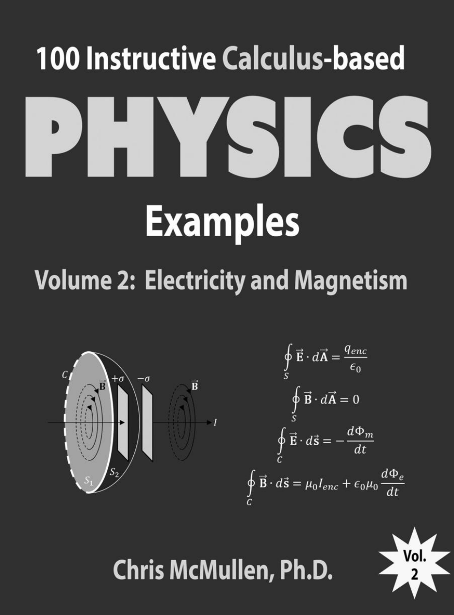 100 Instructive Calculus-based Physics Examples Volume 2: Electricity and Magnetism Fundamental Physics Problems Chris McMullen, Ph.D. Physics Instructor Northwestern State University of Louisiana Copyright © 2017 Chris McMullen, Ph.D. www.monkeyphysicsblog.wordpress.com www.improveyourmathfluency.com www.chrismcmullen.wordpress.com Zishka Publishing All rights reserved. ISBN: 978-1-941691-13-7 Textbooks > Science > Physics Study Guides > Workbooks> Science CONTENTS Introduction 4 Chapter 1 – Coulomb’s Law 5 Chapter 2 – Electric Field 9 Chapter 3 – Superposition of Electric Fields 13 Chapter 4 – Electric Field Mapping 25 Chapter 5 – Electrostatic Equilibrium 35 Chapter 6 – Integration Essentials 41 Chapter 7 – Electric Field Integrals 57 Chapter 8 – Gauss’s Law 79 Chapter 9 – Electric Potential 123 Chapter 10 – Motion of a Charged Particle in a Uniform Electric Field 137 Chapter 11 – Equivalent Capacitance 141 Chapter 12 – Parallel-plate and Other Capacitors 157 Chapter 13 – Equivalent Resistance 167 Chapter 14 – Circuits with Symmetry 183 Chapter 15 – Kirchhoff’s Rules 195 Chapter 16 – More Resistance Equations 205 Chapter 17 – Logarithms and Exponentials 215 Chapter 18 – RC Circuits 219 Chapter 19 – Scalar and Vector Products 223 Chapter 20 – Bar Magnets 227 Chapter 21 – Right-hand Rule for Magnetic Force 231 Chapter 22 – Right-hand Rule for Magnetic Field 243 Chapter 23 – Combining the Two Right-hand Rules 251 Chapter 24 – Magnetic Force 263 Chapter 25 – Magnetic Field 271 Chapter 26 – The Law of Biot-Savart 281 Chapter 27 – Ampère’s Law 299 Chapter 28 – Lenz’s Law 323 Chapter 29 – Faraday’s Law 341 Chapter 30 – Inductance 361 Chapter 31 – AC Circuits 371 Chapter 32 – Maxwell’s Equations 387 INTRODUCTION This book includes fully-solved examples with detailed explanations for 125 standard physics problems. There are also 16 math examples from integral calculus, which are essential toward mastering calculus-based physics. That makes a total of 141 problems. Each example breaks the solution down into terms that make it easy to understand. The written explanations between the math help describe exactly what is happening, one step at a time. These examples are intended to serve as a helpful guide for solving similar standard physics problems from a textbook or course. The best way to use this book is to write down the steps of the mathematical solution on a separate sheet of paper while reading through the example. Since writing is a valuable memory aid, this is an important step. In addition to writing down the solution, try to think your way through the solution. It may help to read through the solution at least two times: The first time, write it down and work it out on a separate sheet of paper as you solve it. The next time, think your way through each step as you read it. Math and science books aren’t meant to be read like novels. The best way to learn math and science is to think it through one step at a time. Read an idea, think about it, and then move on. Also write down the solutions and work them out on your own paper as you read. Students who do this tend to learn math and science better. Note that these examples serve two purposes: • They are primarily designed to help students understand how to solve standard physics problems. This can aid students who are struggling to figure out homework problems, or it can help students prepare for exams. • These examples are also the solutions to the problems of the author’s other book, Essential Calculus-based Physics Study Guide Workbook, ISBN 978-1-941691-11-3. That study guide workbook includes space on which to solve each problem. 100 Instructive Calculus-based Physics Examples 5 1 COULOMB’S LAW Coulomb’s law 𝐹𝐹𝑒𝑒 = 𝑘𝑘 |𝑞𝑞1||𝑞𝑞2| 𝑅𝑅2 Coulomb’s Constant 𝑘𝑘 = 8.99 × 109 N∙m2 C2 ≈ 9.0 × 109 N∙m2 C2 Symbol Name SI Units 𝐹𝐹𝑒𝑒 electric force N 𝑞𝑞 charge C 𝑅𝑅 separation m 𝑘𝑘 Coulomb’s constant N∙m 2 C2 or kg∙m 3 C2∙s2 Elementary Charge 𝑒𝑒 = 1.60 × 10−19 C Prefix Name Power of 10 m milli 10−3 µ micro 10−6 n nano 10−9 p pico 10−12 Note: The symbol µ is the lowercase Greek letter mu. When it is used as a metric prefix, it is called micro. For example, 32 µC is called 32 microCoulombs. Chapter 1 – Coulomb’s Law 6 Example 1. A coin with a monkey’s face has a net charge of −8.0 µC while a coin with a monkey’s tail has a net charge of −3.0 µC. The coins are separated by 2.0 m. What is the electric force between the two coins? Is the force attractive or repulsive? Solution. Begin by making a list of the known quantities: • The coin with the monkey’s face has a charge of 𝑞𝑞1 = −8.0 µC. • The coin with the monkey’s tail has a charge of 𝑞𝑞2 = −3.0 µC. • The separation between the coins is 𝑅𝑅 = 2.0 m. • Coulomb’s constant is 𝑘𝑘 = 9.0 × 109 N∙m 2 C2 . Convert the charges from microCoulombs (µC) to Coulombs (C). Recall that the metric prefix micro (µ) stands for one millionth: µ = 10−6. 𝑞𝑞1 = −8.0 µC = −8.0 × 10−6 C 𝑞𝑞2 = −3.0 µC = −3.0 × 10−6 C Plug these values into Coulomb’s law. It’s convenient to suppress units and trailing zeroes (as in 8.0) until the end of the solution in order to avoid clutter. Note the absolute values (the reason for them is that the magnitude of the force is always positive). 𝐹𝐹𝑒𝑒 = 𝑘𝑘 |𝑞𝑞1||𝑞𝑞2| 𝑅𝑅2 = (9 × 109) |−8 × 10−6||−3 × 10−6| (2)2 = (9 × 109) (8 × 10−6)(3 × 10−6) (2)2 If you’re not using a calculator, it’s convenient to separate the powers: 𝐹𝐹𝑒𝑒 = (9)(8)(3) (2)2 × 10910−610−6 = 54 × 10−3 = 0.054 N Note that 10910−610−6 = 109−6−6 = 109−12 = 10−3 according to the rule 𝑥𝑥𝑚𝑚𝑥𝑥𝑛𝑛 = 𝑥𝑥𝑚𝑚+𝑛𝑛. Also not
