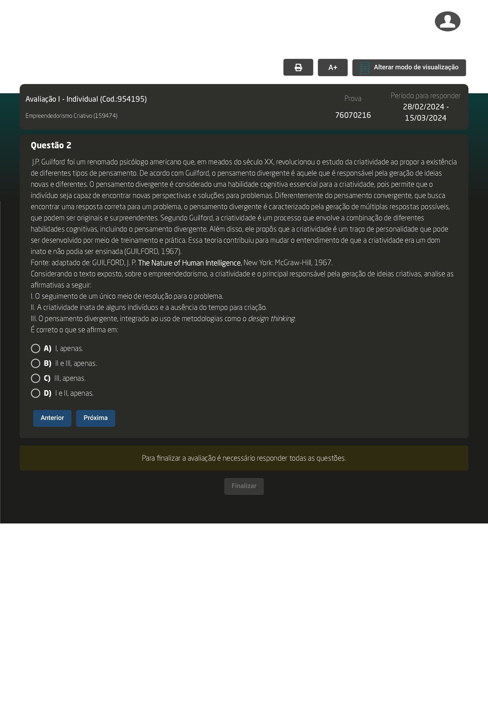29/02/24, 17:37 AVA https://ava2.uniasselvi.com.br/subject/grades-and-tests/answer/eyJ0ZXN0Ijp7InRlc3RDb2RlIjoiOTU0MTk1IiwiZGVzY3JpcHRpb24iOiJBdmFsaWHDp8OjbyBJIC0gSW5kaXZpZHVhbCIsInBhcmFtZXRlciI6MTgzMjIwL… 1/1 RESPONDER AVALIAÇÃO Avaliação I - Individual (Cod.:954195) Empreendedorismo Criativo (159474) Prova 76070216 Período para responder 28/02/2024 - 15/03/2024 Questão 2 J.P. Guilford foi um renomado psicólogo americano que, em meados do século XX, revolucionou o estudo da criatividade ao propor a existência de diferentes tipos de pensamento. De acordo com Guilford, o pensamento divergente é aquele que é responsável pela geração de ideias novas e diferentes. O pensamento divergente é considerado uma habilidade cognitiva essencial para a criatividade, pois permite que o indivíduo seja capaz de encontrar novas perspectivas e soluções para problemas. Diferentemente do pensamento convergente, que busca encontrar uma resposta correta para um problema, o pensamento divergente é caracterizado pela geração de múltiplas respostas possíveis, que podem ser originais e surpreendentes. Segundo Guilford, a criatividade é um processo que envolve a combinação de diferentes habilidades cognitivas, incluindo o pensamento divergente. Além disso, ele propôs que a criatividade é um traço de personalidade que pode ser desenvolvido por meio de treinamento e prática. Essa teoria contribuiu para mudar o entendimento de que a criatividade era um dom inato e não podia ser ensinada (GUILFORD, 1967). Fonte: adaptado de: GUILFORD, J. P. The Nature of Human Intelligence. New York: McGraw-Hill, 1967. Considerando o texto exposto, sobre o empreendedorismo, a criatividade e o principal responsável pela geração de ideias criativas, analise as afirmativas a seguir: I. O seguimento de um único meio de resolução para o problema. II. A criatividade inata de alguns indivíduos e a ausência do tempo para criação. III. O pensamento divergente, integrado ao uso de metodologias como o design thinking. É correto o que se afirma em: Para finalizar a avaliação é necessário responder todas as questões. VOLTAR A+ Alterar modo de visualização A) I, apenas. B) II e III, apenas. C) III, apenas. D) I e II, apenas. Anterior Próxima Finalizar Leticia Orlandina Luciano Sagas Pedagogia (5454227)