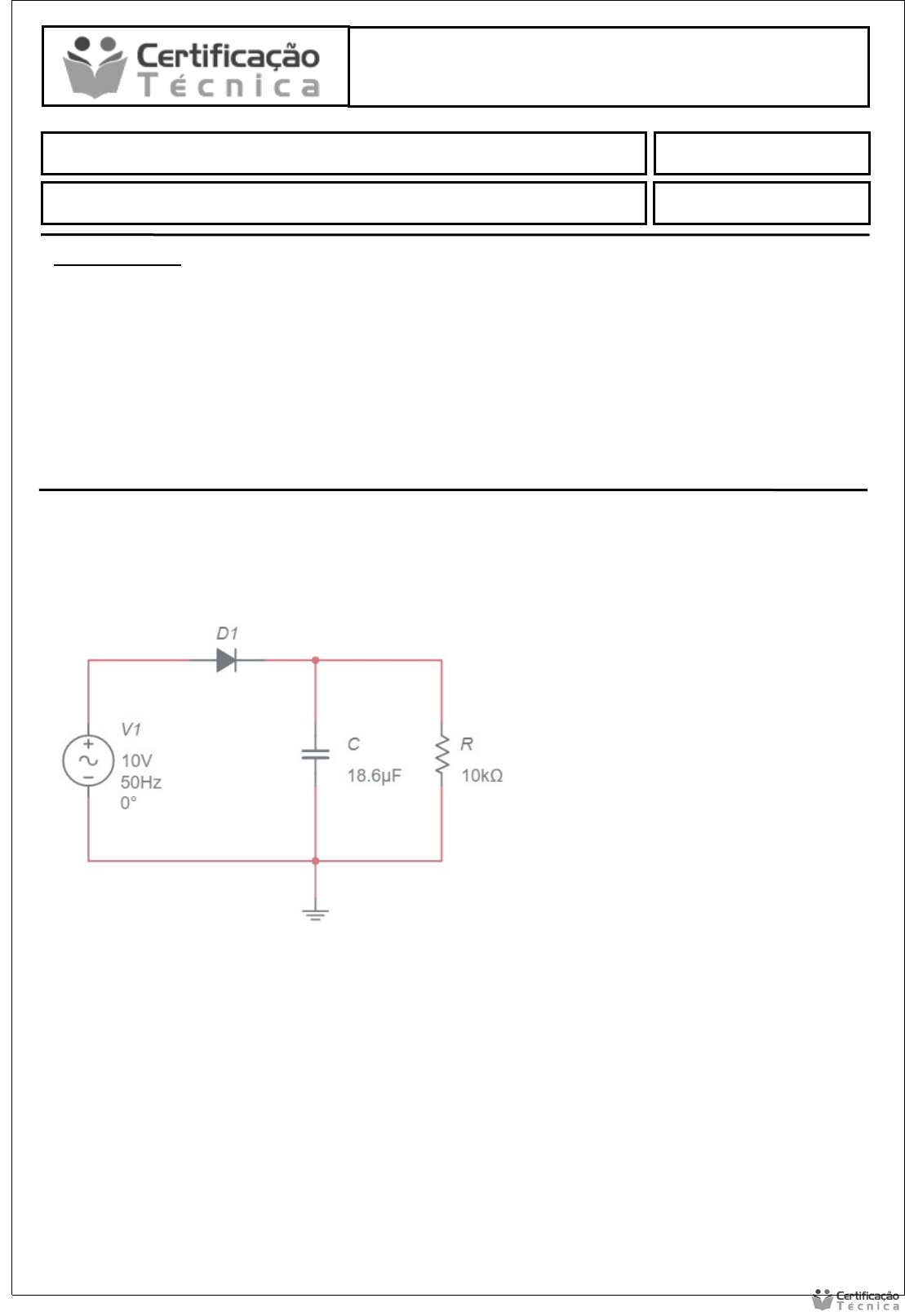 Eletrônica Básica Exemplos Práticos Data: 26/12/2023 Aluno (a): Rubens Avaliação Pratica INSTRUÇÕES: · Esta Avaliação contém 1 (uma) questão, totalizando 10 (dez) pontos; · Baixe o arquivo disponível com a Atividade Pratica; · Você deve preencher dos dados no Cabeçalho para sua identificação: · Nome / Data de entrega. · As respostas devem ser digitadas abaixo de cada pergunta; · Ao terminar grave o arquivo com o nome Atividade Prática; · Quando solicitado · Envio o arquivo pelo sistema no local indicado; · Em caso de dúvidas consulte o seu Tutor. Questão 1 – Monte o circuito abaixo no protoboard do tinkercad, meça a sua saída com o osciloscópio e apresente sua resposta.