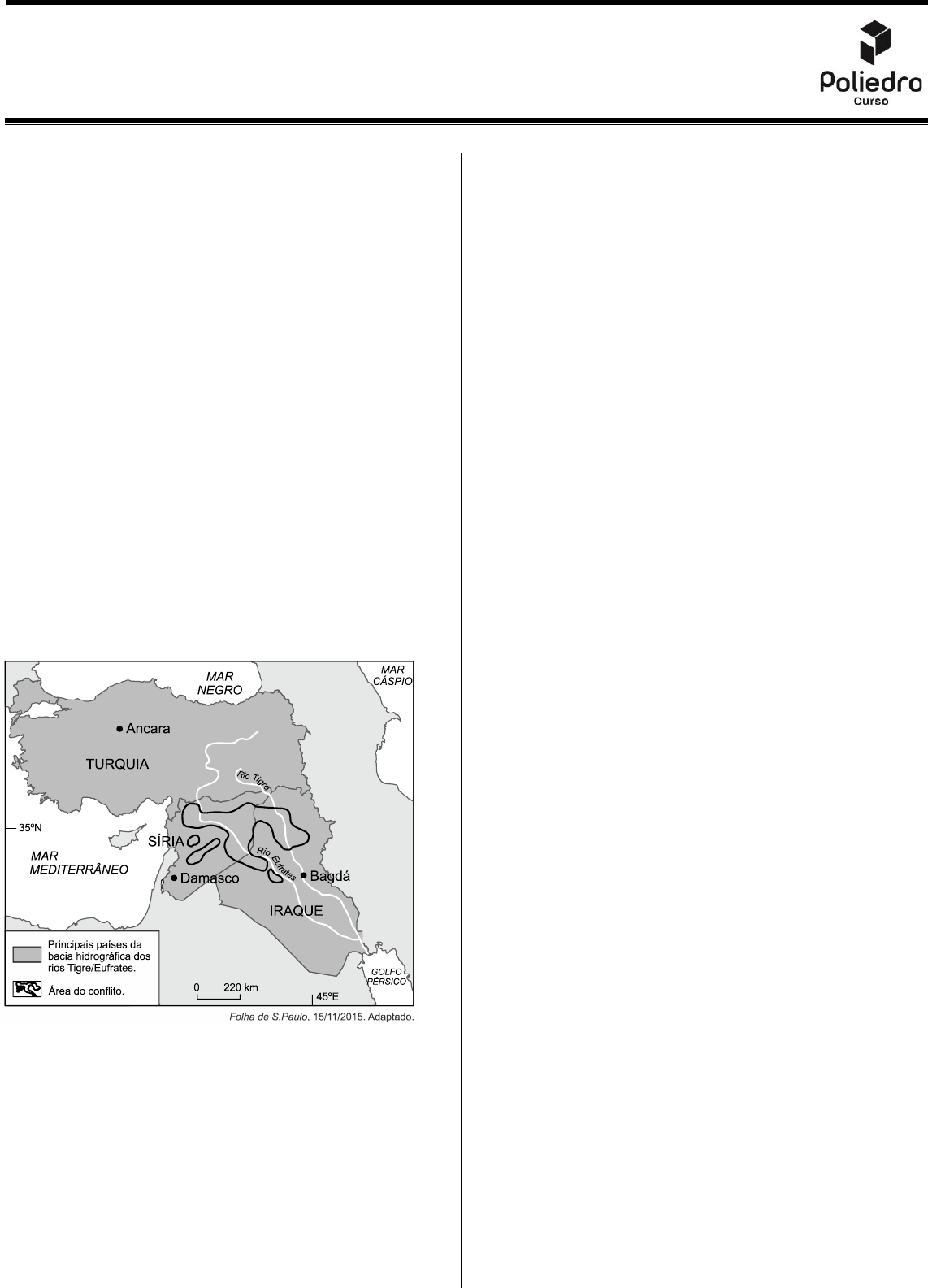 MATERIAL EXTRA – (HISTÓRIA/FRENTE 2) Lista de Exercícios Extra Aula 2 – Antiguidade Oriental Prof. Ferraro Página 1 de 2 1. (Enem 2020) Sexto rei sumério (governante entre os séculos XVIII e XVII a.C.) e nascido em Babel, “Khammu-rabi” (pronúncia em babilônio) foi fundador do I Império Babilônico (correspondente ao atual Iraque), unificando amplamente o mundo mesopotâmico, unindo os semitas e os sumérios e levando a Babilônia ao máximo esplendor. O nome de Hamurabi permanece indissociavelmente ligado ao código jurídico tido como o mais remoto já descoberto: o Código de Hamurabi. O legislador babilônico consolidou a tradição jurídica, harmonizou os costumes e estendeu o direito e a lei a todos os súditos. Disponível em: www.direitoshumanos.usp.br. Acesso em: 12 fev. 2013 (adaptado). Nesse contexto de organização da vida social, as leis contidas no Código citado tinham o sentido de a) assegurar garantias individuais aos cidadãos livres. b) tipificar regras referentes aos atos dignos de punição. c) conceder benefícios de indulto aos prisioneiros de guerra. d) promover distribuição de terras aos desempregados urbanos. e) conferir prerrogativas políticas aos descendentes de estrangeiros. 2. (Fuvest 2016) Considere este mapa, que representa uma região com histórico de migrações e disputas territoriais e que já abrigou, desde antes da Era Cristã, várias civilizações. a) Mencione duas características da bacia hidrográfica dos rios Tigre/Eufrates, relacionando-as com sua ocupação na Antiguidade. Justifique. b) Identifique um importante conflito que, atualmente, ocorre na área indicada no mapa e apresente uma motivação político-religiosa para esse conflito. 3. (Fuvest 2020) Ao primeiro brilho da alvorada chegou do horizonte uma nuvem negra, que era conduzida [pelo] senhor da tempestade (...). Surgiram então os deuses do abismo; Nergal destruiu as barragens que represavam as águas do inferno; Ninurta, o deus da guerra, pôs abaixo os diques (...). Por seis dias e seis noites os ventos sopraram; enxurradas, inundações e torrentes assolaram o mundo; a tempestade e o dilúvio explodiam em fúria como dois exércitos em guerra. Na alvorada do sétimo dia o temporal (...) amainou (...) o dilúvio serenou (...) toda a humanidade havia virado argila (...). Na montanha de Nisir o barco ficou preso (...). Na alvorada do sétimo dia eu soltei uma pomba e deixei que se fosse. Ela voou para longe, mas, não encontrando um lugar para pousar, retornou. Então soltei um corvo. A ave viu que as águas haviam abaixado; ela comeu, (...) grasnou e não mais voltou para o barco. Eu então abri todas as portas e janelas, expondo a nave aos quatro ventos. Preparei um sacrifício e derramei vinho sobre o topo da montanha em oferenda aos deuses (...). A Epopeia de Gilgamesh, São Paulo: Martins Fontes, 2001. Com base no texto, registrado aproximadamente no século VII a.C. e que se refere a um antigo mito da Mesopotâmia, bem como em seus conhecimentos, é possível dizer que a sociedade descrita era a) mercantil, pacífica, politeísta e centralizada. b) agrária, militarizada, monoteísta e democrática. c) manufatureira, naval, monoteísta e federalizada. d) mercantil, guerreira, monoteísta e federalizada. e) agrária, guerreira, politeísta e centralizada. 4. (Uece 2020) Associe corretamente os povos da mesopotâmia, apresentados a seguir, com suas respectivas características e/ou realizações, numerando a Coluna II de acordo com a Coluna I: Coluna I 1. Sumérios 2. Babilônios 3. Assírios 4. Caldeus Coluna II ( ) Atingiram seu apogeu em 587 a.C., quando Nabucodonosor conquistou Jerusalém. ( ) Eram excelentes construtores de canais de irrigação e desenvolveram a escrita cuneiforme. ( ) Desenvolveram um calendário preciso e registraram um código de leis. ( ) Consideravam a guerra a principal força social e desenvolveram uma cultura militar. A sequência correta, de cima para baixo, é: a) 2, 3, 4, 1. b) 1, 2, 3, 4. c) 3, 4, 1, 2. d) 4, 1, 2, 3. 5. (Ufsc 2019) Ao longo da história, as relações entre os seres humanos e o meio ambiente caracterizaram-se por uma intensa e contínua exploração dos mais diversos recursos naturais. Entre as diferentes possibilidades, os rios são expoentes da efetiva relação entre a humanidade e o meio natural. Sobre as relações entre as diferentes sociedades e os rios ao longo da história, é correto afirmar que: 01) na antiguidade, a regularidade das cheias dos rios Tigre e Eufrates foi decisiva para a maior estabilidade econômica e política na Mesopotâmia em relação às demais sociedades orientais, como o Egito. 02) entre os séculos XVII e XVIII, com a descoberta de jazidas de ouro em locais distantes do litoral brasileiro, foram organizadas bandeiras de Página 2 de 2 comércio, conhecidas como monções, que utilizavam os rios como meio de transporte e comunicação. 04) o projeto de transposição do Rio São Francisco teve como objetivo a ampliação de redes de abastecimento e irrigação às áreas mais secas do nordeste brasileiro; o projeto contou com o efetivo apoio dos principais movimentos ambientalistas e tornou-se unanimidade entre as diversas lideranças regionais. 08) em Santa Catarina, muitas colônias de imigrantes europeus foram instaladas nos vales de rios, o que favorecia a comunicação e o transporte de produtos. 16) os maiores rios do Brasil sempre foram utilizados como via de transporte, bem como para o abastecimento de água potável, por isso sempre houve grande cuidado por parte das populações ribeirinhas e do poder público para evitar a sua poluição. 32) no Brasil, é notória a capacidade de gerar energia de usinas hidrelétricas, o que torna possível grandes projetos, tais como o de Belo Monte, no Rio Madeira, os quais causam pequeno impacto ambiental. 6. (Uece 2019) No século VIII a.C. os fenícios protagonizaram uma intensa movimentação no Mar Mediterrâneo ao la