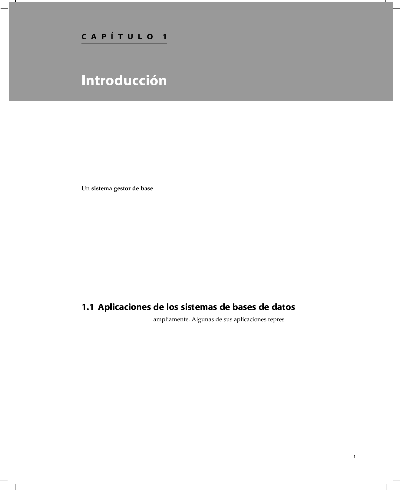 C A P Í T U L O 1 Introducción Un sistema gestor de bases de datos (SGBD) consiste en una colección de datos interrelacionados y un conjunto de programas para acceder a dichos datos. La colección de datos, normalmente denominada base de datos, contiene información relevante para una empresa. El objetivo principal de un SGBD es proporcionar una forma de almacenar y recuperar la información de una base de datos de manera que sea tanto práctica como eficiente. Los sistemas de bases de datos se diseñan para gestionar grandes cantidades de información. La gestión de los datos implica tanto la definición de estructuras para almacenar la información como la provisión de mecanismos para la manipulación de la información. Además, los sistemas de bases de datos deben garantizar la fiabilidad de la información almacenada, a pesar de las caídas del sistema o de los intentos de acceso no autorizados. Si los datos van a ser compartidos entre diferentes usuarios, el sistema debe evitar posibles resultados anómalos. Dado que la información es tan importante en la mayoría de las organizaciones, los científicos infor- máticos han desarrollado una gran cuerpo de conceptos y técnicas para la gestión de los datos. Estos conceptos y técnicas constituyen el objetivo central de este libro. En este capítulo se presenta una breve introducción a los principios de los sistemas de bases de datos. 1.1 Aplicaciones de los sistemas de bases de datos Las bases de datos se usan ampliamente. Algunas de sus aplicaciones representativas son: • Banca: para información de los clientes, cuentas, préstamos y transacciones bancarias. • Líneas aéreas: para reservas e información de horarios. Las líneas aéreas fueron de las primeras en usar las bases de datos de forma distribuida geográficamente. • Universidades: para información de los estudiantes, matrículas en las asignaturas y cursos. • Transacciones de tarjetas de crédito: para compras con tarjeta de crédito y la generación de los ex- tractos mensuales. • Telecomunicaciones: para guardar un registro de las llamadas realizadas, generar las facturas men- suales, mantener el saldo de las tarjetas telefónicas de prepago y para almacenar información sobre las redes de comunicaciones. • Finanzas: para almacenar información sobre compañías tenedoras, ventas y compras de produc- tos financieros, como acciones y bonos; también para almacenar datos del mercado en tiempo real para permitir a los clientes la compraventa en línea y a la compañía la compraventa automática. • Ventas: para información de clientes, productos y compras. 1 2 Capítulo 1 Introducción • Comercio en línea: para los datos de ventas ya mencionados y para el seguimiento de los pedidos Web, generación de listas de recomendaciones y mantenimiento de evaluaciones de productos en línea. • Producción: para la gestión de la cadena de proveedores y para el seguimiento de la producción de artículos en las factorías, inventarios en los almacenes y pedidos. • Recursos humanos: para información sobre los empleados, salarios, impuestos sobre los sueldos y prestaciones sociales, y para la generación de las nóminas. Como muestra esta lista, las bases de datos forman una parte esencial de casi todas las empresas actuales. Durante las últimas cuatro décadas del siglo veinte, el uso de las bases de datos creció en todas las empresas. En los primeros días, muy pocas personas interactuaban directamente con los sistemas de ba- ses de datos, aunque sin darse cuenta interactuaban indirectamente con bases de datos—con informes impresos como los extractos de las tarjetas de crédito, o mediante agentes como los cajeros de los bancos y los agentes de reservas de las líneas aéreas. Después vinieron los cajeros automáticos y permitieron a los usuarios interactuar directamente con las bases de datos. Las interfaces telefónicas con las compu- tadoras (sistemas de respuesta vocal interactiva) también permitieron a los usuarios tratar directamente con las bases de datos—la persona que llamaba podía marcar un número y pulsar las teclas del teléfono para introducir información o para seleccionar opciones alternativas, para conocer las horas de llegada o salida de los vuelos, por ejemplo, o para matricularse de asignaturas en una universidad. La revolución de Internet a finales de los años noventa aumentó significativamente el acceso directo del usuario a las bases de datos. Las organizaciones convirtieron muchas de sus interfaces telefónicas a las bases de datos en interfaces Web, y dejaron disponibles en línea muchos servicios. Por ejemplo, cuando se accede a una librería en línea y se busca en una colección de libros o de música, se está accediendo a datos almacenados en una base de datos. Cuando se realiza un pedido en línea, el pedido se almacena en una base de datos. Cuando se accede al sitio Web de un banco y se consultan el estado de la cuenta y los movimientos, la información se recupera del sistema de bases de datos del banco. Cuando se accede a un sitio Web, puede que se recupere información personal de una base de datos para seleccionar los anuncios que se deben mostrar. Más aún, los datos sobre los accesos Web pueden almacenarse en una base de datos Así, aunque las interfaces de usuario ocultan los detalles del acceso a las bases de datos, y la mayoría de la gente ni siquiera es consciente de que están interactuando con una base de datos, el acceso a las bases de datos forma actualmente una parte esencial de la vida de casi todas las personas. La importancia de los sistemas de bases de datos se puede juzgar de otra forma—actualmente, los fabricantes de sistemas de bases de datos como Oracle están entre las mayores compañías de software del mundo, y los sistemas de bases de datos forman una parte importante de la línea de productos de compañías más diversificadas como Microsoft e IBM. 1.2 Propósito de los siste