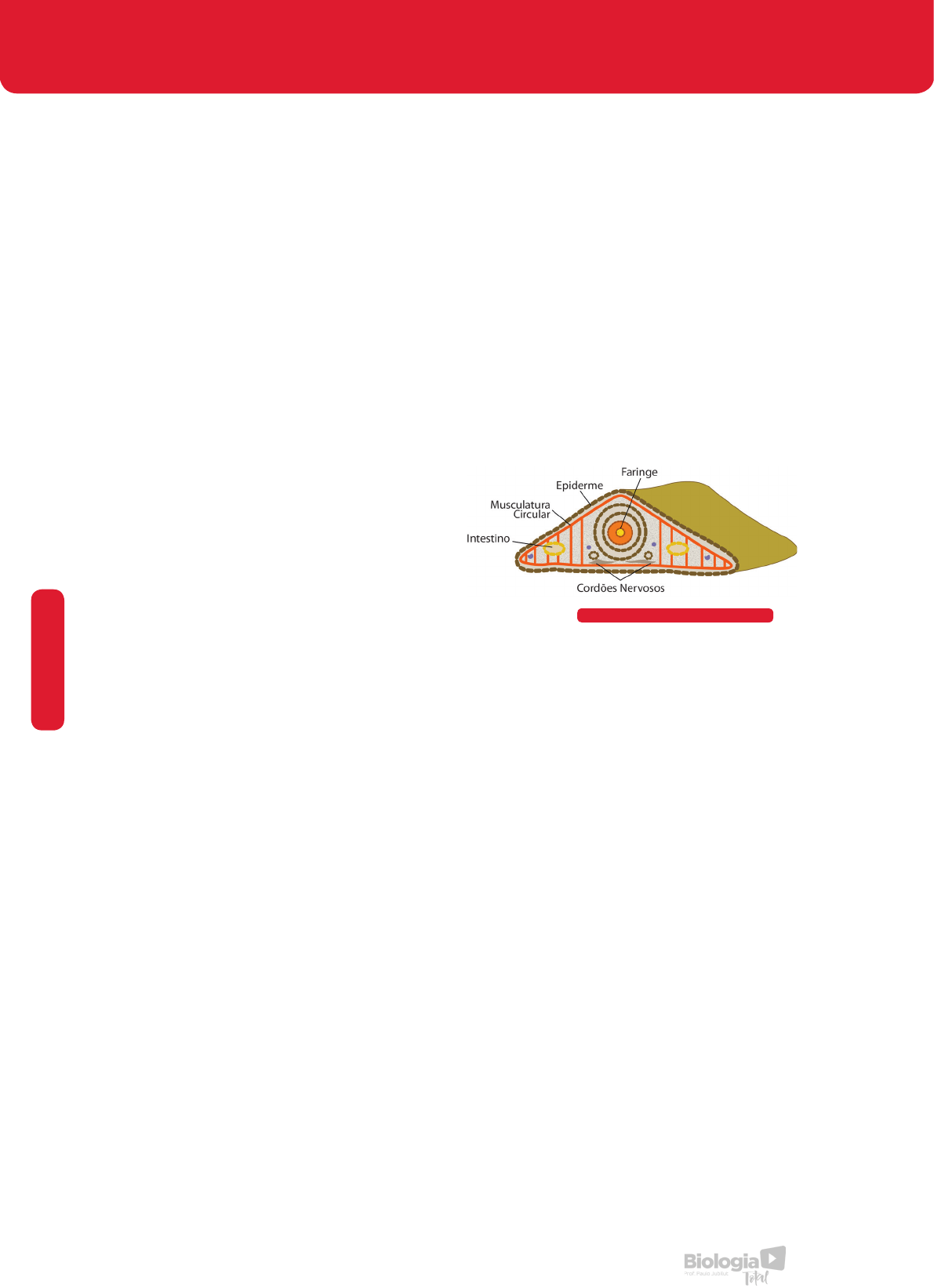 ZO O LO G IA 20 FILO PLATYHELMINTHES Corte transversal de uma planária O filo Platyhelminthes (do grego, platy = achatado; helminthes = verme) contém os animais conhecidos como vermes achatados por terem o corpo mole e fino. Aliás, o termo “verme” é empregado popularmente para designar os animais desprovidos de patas e que apresentam o corpo alongado. No caso dos platelmintos, a essas características soma-se o fato de o corpo lembrar uma fita, pois é achatado no sentido dorsoventral. Os representantes de vida livre podem ser encontrados na água doce ou salgada ou mesmo em lugares úmidos na terra. Há muitos representantes parasitas, encontrados aderidos à superfície exterior do corpo do hospedeiro (ectoparasitas) ou habitando o interior de seu organismo (endoparasitas). Muitos são causadores de sérias doenças ao homem. Entre os platelmintos de vida livre, a grande maioria vive no mar. Entre os organismos de água doce e terrestres há representantes grandes e de cores brilhantes. São conhecidos popularmente como planárias, com destaque para a aquática Dugesia e a terrestre Geoplana. CARACTERÍSTICAS GERAIS E FISIOLOGIA São animais triblásticos, acelomados, com simetria bilateral, protostômios e neuromiários. Os platelmintos são os primeiros animais da escala zoológica a apresentarem simetria bilateral, isto é, seu corpo pode ser dividido em duas metades simétricas. A simetria bilateral está relacionada diretamente com a capacidade de movimentação do animal. A parte do corpo que primeiro entra em contato com o ambiente (extremidade anterior) contém a maioria dos órgãos sensoriais e difere da extremidade oposta (posterior). Como exemplo de platelminto podemos escolher a planária, organismo de vida livre encontradas geralmente em água doce, vivendo no fundo de lagoas ou riachos, sob pedras, folhas e galhos. O corpo é coberto por uma epiderme simples e lisa na parte dorsal e ciliada, com células glandulares, na ventral. Os cílios auxiliam na locomoção na água. Logo abaixo da epiderme, existem camadas de fibras musculares circulares e longitudinais, responsáveis pelos movimentos do animal. Os espaços existentes entre os músculos e órgãos internos são preenchidos por um parênquima formado por células pouco compactas. Não existe, portanto, celoma. O sistema digestivo é incompleto, formado pela boca, faringe e intestino bastante ramificado sem ânus. A boca, situada na extremidade da faringe, pode ser evertida formando uma probóscide para capturar os alimentos, está localizada ventralmente, quase na metade do corpo. As planárias são carnívoras, alimentando- se de outros pequenos animais. O alimento é parcialmente digerido no interior do intestino por enzimas secretadas por células glandulares existentes na gastroderme. As substâncias resultantes são absorvidas pelas células da gastroderme, que completam a digestão. A digestão, portanto é extra e intracelular. As substâncias resultantes da digestão difundem- se através do intestino para as outras células do corpo. Os resíduos da digestão são eliminados para o exterior pela boca. ZO O LO G IA 21www.biologiatotal.com.br CLASSIFICAÇÃO Existem aproximadamente 13 mil espécies descritas no filo Platyhelminthes, divididas em três classes. O sistema excretor, chamado protonefridial, é formado por dois anais longitudinais situados ao longo do corpo, os quais se comunicam com uma rede de pequenos canais que se ramificam pelo corpo, em cujas extremidades encontram- se as células-flama ou solenócitos. Essas células possuem um canal contendo um tufo de flagelos, que se movimentam semelhante à chama de uma vela, daí o nome que receberam. Esse sistema é encarregado de eliminar o excesso de água e de resíduos nitrogenados do catabolismo produzidos pelas células de corpo. Faringe evertida da planária Células-flama – estruturas excretoras dos platelmintos A planária e as trocas gasosas Reprodução sexuada em planária O sistema nervoso é formado por um par de gânglios cerebroides unidos, situados na cabeça, do qual partem pequenas ramificações para os ocelos, e dois cordões nervosos longitudinais, um de cada lado, que se estendem ao longo do corpo emitindo nervos periféricos, e se comunicam entre si por nervos transversais. Os ocelos são sensíveis à luz, mas não formam imagens. As partes laterais da cabeça possuem quimiorreceptores para o gosto e olfato. As planárias são hermafroditas. A fecundação é interna e cruzada. Duas planárias se unem pela parte ventral, quando os espermatozoides de uma são injetados na outra e vice-versa. As planárias também podem se reproduzir assexuadamente por laceração. Ela se divide ao meio, longitudinalmente, e cada metade regenera uma nova planária inteira. Experiências demonstraram que planárias possuem alta capacidade de regeneração. Planária – Dugesia tigrina Classe Turbellaria – reúne os platelmintos de vida livre, conhecidos popularmente como planárias, devido ao seu corpo achatado. Laceração em planária As trocas gasosas ocorrem por difusão direta através da epiderme, não existindo órgãos respiratórios. Os gases difundem-se diretamente de célula a célula, não havendo líquido circulatório. Após a fecundação, formam-se os ovos que são eliminados para o meio externo, onde ocorre o desenvolvimento e eclosão de novas planárias jovens. O desenvolvimento é direto. ZO O LO G IA 22 Classe Trematoda – reúne platelmintos parasitas. Algumas espécies são ectoparasitas, isto é, vivem grudadas nas superfícies externas do corpo do hospedeiro. Outras são endoparasitas, vivendo no interior do corpo de animais vertebrados. Classe Cestoda – aqui se reúnem cerca de 2 mil espécies de vermes endoparasitas, as tênias ou solitárias. O nome de solitária deve-se ao fato de que em algumas espécies apenas um único verme parasita o hospedeiro. Uma vez instalada, a tênia libera substâncias que
