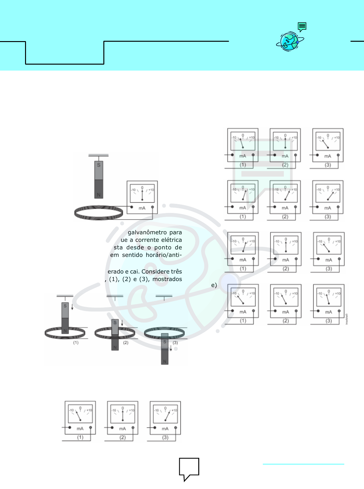 NARRADOUNIVERSO 01. (Ufrgs 2020) A figura representa um ímã suspenso verticalmente ao longo do eixo de uma bobina ligada a um galvanômetro. A deflexão do ponteiro do galvanômetro para direita/esquerda indica que a corrente elétrica fluindo na espira, vista desde o ponto de suspensão do ímã, tem sentido horário/anti- horário. Em t = 0, o ímã é liberado e cai. Considere três instantes de queda, (1), (2) e (3), mostrados abaixo. E s c o l h a a a l t e r n a t i va q u e i n d i c a , aproximadamente, a posição do ponteiro do galvanômetro nos instantes mostrados acima. a) b) c) d) e) 02. (Enem 2020) Em uma usina geradora de energia elétrica, seja através de uma queda- d’água ou através de vapor sob pressão, as pás do gerador são postas a girar. O movimento relativo de um ímã em relação a um conjunto de bobinas produz um fluxo magnético variável através delas, gerando uma diferença de potencial em seus terminais. Durante o funcionamento de um dos geradores, o operador da usina percebeu que houve um aumento inesperado da diferença de potencial elétrico nos terminais das bobinas. 1 www.universonarrado.com.br C-15FRENT E Indução Eletromagnética 2 www.universonarrado.com.br Lições de Física Nessa situação, o aumento do módulo da diferença de potencial obtida nos terminais das bobinas resulta do aumento do(a) a) intervalo de tempo em que as bobinas imersas no campo magnético externo, por meio de uma diminuição de velocidade no eixo de rotação do gerador. magnético através das bobinas, por meio de um aumento em sua área interna exposta ao campo magnético aplicado. c) intensidade do campo magnético no qual as bobinas estão imersas, por meio de aplicação de campos magnéticos mais intensos. d) rapidez com que o magnético varia através das bobinas, por meio de um aumento em sua velocidade angular. e) resistência interna do condutor que constitui as bobinas, por meio de um aumento na espessura dos terminais. 03. (Ufrgs 2019) O fogão mostrado na figura 1 abaixo não produz chamas nem propaga calor. O cozimento ou aquecimento dos alimentos deve ser feito em panelas de ferro ou de aço e ocorre devido à existência de campos magnéticos alternados, produzidos em bobinas, conforme representado no esquema da figura 2. Os campos magnéticos penetram na base das panelas, criando correntes elétricas que as aquecem. Assinale a alternativa que preenche corretamente as lacunas do enunciado abaixo, na ordem em que aparecem. O processo físico que fundamenta essa aplicação tecnológica é conhecido como __________ e é regido pela lei de __________. a) convecção – Faraday-Lenz b) indução – Faraday-Lenz c) indução – Ampère d) radiação – Gauss e) radiação – Ampère 3 www.universonarrado.com.br Frente: C-15 NARRADOUNIVERSO 04. (Epcar (Afa) 2019) Uma espira condutora E está em repouso próxima a um fio retilíneo longo AB de um circuito elétrico constituído de uma bateria e de um reostato R, onde flui uma corrente i, conforme ilustrado na figura abaixo. Considerando exclusivamente os efeitos eletromagnéticos, pode-se afirmar que a espira será a) repelida pelo fio AB se a resistência elétrica do reostato aumentar. b) atraída pelo fio AB se a resistência elétrica do reostato aumentar. c) sempre atraída pelo fio AB independentemente de a resistência elétrica do reostato aumentar ou diminuir. d) deslocada paralelamente ao f io AB independentemente de a resistência elétrica do reostato aumentar ou diminuir. 05. (Eear 2018) Uma espira retangular de 10 20cm cm× foi posicionada e mantida imóvel de forma que um campo magnético uniforme, de intensidade B T= 100 , ficasse normal à área interna da espira, conforme figura a seguir. Neste caso, o valor da Força Eletromotriz Induzida nos terminais A e B da espira vale ____ V. a) 0 00, . b) 0 02, . c) 0 20, d) 2 00, 06. (Udesc 2018) Na figura abaixo, a barra feita de material condutor desliza sem atrito, com velocidade constante de 6 0, cm s para a direita, sobre trilhos de material também condutor, no plano horizontal. A barra partiu da extremidade esquerda do trilho em t s= 0 . Nesta região, há um campo magnético uniforme de intensidade de 10 4− T, como mostra a Figura. Assinale a alternativa que corresponde ao valor absoluto da tensão induzida, em microvolts, entre os pontos C e D da barra. a) 600 b) 6 000. c) 0 060, d) 60 e) 0 60, 07. (Enem 2018) A tecnologia de comunicação da etiqueta RFID (chamada de etiqueta inteligente) é usada há anos para rastrear gado, vagões de trem, bagagem aérea e carros nos pedágios. Um modelo mais barato dessas etiquetas pode funcionar sem baterias e é constituído por três componentes: um microprocessador de silício; uma bobina de metal, feita de cobre ou de alumínio, que é enrolada em um padrão circular; e um encapsulador, que é um material de vidro ou polímero envolvendo o microprocessador e a bobina. Na presença de um campo de radiofrequência gerado pelo leitor, a etiqueta transmite sinais. A distância de leitura é determinada pelo tamanho da bobina e pela potência da onda de rádio emitida pelo leitor. Disponível em: http:eleletronicos.hsw.uol.com.br. Acesso em: 27 fev. 2012 (adaptado). A etiqueta funciona sem pilhas porque o campo a) elétrico da onda de rádio agita elétrons da bobina. b) elétrico da onda de rádio cria uma tensão na bobina. c) magnético da onda de rádio induz corrente na bobina. d) magnético da onda de rádio aquece os fios da bobina. e) magnético da onda de rádio diminui a ressonância no interior da bobina. 4 www.universonarrado.com.br Lições de Física 08. (Upf 2018) A indução eletromagnética é um fenômeno que se encontra presente em diversos equipamentos que utilizamos cotidianamente. Ela é utilizada para gerar energia elétrica e seu princípio físico consiste no aparecimento de uma força eletromotriz entre os extremos de um fio condutor. Para que essa força eletromot