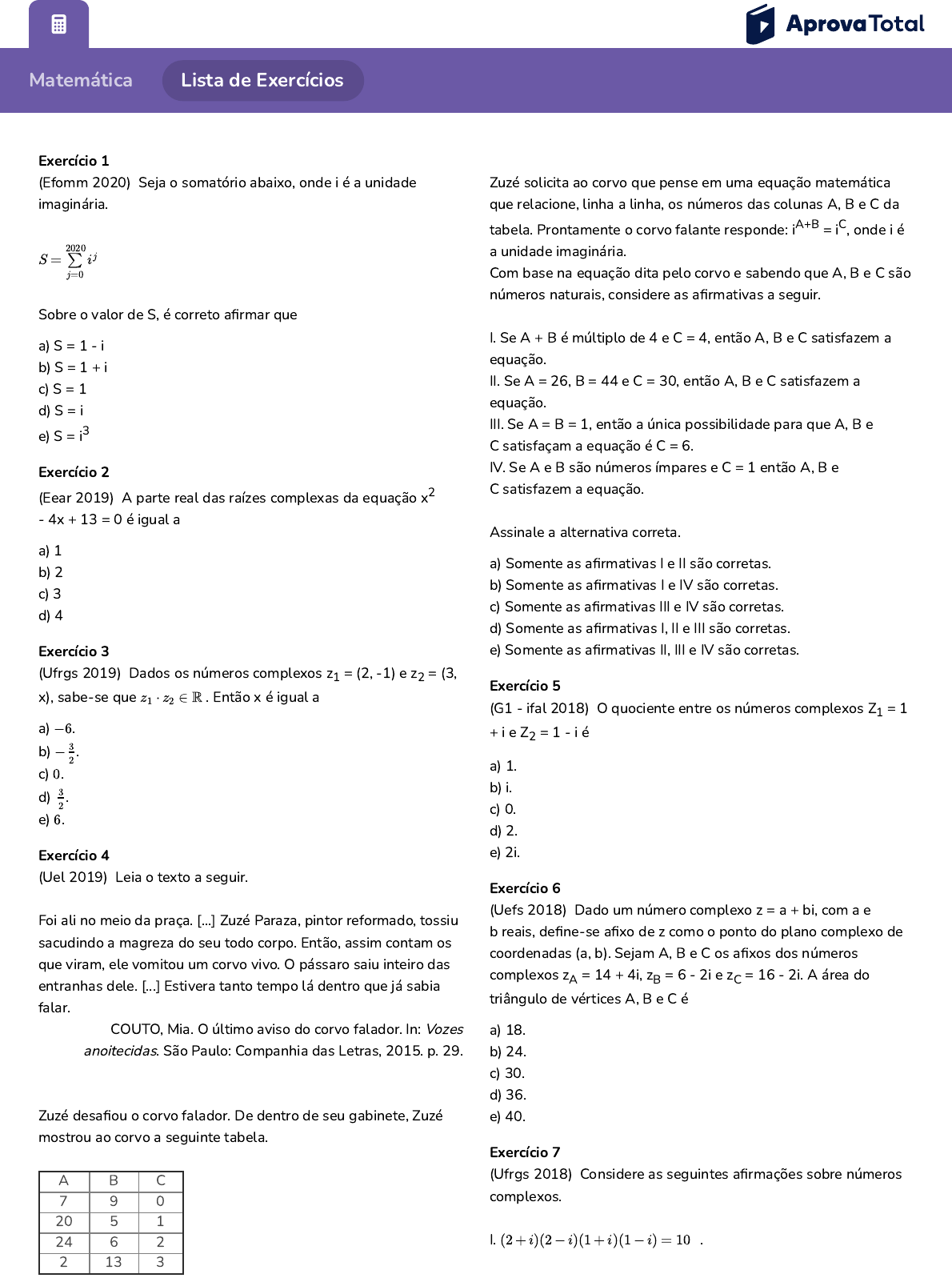 (Uefs 2018) Dado um número complexo z = a + bi, com a e