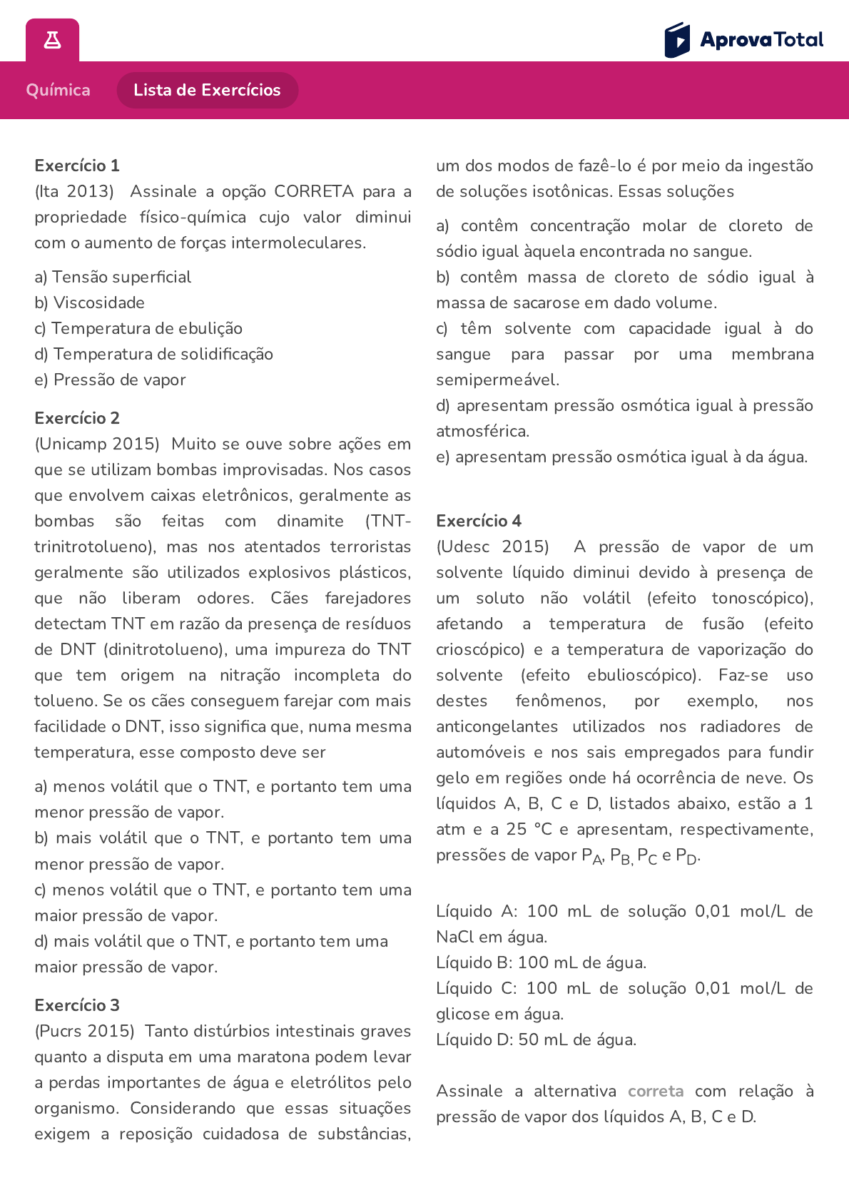 https://aprovatotal.com.br/medio/quimica/exercicios/propriedades-coligativas/ex.1-pressao-de-vapor 1/15 Química Lista de Exercícios Exercício 1 (Ita 2013) Assinale a opção CORRETA para a propriedade físico-química cujo valor diminui com o aumento de forças intermoleculares. a) Tensão super�cial b) Viscosidade c) Temperatura de ebulição d) Temperatura de solidi�cação e) Pressão de vapor Exercício 2 (Unicamp 2015) Muito se ouve sobre ações em que se utilizam bombas improvisadas. Nos casos que envolvem caixas eletrônicos, geralmente as bombas são feitas com dinamite (TNT- trinitrotolueno), mas nos atentados terroristas geralmente são utilizados explosivos plásticos, que não liberam odores. Cães farejadores detectam TNT em razão da presença de resíduos de DNT (dinitrotolueno), uma impureza do TNT que tem origem na nitração incompleta do tolueno. Se os cães conseguem farejar com mais facilidade o DNT, isso signi�ca que, numa mesma temperatura, esse composto deve ser a) menos volátil que o TNT, e portanto tem uma menor pressão de vapor. b) mais volátil que o TNT, e portanto tem uma menor pressão de vapor. c) menos volátil que o TNT, e portanto tem uma maior pressão de vapor. d) mais volátil que o TNT, e portanto tem uma maior pressão de vapor. Exercício 3 (Pucrs 2015) Tanto distúrbios intestinais graves quanto a disputa em uma maratona podem levar a perdas importantes de água e eletrólitos pelo organismo. Considerando que essas situações exigem a reposição cuidadosa de substâncias, um dos modos de fazê-lo é por meio da ingestão de soluções isotônicas. Essas soluções a) contêm concentração molar de cloreto de sódio igual àquela encontrada no sangue. b) contêm massa de cloreto de sódio igual à massa de sacarose em dado volume. c) têm solvente com capacidade igual à do sangue para passar por uma membrana semipermeável. d) apresentam pressão osmótica igual à pressão atmosférica. e) apresentam pressão osmótica igual à da água. Exercício 4 (Udesc 2015) A pressão de vapor de um solvente líquido diminui devido à presença de um soluto não volátil (efeito tonoscópico), afetando a temperatura de fusão (efeito crioscópico) e a temperatura de vaporização do solvente (efeito ebulioscópico). Faz-se uso destes fenômenos, por exemplo, nos anticongelantes utilizados nos radiadores de automóveis e nos sais empregados para fundir gelo em regiões onde há ocorrência de neve. Os líquidos A, B, C e D, listados abaixo, estão a 1 atm e a 25 °C e apresentam, respectivamente, pressões de vapor PA, PB, PC e PD . Líquido A: 100 mL de solução 0,01 mol/L de NaCl em água. Líquido B: 100 mL de água. Líquido C: 100 mL de solução 0,01 mol/L de glicose em água. Líquido D: 50 mL de água. Assinale a alternativa correta com relação à pressão de vapor dos líquidos A, B, C e D. https://aprovatotal.com.br/medio/quimica/exercicios/propriedades-coligativas/ex.1-pressao-de-vapor 2/15 a) PD = PB > PC > PA b) PA > PC > PB > PD . c) PA = PC > PD > PB d) PD > PB >PA = PC e) PD > PA = PC > PB Exercício 5 (Upe 2015) Os grãos de milho são ricos em amido e água. Os grãos de “milho para pipoca” têm menos água, e o seu pericarpo tem uma casca mais resistente que os grãos de milho verde. Na produção da pipoca, a temperatura atinge valores acima de 200 °C havendo transferência de calor tanto para a água quanto para o amido, culminando com o pipocar característico. O amido, antes sólido, com o aquecimento, começa a virar uma espécie de gelatina, aumentando de tamanho. Com o estouro, há liberação da água, e o amido gelatinizado, em contato com o ar, se transforma na espuma branca que comemos. Assinale a alternativa que apresenta os fenômenos observados na preparação da pipoca, conforme descrição no texto. a) Ebulição da água e sublimação do amido b) Vaporização da água e combustão do amido c) Vaporização da água e modi�cação química do amido d) Redução da pressão de vapor da água e fusão do amido e) Decomposição da água e do amido, liberando os gases que estouram o grão Exercício 6 (Ufpr 2012) Boiar no Mar Morto: luxo sem igual É no ponto mais baixo da Terra que a Jordânia guarda seu maior segredo: o Mar Morto. Boiar nas águas salgadas do lago formado numa depressão, a 400 metros abaixo do nível do mar, é a experiência mais inusitada e necessária dessa jornada, mas pode estar com os anos contados. A superfície do Mar Morto tem encolhido cerca de 1 metro por ano e pode sumir completamente até 2050. (Camila Anauate. O Estado de São Paulo. Disponível em <http://www.estadao.com.br/noticias/suplementos,bo no-mar-morto-luxo-semigual, 175377,0.htm>. Acessado em 08/08/2011) A alta concentração salina altera uma propriedade da água pura, tornando fácil boiar no Mar Morto. Assinale a alternativa correspondente a essa alteração. a) Aumento da tensão super�cial. b) Aumento da densidade. c) Aumento da pressão de vapor. d) Aumento da temperatura de ebulição. e) Aumento da viscosidade. Exercício 7 (Ufsj 2012) Considere as soluções aquosas abaixo a uma pressão de 1,0 atm Solução A: 0,6 mol/L de glicose. Solução B: 0,1 mol/L de ácido nítrico. Solução C: 0,2 mol/L de cloreto de magnésio. Sobre essas soluções, é CORRETO a�rmar que a) as soluções A e C apresentam o mesmo ponto de congelamento. b) as três soluções apresentam ponto de ebulição abaixo de 100°C. c) a solução B apresenta o maior ponto de ebulição. d) a solução C é a que apresenta menor pressão de vapor. Exercício 8 (Ita 2013) Assinale a alternativa CORRETA para o líquido puro com a maior pressão de vapor a 25°C. a) n-Butano, C4H10 b) n-Octano, C8H18 https://aprovatotal.com.br/medio/quimica/exercicios/propriedades-coligativas/ex.1-pressao-de-vapor 3/15 c) Propanol, C3H7OH d) Glicerol, C3H5(OH)3 e) Água, H2O Exercício 9 (Uern 2015) Um estudante de química, realizando um exper