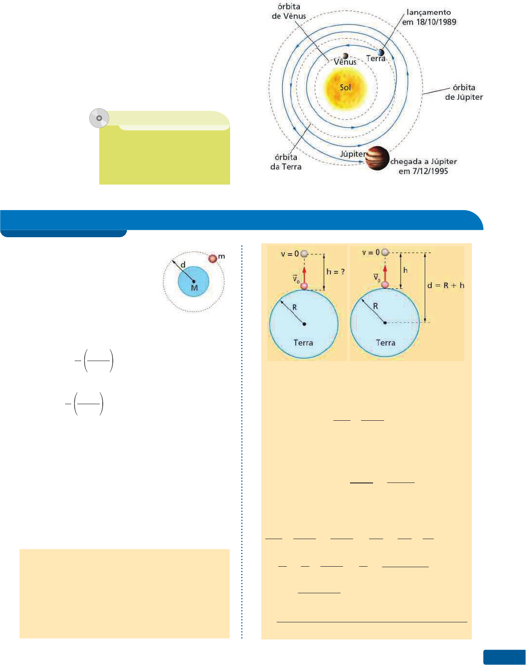 Gravitação 485 O efeito estilingue Quando uma nave espacial é enviada a um planeta mui- to distante, em vez de ir diretamente ao planeta ela con- torna algumas vezes planetas intermediários. Por exemplo, a nave exploratória Galileu, lançada em outubro de 1989, com destino a Júpiter, descreveu a trajetória indicada na fi gura 33, contornando uma vez o planeta Vênus e duas vezes a Terra, antes de se dirigir a Júpiter. A cada vez que a sonda contornou um planeta ela ganhou energia e, assim, economizou combustível. PrOCUre nO Cd Veja, no CD, mais detalhes de como ocorre o efeito estilingue. Figura 33. exercícios de Aplicação 53. Um satélite de massa m gira em torno de um planeta esférico e homogêneo de massa M, com órbita circular de raio d. a) Qual é a energia potencial do satélite? b) Mostre que a energia cinética do satélite é dada por E C = 1 2 GMm d . c) Mostre que a energia mecânica do satélite é E = – 1 2 GMm d . 54. Um satélite artificial de massa m = 500 kg gira em torno da Terra, com órbita circular de raio 8 · 106 m. São dados: massa da Terra = 6 · 1024 kg; raio da Terra = 6,4 · 106 m e G = 6,7 · 10–11 (SI). Calcule: a) a energia potencial do satélite; b) a energia cinética do satélite; c) a energia mecânica do satélite. 55. Um projétil é lançado verticalmente a partir de um ponto da superfície da Terra, com velocidade inicial de módulo v 0 = 6,5 · 103 m/s. Qual é a altura máxima h atingida pelo projétil? São dados: raio da Terra = 6,4 · 106 m; massa da Terra = 6,0 · 1024 kg. Resolu•‹o: Sendo M a massa da Terra e m a massa do projétil, a energia mecânica inicial do projétil é: E i = E Ci + E Pi = mv2 0 2 – GMm R No ponto mais alto a velocidade do projétil será nula; portanto, nesse ponto só haverá energia potencial: E f = E Cf + E Pf = 0 – GMm d = –GMm d Como a energia mecânica é constante, devemos ter E i = E f : mv2 0 2 – GMm R = GMm d ⇒ GM d = GM R – v2 0 2 ⇒ ⇒ 1 d = 1 R – v2 0 2GM ⇒ 1 d = 2GM – Rv2 0 2GMR ⇒ ⇒ d = 2GMR 2GM – Rv2 0 = = 2(6,7 · 10–11)(6,0 · 1024)(6,4 · 106) 2(6,7 · 10–11)(6,0 · 1024) – (6,4 · 106)(6,5 · 103)2 IL U ST r A ç õ ES : C O N C EI TO G r A f Capítulo 24486 Terra = 6 · 1024 kg; raio da Terra = 6,4 · 106 m e G = 6,7 · 10–11 (SI). 57. Calcule a velocidade de escape do planeta Terra sabendo que sua massa é 5,98 · 1024 kg, seu raio médio é 6,38 · 106 m e G = 6,67 · 10–11 N · m2/kg2. 58. A velocidade de escape da Terra é 11,2 km/s. Calcule o valor aproximado da velocidade de esca- pe do planeta Urano, sabendo que sua massa é 15 vezes maior que a massa da Terra e o seu raio é 4 vezes maior que o raio da Terra. d ≅ 9,6 · 106 m h = d – R ≅ (9,6 · 106 m) – (6,4 · 106 m) h ≅ 3,2 · 106 m = 3 200 km 56. Um projétil é lançado vertical- mente para cima a partir de um ponto próximo à superfície da Terra, com velocidade inicial v 0 = 7 · 103 m/s. Calcule a altura máxima atingida pelo projétil. São dados: massa da exercícios de reforço 59. (UF-GO) Um satélite de massa 450 kg orbita em torno da Terra, numa trajetória circular de raio r conforme a figura.conforme a figura. a) Determine a altura, h, da órbita do satélite sabendo-se que, nessa órbita, g' = 4 9 g, sendo g a gravidade na superfície da Terra. b) Determine a energia cinética do satélite nessa órbita. c) Determine a energia mecânica total do satéli- te, adotando-se referencial no infinito. 60. Sabendo que a velocidade de escape de um corpo lançado de um dos polos da Terra (desprezando a resistência do ar) é 11,2 km/s e que a aceleração da gravidade ao nível do mar, no mesmo local, vale aproximadamente 9,83 m/s2, determine: (Dados: G = 6,67 · 10–11 N · m2 · kg–2; M = 6,0 · 1024 kg e R = 6,4 · 103 km.) a) a velocidade de escape no planeta Marte, cuja massa e raio valem, respectivamente, 0,11 M e 0,55 R, onde M e R são, respectivamente, a massa e o raio da Terra; b) a aceleração da gravidade nos polos do plane- ta Marte. 61. (UE-PA) Os planetas do Sistema Solar, em seu movimento ao redor do Sol, obedecem às leis de Kepler. Eles percorrem órbitas elípticas nas quais o Sol está em um dos focos. O ponto da órbita mais distante do Sol é chamado de afélio (A) e o ponto mais próximo é chamado de periélio (P). Essas características estão ilustradas na figura abaixo. Analise as afirmativas abaixo sobre o movimento dos planetas ao redor do Sol. I. Se existisse um planeta com o raio médio de sua órbita igual a duas vezes a distância média da Terra ao Sol, o período de revolução desse planeta seria de dois anos. II. No afélio, a energia potencial do sistema é máxima, e parte dela se converte em energia cinética até o periélio. III. A quantidade de movimento de um planeta é maior no periélio do que no afélio. IV. O trabalho realizado sobre um planeta pela força gravitacional, durante uma órbita com- pleta, é nulo. Estão corretas somente as afirmativas: a) I, II e IV b) I e III c) I e IV d) II e III e) II, III e IV IL U ST r A ç õ ES : C O N C EI TO G r A f Gravitação 487 7. Marés Um fato que qualquer pessoa que viva à beira-mar pode perceber facilmente é que as águas do mar têm um movimento periódico de “sobe e desce”: são as marés. Na fi- gura 34a temos a foto da maré baixa em uma praia e na 34b temos a foto da maré alta. Na média, a diferença de nível entre as marés é da ordem de 1 metro. mas há locais da Terra em que essa diferença chega a 15 metros, como na praia de moreré, Bahia. O que ocasiona essa movimentação das águas? Figura 34. Praia de Moreré, Bahia. (a) Maré baixa e (b) maré alta. ZI G k O C H /N A TU r EZ A B r A SI LE Ir A ZI G k O C H /N A TU r EZ A B r A SI LE Ir A PrOCUre nO Cd No CD apresentamos, com detalhes, a explicação sobre o movimento das marés. Figura 36. Figura 35. (a) (b)Antes de Newton publicar sua obra, alguns cientistas já suspeitavam que as marés s