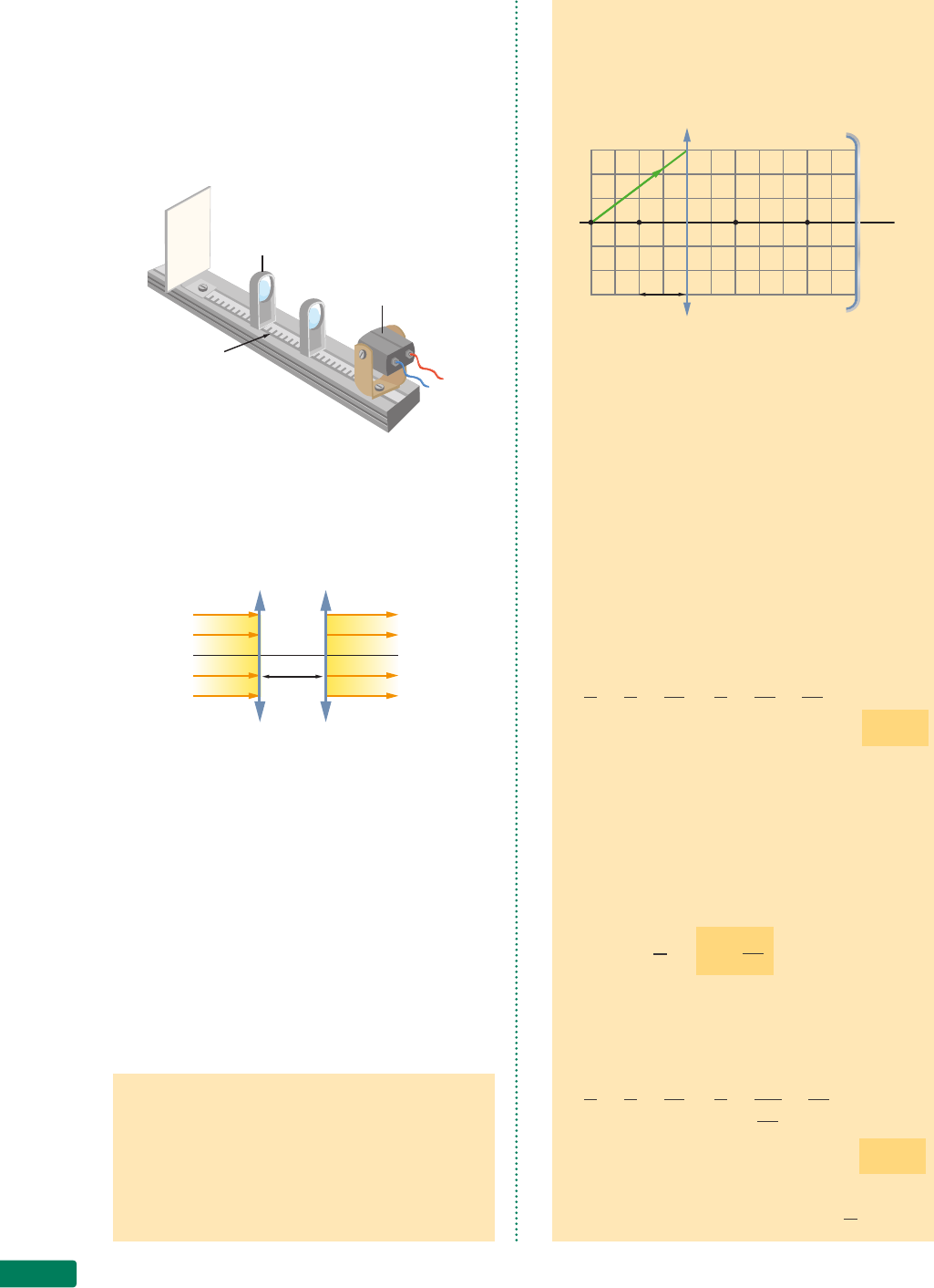 Capítulo 12332 70. Sobre o trilho metálico de um banco óptico, são montadas duas lentes convergentes coaxialmen- te. A primeira delas tem distância focal f 1 = 40 cm e a segunda, f 2 = 15 cm. Qual deve ser a distância entre as duas lentes para que os raios de luz de um feixe cilíndrico incidente na primeira lente, na direção do eixo principal, continuem paralelos ao eixo após emergirem da segunda lente? suporte da lente escala fonte de luz anteparo 71. (U. E. Londrina-PR) Duas lentes delgadas conver- gentes, de distâncias focais f 1 e f 2 , estão a uma distância d, uma da outra. Um feixe de raios paralelos incide na primeira lente e origina um feixe de raios, também paralelos, conforme mos- tra o esquema. d L 1 L 2 Assim, é correta a relação: a) f 1 + f 2 = d d) f 1 – f 2 = d b) f 1 + 2f 2 = d e) f 1 – f 2 > d c) f 1 + f 2 > d 72. (UF-MG) Ao associar duas lentes delgadas de distâncias focais f 1 = 10 cm e f 2 = 40 cm, ambas convergentes, você obtém um sistema equivalen- te a uma lente de convergência: a) 0,125 di d) 12,5 di b) 2,0 di e) 50 di c) 8,0 di refrata-se e determina a imagem conjugada P 1 sobre o eixo principal. Por sua vez, este raio tam- bém incide no espelho, reflete-se e torna a cruzar o eixo principal dando uma segunda imagem P 2 , agora conjugada pelo espelho. V E P r F 1 O F 2 F 3 L f a) Determine a posição de P 1 , imagem do objeto P conjugada pela lente; b) Determine a distância de P 1 ao espelho; c) Determine a posição de P 2 , imagem de P 1 con- jugada pelo espelho; d) Desenhe o trajeto do raio r até refletir-se no espelho e cruzar o eixo principal. Resolu•‹o: O problema poderia ser resolvido apenas traçan- do-se o trajeto do raio r, mas para isso devería- mos usar eixos secundários e focos secundários. A figura ficaria incompreensível. Vamos resolver os itens a, b e c usando a equação de Gauss. a) Para a lente: 1 f = 1 p + 1 p' ⇒ 1 f = 1 2f + 1 p 1 Resolvendo a equação, vamos obter: p1 = 2f Observemos que não é surpresa esse resulta- do, pois o ponto P está sobre o ponto prin- cipal A da lente e sua imagem está no outro ponto principal A'. b) Distância de P 1 ao espelho: Usando a própria figura verificamos que a distância de P 1 ao espelho é: d = f + f 2 ⇒ d = 3f 2 Observemos que P 1 será objeto para o espelho esférico e sua imagem conjugada será P 2 . c) Para o espelho esférico, vamos usar a equação de Gauss: 1 f = 1 p + 1 p' ⇒ 1 f = 1 3f 2 + 1 p 2 Resolvendo a equação vamos obter: p2 = 3f Conclusão: a imagem final P 2 está posicionada a uma distância 3f do espelho e a f 2 da lente. 73. Sobre um banco óptico estão montados, coaxial- mente, um espelho esférico côncavo de distân- cia focal f e uma lente convergente de distância focal f. Um ponto luminoso P foi colocado no eixo principal do sistema a uma distância p = 2f da lente, como mostra a figura a seguir. Do ponto P emana um raio de luz r que incide na lente, z A P t z A P t L u iz A u G u s t O r ib e ir O Lentes esféricas 333 exercícios de reforço d) No traçado do raio de luz r, você pode plotar os pontos P 1 e P 2 e traçar o raio refratado e refletido de tal maneira que ele passe por esses pontos. Pode também usar o conceito de eixo secundário e foco secundário, como foi feito na figura abaixo. V E P r F 1 P 2 O F2 C P1 F3 F s F s L f lado luminoso esteja voltado para o espelho. A distância entre o vértice do espelho e o centro óptico da lente é 4f. 2f 2f luz Podemos afirmar que a imagem final, conjugada pela lente, será: a) do mesmo tamanho que o objeto luminoso e invertida em relação a este. b) do mesmo tamanho que o objeto luminoso e não será invertida em relação a este. c) coincidente com o objeto luminoso. d) menor que o objeto luminoso e invertida em relação a este. e) maior que o objeto luminoso e não será inver- tida em relação a este. 74. Sobre um banco óptico montamos, coaxialmente, um espelho esférico côncavo e uma lente delgada convergente, ambos com a mesma distância f. Perpendicularmente ao eixo principal do siste- ma montamos um objeto semiluminoso, a uma distância focal 2f do espelho esférico, tal que o 75. (ITA-SP) Uma lente A, convergente (f A = 10 cm), é justaposta a outra lente, convergente, B (f B = 5,0 cm). A lente equivalente é: a) divergente e |f| = 3,33 cm. b) divergente e |f| = 5,2 cm. c) convergente e f = 5,2 cm. d) convergente e f = 15 cm. e) convergente e f = 3,33 cm. 76. (Cesgranrio-RJ) Duas lentes delgadas, ∙ 1 e ∙ 2 , de eixos ópticos coincidentes, estão separadas por uma distância d = 10,0 cm (figura). A lente ∙ 1 é convergente e de distância focal f 1 = 30,0 cm. O sistema formado pelas duas lentes é tal que raios paralelos ao eixo óptico incidentes em ∙ 1 continuam nessa mesma direção ao emergir de ∙ 2 (sistema afocal). d ℓ 1 ℓ 2 Qual das opções fornece, então, corretamente, o tipo e a distância focal (em módulo) da lente ∙ 2 ? a) Divergente, 10,0 cm. b) Convergente, 10,0 cm. c) Divergente, 20,0 cm. d) Convergente, 20,0 cm. e) Divergente, 30,0 cm. 77. (U. E. Londrina-PR) Um raio de luz r 1 incide num sistema de duas lentes convergentes, L 1 e L 2 , produzindo um raio emergente r 2 , conforme indicações e medidas do esquema abaixo: 1,0 cm 20 cm r 2 eixo principalC 1 C 2 L 1 L 2 r 1 3,0 cm As distâncias focais das lentes L 1 e L 2 são, respec- tivamente, em cm, iguais a: a) 16 e 4,0 c) 6,0 e 14 e) 3,0 e 2,0 b) 15 e 5,0 d) 5,0 e 15 78. (Fuvest-SP) Um sistema de duas lentes, sendo uma convergente e outra divergente, ambas com distâncias focais iguais a 8 cm, é montado para projetar círculos luminosos sobre um anteparo. iL u st r A ç õ es : zA Pt Capítulo 12334 exercícios de Aprofundamento O diâmetro desses círculos pode ser alterado, variando-se a posição das lentes. Em uma dessas montagens, um feixe de luz, ini- cialmente de raios paralelos e 4 cm de diâmetro, incide sobre a lente convergente, separada da divergente por 8 cm,