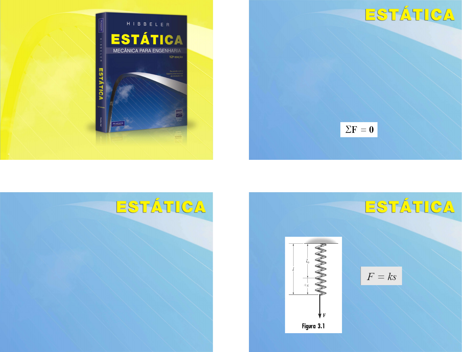 slide 1 © 2011 Pearson Prentice Hall. Todos os direitos reservados. Capítulo 3 Equilíbrio de uma partícula © 2011 Pearson Prentice Hall. Todos os direitos reservados.slide 1 Eng. MSc. Hilário Mendes de Carvalho slide 2 © 2011 Pearson Prentice Hall. Todos os direitos reservados. 3.1 Condição de equilíbrio de uma partícula Uma partícula está em equilíbrio quando está em repouso se originalmente se achava em repouso, ou quando tem velocidade constante se originalmente estava em movimento. Para manter o equilíbrio, é necessário satisfazer a primeira lei do movimento de Newton, segundo a qual a força resultante que atua sobre uma partícula deve ser igual a zero. Essa condição é expressa matematicamente como: (3.1) slide 3 © 2011 Pearson Prentice Hall. Todos os direitos reservados. 3.2 O diagrama do corpo livre Para aplicar a equação de equilíbrio, devemos considerar todas as forças conhecidas e desconhecidas que atuam sobre a partícula. A melhor maneira de fazer isso é pensar na partícula de forma isolada e ‘livre’ de seu entorno. Um esboço mostrando a partícula com todas as forças que atuam sobre ela é chamado diagrama de corpo livre (DCL) da partícula. slide 4 © 2011 Pearson Prentice Hall. Todos os direitos reservados. Molas slide 5 © 2011 Pearson Prentice Hall. Todos os direitos reservados. Cabos e polias Um cabo pode suportar apenas uma força de tração. slide 6 © 2011 Pearson Prentice Hall. Todos os direitos reservados. Exemplo 3.1 A esfera tem massa de 6 kg e está apoiada como mostrado. Desenhe o diagrama de corpo livre da esfera, da corda CE e do nó em C. slide 7 © 2011 Pearson Prentice Hall. Todos os direitos reservados. 3.3 Sistemas de forças coplanares Se uma partícula estiver submetida a um sistema de forças coplanares localizadas no plano x–y, como mostra a Figura 3.4, então cada força poderá ser decomposta em suas componentes i e j. Para o equilíbrio, essas forças precisam ser somadas para produzir uma força resultante zero, ou seja, slide 8 © 2011 Pearson Prentice Hall. Todos os direitos reservados. Exemplo 3.2 Determine a tração nos cabos AB e BC necessária para sustentar o cilindro de 60 kg. slide 9 © 2011 Pearson Prentice Hall. Todos os direitos reservados. Exemplo 3.3 A caixa de 200 kg da figura é suspensa usando as cordas AB e AC. Cada corda pode suportar uma força máxima de 10 kN antes de romper. Se AB sempre permanece horizontal, determine o menor ângulo θ para o qual a caixa pode ser suspensa antes que uma das cordas se rompa slide 10 © 2011 Pearson Prentice Hall. Todos os direitos reservados. 3.4 Sistemas de forças tridimensionais No caso de um sistema de forças tridimensional, como na Figura 3.9, podemos decompor as forças em suas respectivas componentes i, j, k, de modo que slide 11 © 2011 Pearson Prentice Hall. Todos os direitos reservados. Exemplo 3.7 Determine a força desenvolvida em cada cabo usado para suportar a caixa de 40 kN.