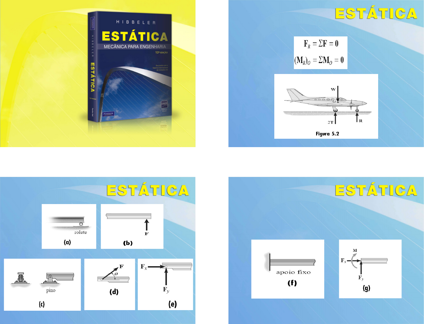 slide 1 © 2011 Pearson Prentice Hall. Todos os direitos reservados. Capítulo 5 Equilíbrio de um corpo rígido © 2011 Pearson Prentice Hall. Todos os direitos reservados.slide 1 slide 2 © 2011 Pearson Prentice Hall. Todos os direitos reservados. 5.1 Condições de equilíbrio do corpo rígido slide 3 © 2011 Pearson Prentice Hall. Todos os direitos reservados. Reações de apoio 5.2 Diagrama de corpo livre slide 4 © 2011 Pearson Prentice Hall. Todos os direitos reservados. A maneira mais restritiva de apoiar a viga seria usar um apoio fixo, como mostra a (Figura 5.3f). Esse apoio impedirá tanto a translação quanto a rotação da viga. slide 5 © 2011 Pearson Prentice Hall. Todos os direitos reservados. Tabela 5.1 Apoios para corpos rígidos sujeitos a sistemas de forças bidimensionais slide 6 © 2011 Pearson Prentice Hall. Todos os direitos reservados. slide 7 © 2011 Pearson Prentice Hall. Todos os direitos reservados. slide 8 © 2011 Pearson Prentice Hall. Todos os direitos reservados. slide 9 © 2011 Pearson Prentice Hall. Todos os direitos reservados. slide 10 © 2011 Pearson Prentice Hall. Todos os direitos reservados. Modelos idealizados slide 11 © 2011 Pearson Prentice Hall. Todos os direitos reservados. Exemplo 5.1 Desenhe um diagrama de corpo livre da viga uniforme mostrada. A viga possui uma massa de 100 kg. slide 12 © 2011 Pearson Prentice Hall. Todos os direitos reservados. 5.3 Equações de equilíbrio Quando o corpo está sujeito a um sistema de forças, todas situadas no plano x–y, então as forças podem ser decompostas em suas componentes x e y. Consequentemente, as condições para o equilíbrio em duas dimensões são: (5.2) slide 13 © 2011 Pearson Prentice Hall. Todos os direitos reservados. Conjuntos alternativos de equações de equilíbrio Embora as equações 5.2 sejam mais frequentemente usadas para resolver problemas de equilíbrio coplanares, dois conjuntos alternativos de três equações de equilíbrio independentes também podem ser usados. Um desses conjuntos é (5.3) slide 14 © 2011 Pearson Prentice Hall. Todos os direitos reservados. Exemplo 5.5 Determine as componentes horizontal e vertical da reação sobre a viga, causada pelo pino em B e o apoio oscilante em A. Despreze o peso da viga. slide 15 © 2011 Pearson Prentice Hall. Todos os direitos reservados. Exemplo 5.7 A barra abaixo está conectada por um pino em A e apoia-se em um suporte liso em B. Determine as componentes horizontal e vertical da reação no ponto A. slide 16 © 2011 Pearson Prentice Hall. Todos os direitos reservados. Exemplo 5.8 A chave é usada para apertar o parafuso em A. Se a chave não gira quando a carga é aplicada ao cabo, determine o torque ou momento aplicado ao parafuso e a força da chave sobre o parafuso. slide 17 © 2011 Pearson Prentice Hall. Todos os direitos reservados. Exemplo 5.9 Determine as componentes horizontal e vertical da reação sobre a barra no ponto A e a reação normal no rolete B. slide 18 © 2011 Pearson Prentice Hall. Todos os direitos reservados. 5.4 MEMBROS DE DUAS E TRÊS FORÇAS MEMBROS DE DUAS FORÇAS: Para que estejam em equilíbrio, as duas forças precisam ter a mesma intensidade, agir em direções opostas e ter a mesma linha de ação direcionada ao longo da linha que une os dois pontos onde essas forças atuam slide 19 © 2011 Pearson Prentice Hall. Todos os direitos reservados. 5.4 MEMBROS DE DUAS E TRÊS FORÇAS MEMBROS DE TRÊS FORÇAS: Se as linhas de ação F1 e F2 se interceptam no ponto O, então a linha de ação de F3 também precisa passar pelo ponto O para que as forças satisfação ∑Mo=0. Como um caso especial, se todas as forças forem paralelas, o local do ponto de interseção O se aproximará do infinito. slide 20 © 2011 Pearson Prentice Hall. Todos os direitos reservados. Exemplo 5.13 slide 21 © 2011 Pearson Prentice Hall. Todos os direitos reservados. slide 22 © 2011 Pearson Prentice Hall. Todos os direitos reservados. 5.5 EQUILÍBRIO EM TRÊS DIMENSÕES Diagramas de corpo livre Reações de apoio É importante reconhecer os símbolos usados para representar cada um desses apoios e entender claramente como as forças e os momentos de binário são desenvolvidos. Como no caso bidimensional: Uma força é desenvolvida por um apoio que limite a translação de seu membro conectado. Um momento de binário é desenvolvido quando a rotação do membro conectado é impedida. slide 23 © 2011 Pearson Prentice Hall. Todos os direitos reservados. Tabela 5.2 Suportes para corpos rígidos sujeitos a sistemas de forças tridimensionais slide 24 © 2011 Pearson Prentice Hall. Todos os direitos reservados. slide 25 © 2011 Pearson Prentice Hall. Todos os direitos reservados. slide 26 © 2011 Pearson Prentice Hall. Todos os direitos reservados. slide 27 © 2011 Pearson Prentice Hall. Todos os direitos reservados. slide 28 © 2011 Pearson Prentice Hall. Todos os direitos reservados. Diagramas de corpo livre Basicamente, ele requer primeiro ‘isolar’ o corpo desenhando um esboço de sua forma. Isso é seguido de uma cuidadosa rotulação de todas as forças e todos os momentos de binário com relação a um sistema de coordenadas x, y, z estabelecido. É recomendável que as componentes de reação desconhecidas que atuam no diagrama de corpo livre sejam mostradas no sentido positivo. slide 29 © 2011 Pearson Prentice Hall. Todos os direitos reservados. Equações de equilíbrio slide 30 © 2011 Pearson Prentice Hall. Todos os direitos reservados. Exemplo 5.17 A barra é usada para sustentar o vaso de 375 N. Determine a tração desenvolvida nos cabos AB e AC.