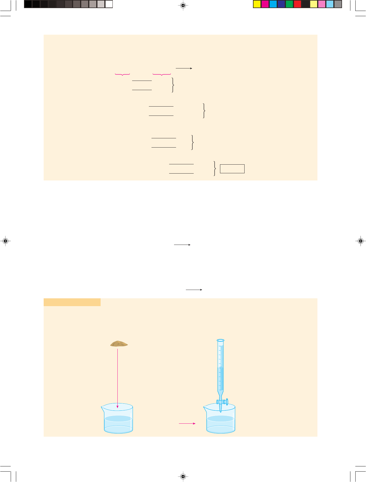 50 R ep ro du çã o pr oi bi da .A rt .1 84 do C ód ig o P en al e Le i9 .6 10 de 19 de fe ve re iro de 19 98 . Exercício resolvido A resolução típica desses problemas é feita retrocedendo-se da solução titulada % para a amostra inicial ": • quantidade de H2SO4 em %: n % MV % 1 " 0,025 ⇒ n % 0,025 mol • quantidade de NaOH em $: • quantidade de NaOH em #: H2SO4 " 2 NaOH Na2SO4 " 2 H2O 1 mol 2 mol 0,025 mol x x % 0,050 mol de NaOH 50 mL de solução $ 0,050 mol 500 mL de solução # y y % 0,5 mol de NaOH • quantidade de NaOH em ": é igual à existente em #, pois de " para # houve somente a adição de água; portanto, temos em ": Sendo 25 g a massa da amostra inicial, temos: 1 mol de NaOH 40 g 0,5 mol de NaOH z z % 20 g de NaOH puro 163 (Vunesp) Foi preparada em laboratório uma solução de ácido clorídrico, dissolvendo-se 0,73 g de cloreto de hidrogênio gasoso em água; o volume foi completado até 250 mL. Um volume de 15,0 mL da solução desse ácido foi completamente neutralizado por 25,0 mL de hidróxido de cálcio (massas molares, em g/mol: H % 1; Cl % 35,5). a) Calcule a concentração da base, em mol/L. b) Escreva a equação química da reação de neutralização e calcule o número de mols da base, que foi neutralizado. 164 (UFF-RJ) O composto de fórmula molecular Na2B4O7 " 10 H2O, denominado tetraborato de sódio, é conhecido por bórax. Se uma pessoa ingerir de 5 a 10 gramas desse composto, apresentará vômito, diarréia, poderá entrar em estado de choque e, até, morrer. Tal composto é um sólido cristalino que reage com ácidos fortes de acordo com a equação: Na2B4O7 " 10 H2O " 2 H " 4 H3BO3 " 5 H2O " 2 Na " Uma amostra de tetraborato de sódio, de massa 0,9550 g, reage completamente com uma solução de HCl 0,1000 M. Pode-se afirmar que o volume de ácido clorídrico consumido nessa reação é, aproximadamente: a) 5,00 mL b) 9,50 mL c) 25,00 mL d) 50,00 mL e) 95,00 mL 165 1,40 g de iodo (massa atômica: I % 127) foi dissolvido em álcool; a seguir, juntou-se água até o volume de 250 mL. Dessa solução, retiraram-se 25 mL, que foram titulados com 5 mL de tiossulfato de sódio 0,2 molar. Qual é a porcentagem de pureza do iodo analisado? (Reação: I2 " 2 Na2S2O3 2 Nal " Na2S4O6) 25 g de NaOH impuro 100% 20 g de NaOH puro P P % 80% 0,195 g do metal (Me) V2 = 10 mL de H2SO4 M2 = 0,50 mol/L V4 = 16 mL de KOH M4 = 0,25 mol/L V3 = 10 mL " # $ % 166 0,195 g de um metal bivalente foi dissolvido em 10 mL de H2SO4 0,50 molar. O excesso do H2SO4 foi neutralizado por 16 mL de KOH 0,25 molar. Calcule a massa atômica do metal. Observação: Temos agora um primeiro exemplo de volumetria com excesso de reagente ou titulação de volta. Esquema do problema Capitulo 01C-QF2-PNLEM 4/6/05, 15:1250 R ep ro du çã o pr oi bi da .A rt .1 84 do C ód ig o P en al e Le i 9 .6 10 de 19 de fe ve re iro de 19 98 . 51Capítulo 1 • SOLUÇÕES Explicação do esquema • Entre " e # ocorre a reação entre o metal (Me) e o H2SO4, porém com sobra de H2SO4; Me " H2SO4 MeSO4 " H2 " (Excesso de H2SO4) • De # para $, uma vez que o problema não fala em “retirada de alíquota”, concluímos que V3 % V2 % 10 mL; e, pela equação da reação, concluímos, também, que a solução $ contém o sulfato do metal, além do excesso de H2SO4 (que sobrou sem reagir). • Entre $ e % ocorre a reação entre o excesso de H2SO4 e o KOH: (Excesso de H2SO4) " 2 KOH K2SO4 " 2 H2O Resolução • Quantidade de KOH em %: n4 % M4V4 % 0,25 " 0,016 ⇒ n4 % 0,004 mol de KOH • Quantidade de H2SO4 em excesso em $: • Quantidade inicial de H2SO4 em # (isto é, antes de ter sido colocado o metal): n2 % M2V2 % 0,50 " 0,010 ⇒ n2 % 0,005 mol de H2SO4 (no início) • A quantidade de H2SO4 que realmente reagiu com o metal, em #, foi 0,005 mol # 0,002 mol % 0,003 mol Assim, da equação com o metal, temos: H2SO4 " 2 KOH K2SO4 " 2 H2O 1 mol 2 mol x 0,004 mol x % 0,002 mol de H2SO4 em excesso Me " H2SO4 MeSO4 " H2 0,195 g 0,003 mol A 1 mol A % 65 u Observação: Note que, logo de início, foi colocado um reagente em excesso (no caso, o H2SO4), porém em quantida- de bem definida (10 mL de H2SO4 0,50 molar); uma parte desse reagente “ataca” a amostra (no caso, o metal), a outra parte sobra, e deve ser titulada por uma segunda solução de concentração conhecida (o KOH); essa titulação final é denominada titulação de volta ou de retorno, pois permite determinar o excesso do reagente inicial e, conseqüente- mente, sua quantidade que de fato reagiu. 167 1,24 g de ferro impuro foi dissolvido em 20 mL de HCl 3 molar, produzindo cloreto ferroso e hidrogênio. Após essa reação, o excesso de HCl foi neutralizado por 10 mL de NaOH 2 molar. Qual é a porcentagem de pureza do ferro analisado? 168 (UFPE) Adicionaram-se a 1,0 g de carbonato de cálcio impuro 200,0 mL de uma solução de ácido clorídrico 0,10 mol/L. Após o término da reação, neutralizou-se o excedente ácido com uma solução de hidróxido de sódio 1,0 mol/L, gastando- se 4,0 mL (massas atômicas: Ca % 40 u; Cu % 12 u; Cl % 35,5 u; H % 1 u). Qual é a pureza do carbonato de cálcio? a) 60% b) 45% c) 90% d) 85% e) 80% 169 (PUC-MG) Alguns produtos de limpeza doméstica consistem basicamente de solução aquosa de amô- nia. Para reagir completamente com a amônia pre- sente em 5,00 mL de amostra de um determinado produto de limpeza, foram necessários 30,0 mL de ácido clorídrico 1,0 mol/L. A reação que ocorre é: NH3 (aq) " HCl (aq) NH4Cl (aq) Qual é a concentração de amônia, em mol/L, na amostra? a) 2,0 b) 3,0 c) 0,6 d) 0,3 e) 6,0 170 (UnB-DF) Para sua completa neutralização, uma amos- tra de vinagre de 5,0 mL consumiu 25 mL de uma solu- ção que contém 0,20 mol/L de NaOH. Supondo que o único componente ácido do vinagre seja o ácido acético (CH3COOH), calcule a massa (em gramas) do ácido, con- tida em 1 L de vinagre (dados: M (NaOH) % 40 g/mol; M (CH3COOH) % 60 g/mol). 171 (Vunesp) Uma solução aquosa