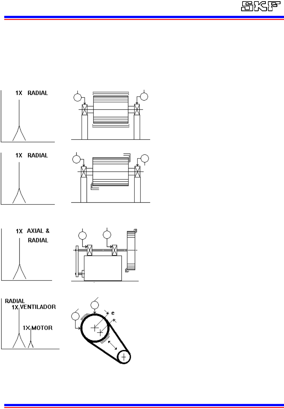 SKF Reliability Systems SKF Reliability Systems �� ���������� ��� � ��� � � � � ������http://www.skf.com.br/� ���������������������������������������������������� ��� � ������������������� 10 - Pag�1�� � � � ������������������ QUADRO ILUSTRATIVO DE DIAGNÓSTICOS DE VIBRAÇÃO OESPECTRO TÍPICO RELAÇÃO DE FASES OBSERVAÇÕES DESBALANCEAMENTO DE MASSA O Desbalanceamento de Forças estará em fase e será permanente. A amplitude devida ao Desbalanceamento crescerá com o quadrado da velocidade (3X de aumento da velocidade = 9X de aumento na vibração). 1X RPM sempre está presente e normalmente domina o espectro. Pode ser corrigida pela colocação, simplesmente, de um peso de balanceamento em um plano no centro de gravidade do Rotor (CG). O Desbalanceamento de Acoplamento tende a ficar 180° fora de fase no mesmo eixo. 1X está sempre presente e normalmente domina o espectro. A amplitude varia com o quadrado do crescimento da velocidade. Pode provocar vibrações axiais e radiais elevadas. A correção exige a colocação de pesos de balanceamento em pelo menos 2 planos. Observe que pode existir aproximadamente 180° de diferença de fase entre as horizontais OB e IB, bem como entre as verticais OB e IB. O Desbalanceamento do Rotor em Balanço causa elevado 1X RPM tanto na direção axial como na direção radial. Leituras axiais tendem a estar em fase, enquanto leituras de fase radiais podem ser instáveis. Rotores em balanço comumente têm desbalanceamento de força e de acoplamento, cada um dos quais exigirá igualmente que se faça a correção. ROTOR EXCENTRICO Ocorre Excentricidade quando o centro de rotação está fora do centro geométrico de uma polia, uma engrenagem, um mancal, uma armadura de motor, etc. A maior vibração ocorre a 1X RPM do componente excêntrico na direção das linhas dos centros dos dois rotores. Leituras comparativas de fases horizontal e vertical usualmente diferem de 0° ou de 180° (cada uma delas indica movimento em linha reta). Tentativas de balancear um rotor com excentricidade resulta, muitas vezes, na redução da vibração em uma direção, porém em seu aumento na outra direção radial (dependendo da quantidade da excentricidade). SKF Reliability Systems SKF Reliability Systems �� ���������� ��� � ��� � � � � ������http://www.skf.com.br/� ���������������������������������������������������� ��� � ������������������� 10 - Pag�2�� � � � ������������������ OESPECTRO TÍPICO RELAÇÃO DE FASES OBSERVAÇÕES EIXO ARQUEADO Problemas de Arqueamento do eixo causam alta vibração axial com as diferenças de fase axial tendendo para 180° no mesmo componente da máquina. A vibração dominante é normalmente de 1X se a curvatura for próxima ao centro do eixo, mas será de 2X se a curvatura estiver próxima ao acoplamento ( Ao fazer as medições seja cuidadoso com a orientação do transdutor , invertendo a direção do transdutor para cada medição axial). DESALINHAMENTO A - ANGULAR B B- PARALELO O Desalinhamento Angular é caracterizado pela alta vibração axial, 180° fora de fase através do acoplamento .Caracteristicamente haverá alta vibração axial tanto com 1X quanto com 2X RPM. Entretanto não é incomum que 1X, 2X ou 3X sejam dominantes. Estes sintomas podem indicar também problemas de acoplamento. ROLAMENTO ENJAMBRADO NO EIXO Desalinhamento Paralelo tem sintomas similares ao Angular, mas apresenta vibração radial alta que se aproxima de 180° fora de fase através do acoplamento. 2X é muitas vezes maior que 1X, mas sua altura relativa para 1X é habitualmente ditada pelo tipo e construção do acoplamento. Quando o Desalinhamento Angular ou Radial se torna severo, pode gerar picos de alta amplitude em harmônicos muito mais altos (4X-8X) ou mesmo toda uma série de harmônicos de alta freqüência similar na aparência à folga mecânica. A construção do acoplamento influenciará muitas vezes a forma do espectro quando o Desalinhamento é severo . Rolamento Enjambrado pode gerar considerável vibração axial. Causará Movimento de Torção com aproximadamente 180° de variação de fase de alto a baixo e/ou lado a lado quando medido na direção axial do mesmo local do mancal. Tentativas de realinhar o acoplamento ou balancear o rotor não aliviarão o problema. O Rolamento deve ser removido e corretamente instalado. SKF Reliability Systems SKF Reliability Systems �� ���������� ��� � ��� � � � � ������http://www.skf.com.br/� ���������������������������������������������������� ��� � ������������������� 10 - Pag�3�� � � � ������������������ OESPECTRO TÍPICO RELAÇÃO DE FASES OBSERVAÇÕES RESSONÂNCIA Ocorre Ressonância quando uma Freqüência Forçada coincide com uma Freqüência Natural do Sistema, e pode provocar um grande aumento da amplitude, o que pode resultar em falha prematura ou mesmo catastrófica. Esta pode ser uma Freqüência Natural do rotor, mas pode, muitas vezes, se originar da carcaça, da fundação, da caixa de engrenagens ou mesmo de correias de transmissão. Se o rotor estiver em ressonância ou próximo dela, será quase impossível balanceá-lo devido à grande variação de fase que ele experimenta (90° em ressonância; aproximadamente 18