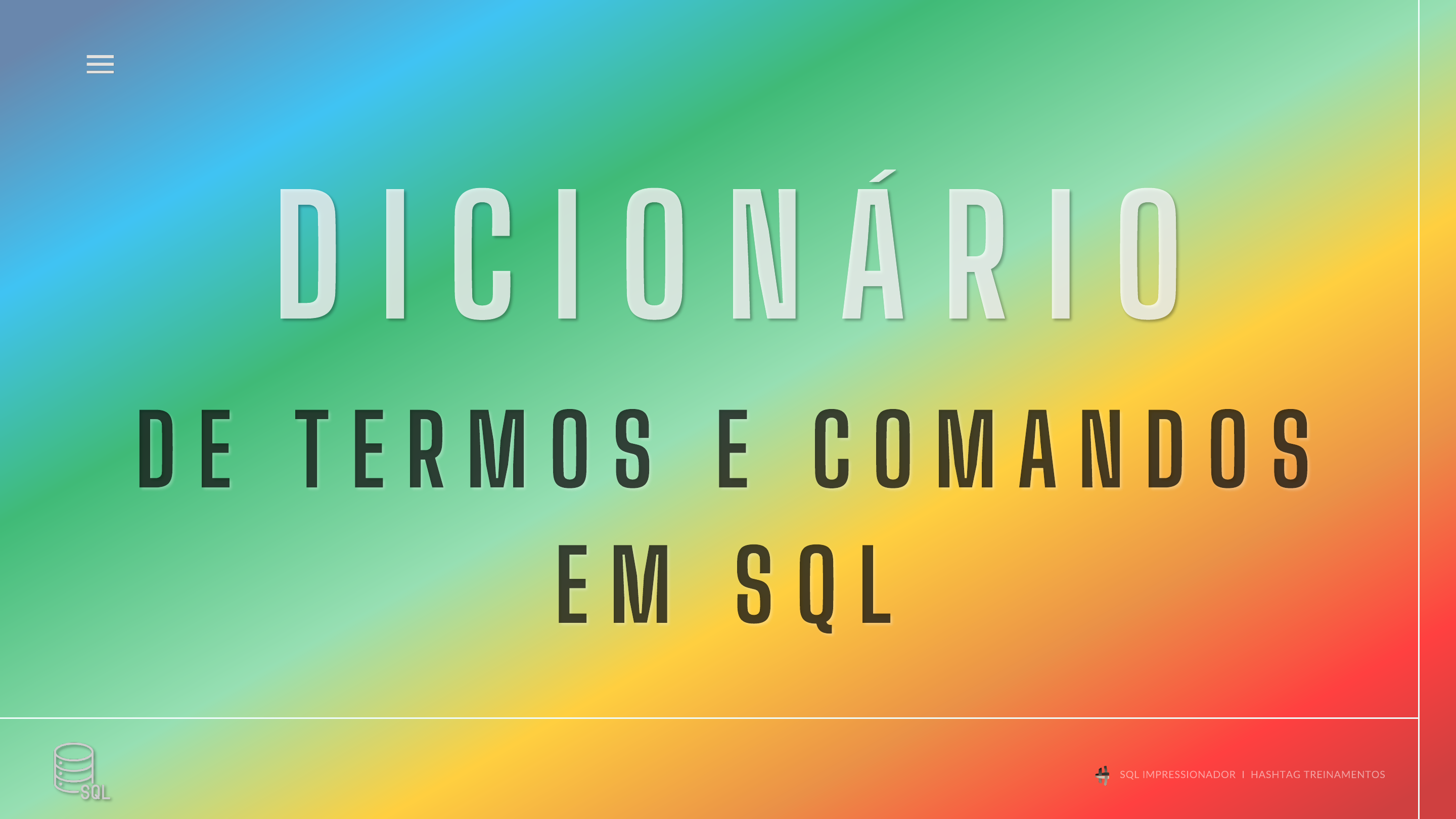 Fala, Impressionador! Apresentamos a você o Dicionário de Termos e Comandos em SQL! Sabemos que, como os termos e comandos SQL são em inglês, pode existir uma certa dificuldade inicial maior em entender o conceito de cada um deles. Fique tranquilo, pois com o tempo e a prática, essa dificuldade naturalmente vai diminuindo. Mas até lá, conte com este dicionário como mais um apoio oferecido aqui pela ! ☺ Nosso intuito com este dicionário foi reunir os termos e comandos apresentados no curso SQL Impressionador em um único lugar para facilitar o seu aprendizado. Aqui, pretendemos fazer uma breve síntese de cada um desses termos e comandos vistos nas aulas, separando-os por cada SGBD (Sistema de Gerenciamento de Banco de Dados) ensinado no curso: SQL Server, MySQL, PostgreSQL e Oracle. Assim, sempre que você precisar consultar o que significa determinado termo ou a utilidade de certo comando, basta vir aqui neste dicionário, escolher o SGBD que você está estudando, e procurar pelo termo/comando ensinado no curso. Além de separados por SGBD, eles também estão em ordem alfabética. Ressaltamos que a linguagem SQL é muito rica, portanto, nem todos os termos e comandos em SQL que existem na face da Terra estão incluídos aqui. No entanto, fizemos o possível para incluir tudo que é abordado no curso, por SGBD. Beleza? Esperamos que este material te ajude em seu aprendizado. Bons estudos! APRESENTAÇÃO SQL IMPRESSIONADOR I HASHTAG TREINAMENTOS E S C O L H A O S G B D : SQL IMPRESSIONADOR I HASHTAG TREINAMENTOS SQL IMPRESSIONADOR I HASHTAG TREINAMENTOS K L D E F G H M N I J O P Q R S T U V W Escolha ao lado a letra inicial do comando: A CB@ X Y Z % @@ROWCOUNT @@SERVERNAME @@TRANCOUNT @@VERSION CARACTERE @ Esco lha o comando : SQL IMPRESSIONADOR I HASHTAG TREINAMENTOS ACCENT INSENSITIVE - AI ACCENT SENSITIVE - AS AD – ADMINISTRADOR DE DADOS ADD AFTER ALIAS ALL ALTER AND ANY AS ASC AVG LETRA A Esco lha o comando : SQL IMPRESSIONADOR I HASHTAG TREINAMENTOS BEGIN BETWEEN BREAK LETRA B Esco lha o comando : SQL IMPRESSIONADOR I HASHTAG TREINAMENTOS LETRA C Esco lha o comando : CASE CASE INSENSITIVE - CI CASE SENSITIVE - CS CAST CATCH / TRY CEILING CHAR CHARINDEX CHECK COLLATE / COLLATION COLUMN COMMIT CONCAT CONCAT_WS CONSTRAINTS CONSULTA CONTINUE ContosoRetailDW CONVERT COUNT CREATE CROSS JOIN CRUD – CREATE, READ, UPDATE, DELETE CTE – COMMON TABLE EXPRESSION CURRENT ROW CYCLE SQL IMPRESSIONADOR I HASHTAG TREINAMENTOS LETRA D Esco lha o comando : DATABASE DATABASEPROPERTYEX DATALENGTH DATE DATEADD DATEDIFF DATEFROMPARTS DATENAME DATEPART DATETIME DAY DB – DESENVOLVEDOR DE BANCOS DE DADOS DBA – DATABASE ADMINISTRATOR DBO – DATABASE OWNER DECIMAL DECLARE DEFAULT DELETE DELETED (TABLE) DENSE_RANK() DESC DISABLE DISTINCT DROP SQL IMPRESSIONADOR I HASHTAG TREINAMENTOS ELSE ENABLE END EXECUTE / EXEC EXISTS LETRA E Esco lha o comando : SQL IMPRESSIONADOR I HASHTAG TREINAMENTOS FIRST_VALUE FLOAT FLOOR FOR FOREIGN KEY FORMAT FROM FULL (ANTI) JOIN FULL JOIN FUNCTIONS LETRA F Esco lha o comando : SQL IMPRESSIONADOR I HASHTAG TREINAMENTOS GETDATE() GO GROUP BY LETRA G Esco lha o comando : SQL IMPRESSIONADOR I HASHTAG TREINAMENTOS HAVING LETRA H Esco lha o comando : SQL IMPRESSIONADOR I HASHTAG TREINAMENTOS IDENTITY IF IIF IN INCREMENT BY INNER JOIN INSERT INTO INSERTED (TABLE) INSTEAD OF INT IS NOT NULL IS NULL ISNULL LETRA I Esco lha o comando : SQL IMPRESSIONADOR I HASHTAG TREINAMENTOS JOIN LETRA J Esco lha o comando : SQL IMPRESSIONADOR I HASHTAG TREINAMENTOS LAG LAST_VALUE LEAD LEFT LEFT (ANTI) JOIN LEFT JOIN LEN LIKE LOOP LOWER LTRIM LETRA L Esco lha o comando : SQL IMPRESSIONADOR I HASHTAG TREINAMENTOS MAX MAXVALUE MIN MINVALUE MONTH LETRA M Esco lha o comando : SQL IMPRESSIONADOR I HASHTAG TREINAMENTOS N FOLLOWING N PRECEDING NEXT VALUE FOR NO CYCLE NO MAXVALUE NO MINVALUE NOT NOT NULL NTILE() NULLIF LETRA N Esco lha o comando : SQL IMPRESSIONADOR I HASHTAG TREINAMENTOS ON OR ORDER BY OVER() LETRA O Esco lha o comando : SQL IMPRESSIONADOR I HASHTAG TREINAMENTOS PARTITION BY PIVOT TABLE PLANO DE EXECUÇÃO ESTIMADO PL-pgSQL – PostgreSQL PROCEDURAL LANGUAGE PL-SQL - PROCEDURAL LANGUAGE/SQL PRIMARY KEY PRINT PROCEDURES / STORED PROCEDURES LETRA P Esco lha o comando : SQL IMPRESSIONADOR I HASHTAG TREINAMENTOS QUERY QUOTENAME LETRA Q Esco lha o comando : SQL IMPRESSIONADOR I HASHTAG TREINAMENTOS RAISERROR RANK() REFERENCES REGULAR EXPRESSIONS - REGEX REPLACE RETURN RETURNS RIGHT RIGHT (ANTI) JOIN RIGHT JOIN ROLLBACK ROUND ROW_NUMBER() ROWS RTRIM LETRA R Esco lha o comando : SQL IMPRESSIONADOR I HASHTAG TREINAMENTOS LETRA S Esco lha o comando : SCHEMAS SELECT SEQUENCES SERVERPROPERTY SET SGBD SOME SP_EXECUTESQL SP_HELP SQL – STRUCTURED QUERY LANGUAGE SQL SERVER / SSMS SQL_VARIANT_PROPERTY START WITH STORED PROCEDURES / PROCEDURES STRING STUFF SUBQUERY / SUBSELECT SUBSTRING SUM SYSDATETIME() SQL IMPRESSIONADOR I HASHTAG TREINAMENTOS T-SQL / TRANSACT-SQL TABELA DIMENSÃO TABELA FATO TABLE THEN TOP(N) TOP(N) PERCENT TRANSACTION / TRAN TRANSACTIONS TRANSLATE TRIGGERS TRIM TRY / CATCH LETRA T Esco lha o comando : SQL IMPRESSIONADOR I HASHTAG TREINAMENTOS UNBOUNDED FOLLOWING UNBOUNDED PRECEDING UNION UNION ALL UNIQUE UPDATE UPPER USE LETRA U Esco lha o comando : SQL IMPRESSIONADOR I HASHTAG TREINAMENTOS VALUES VARCHAR VARIÁVEIS GLOBAIS VARIÁVEL VIEW LETRA V Esco lha o comando : SQL IMPRESSIONADOR I HASHTAG TREINAMENTOS WHEN WHERE WHILE WINDOW FUNCTIONS WITH LETRA W Esco lha o comando : SQL IMPRESSIONADOR I HASHTAG TREINAMENTOS YEAR LETRA Y Esco lha o comando : SQL IMPRESSIONADOR I HASHTAG TREINAMENTOS TRADUÇÃO: CONTAGEM DE LINHAS Variável global utilizada para descobrir a quantidade de linhas (registros) existentes em uma tabela. @@ROWCOUNT SQL IMPRESSIONADOR I HASHTAG TREINAMENTOS Obs.: Para saber mais sobre variáveis globais, veja esta explicação aqui. TRADUÇÃO: NOME DO SERVIDOR Variável global utilizada para descobrir o nome do servidor. @@SERVERNAME SQL IMPRESSIONADO