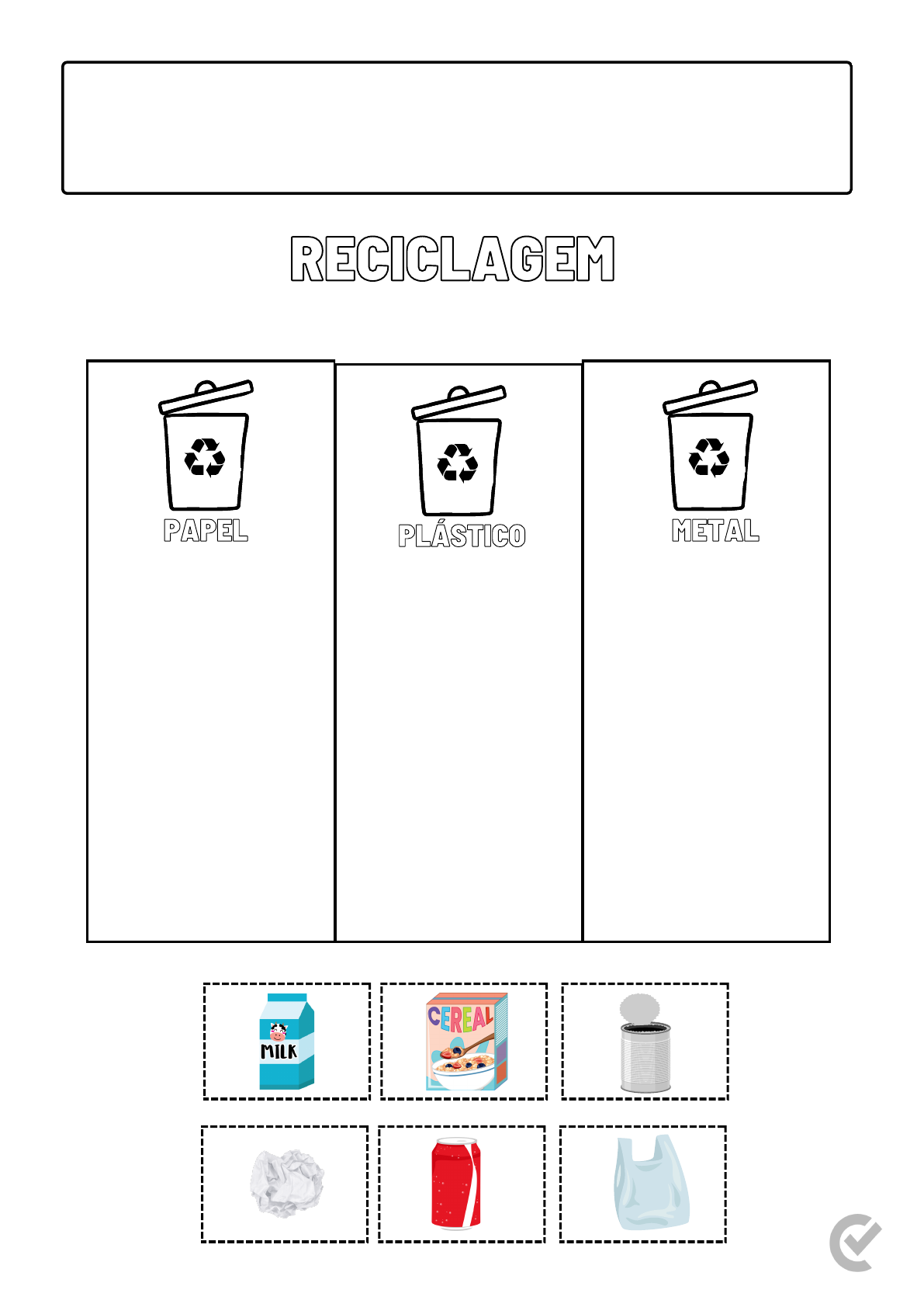 PAPEL PLÁSTICO Nome: ______________________________________________________ Turma: ___________ RECICLAGEM PINTE AS IMAGENS. RECORTE E COLE-AS NA CAIXA CORRETA. Escola: ______________________________________________________ Data: ___/___/___ METAL