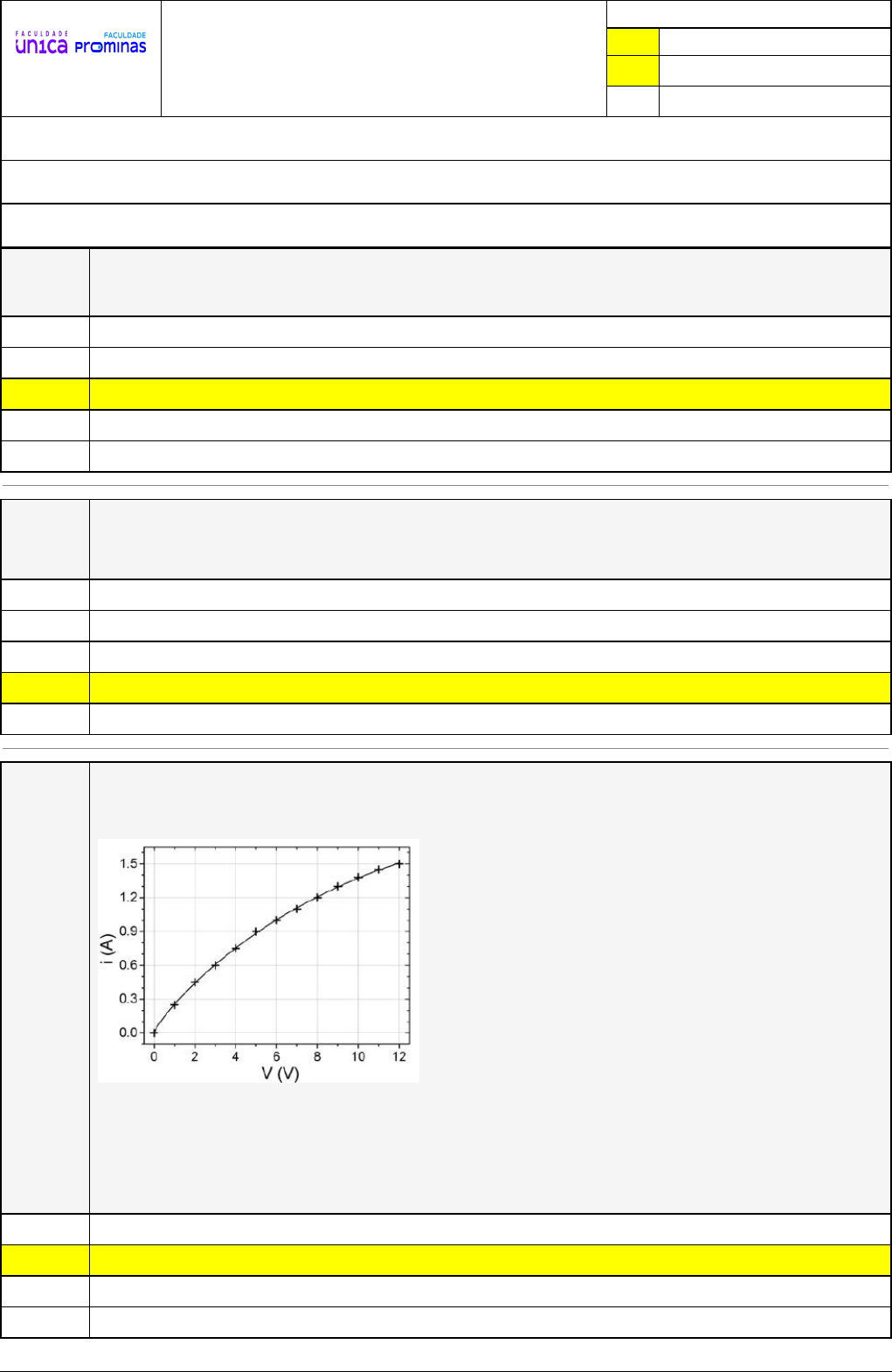 Pincel Atômico - 07/05/2024 22:27:22 1/4 DILTON CARNEIRO PEDREIRA Avaliação Online (SALA EAD) Atividade finalizada em 16/11/2023 11:43:35 (1254735 / 1) LEGENDA Resposta correta na questão # Resposta correta - Questão Anulada X Resposta selecionada pelo Aluno Disciplina: FÍSICA III [204109] - Avaliação com 10 questões, com o peso total de 50,00 pontos [capítulos - Todos] Turma: Graduação: Engenharia Civil - Grupo: FEVEREIRO/2021 - ENG.CIV [21015] Aluno(a): 91433209 - DILTON CARNEIRO PEDREIRA - Respondeu 9 questões corretas, obtendo um total de 45,00 pontos como nota [360167_1553 37] Questão 001 (PUC) Três resistores idênticos de R = 30Ω estão ligados em paralelo com uma bateria de 12V. Pode-se afirmar que a resistência equivalente do circuito é de: Req = 30Ω,e a corrente é 0,4 A. Req = 20Ω,e a corrente é 0,6 A. X Req = 10Ω,e a corrente é 1,2 A. Req = 60Ω,e a corrente é 0,2 A. Req = 40Ω,e a corrente é 0,3 A. [360167_1541 76] Questão 002 Alguns dispositivos de segurança utilizados em circuitos elétricos possuem o intuito de interromper a passagem de grandes correntes elétricas que poderiam ser prejudiciais para o seu funcionamento. São dispositivos de segurança: pilhas. amperímetro e voltímetro. resistor e varistor. X fusível e disjuntor. interruptor. [360167_1553 15] Questão 003 (UFRGS- 2016). O gráfico abaixo apresenta a curva corrente elétrica i versus diferença de potencial V para uma lâmpada de filamento. Observe que a relação entre corrente e tensão não é linear. Sobre essa lâmpada, considere as seguintes afirmações. O filamento da lâmpada é ôhmico. A resistência elétrica do filamento, quando ligado em 6 V,é 6 Ω. O filamento da lâmpada não é ôhmico. Quais estão corretas? Apenas I. X Apenas II e III. Apenas II. Apenas I e III. Pincel Atômico - 07/05/2024 22:27:22 2/4 Apenas III. [360167_1542 32] Questão 004 A figura I adiante representa um ímã permanente em forma de barra, onde N e S indicam, respectivamente, polos norte e sul. Suponha que a barra seja dividida em três pedaços, como mostra a figura II. Colocando lado a lado os dois pedaços extremos, como indicado na figura III, é correto afirmar que eles: não serão atraídos nem repelidos. se atrairão, pois A é polo sul e B é polo norte. se atrairão, pois A é polo norte e B é polo sul. X se repelirão, pois A é polo sul e B é polo norte. se repelirão, pois A é polo norte e B é polo sul. [360167_1553 00] Questão 005 (Adaptada - UFSM-RS) Uma partícula com carga q = 2.10-7 C se desloca do ponto A ao ponto B, que se localizam numa região em que existe um campo elétrico. A diferença de potencial VA – VB entre os dois pontos considerados vale, em V. Durante esse deslocamento, a força elétrica realiza um trabalho igual a 4.10-3 J sobre a partícula, conforme mostra a figura a seguir. É correto afirmar que diferença de potencial em Volts, entre os dois pontos considerados vale: X 2 x 104 -2 x 104 8 x 10-10 0,5 x 10-4 -8 x 10-10 [360168_1541 40] Questão 006 Dois objetos metálicos esféricos idênticos, contendo cargas elétricas de 1C e de 5C, são colocados em contato e depois afastados a uma distância de 3 m. Considerando a Constante de Coulomb k = 9 x 109N m2/C2, podemos dizer que a força que atua entre as cargas após o contato é: atrativa e tem módulo 9 ×109 N. X repulsiva e tem módulo 9 ×109 N. repulsiva e tem módulo 3 ×109 N. Zero. Pincel Atômico - 07/05/2024 22:27:22 3/4 atrativa e tem módulo 3×109 N. [360168_1542 14] Questão 007 Um circuito tem 3 resistores idênticos, dois deles colocados em paralelo entre si, e ligados em série com o terceiro resistor e com uma fonte de 12V. A corrente que passa pela fonte é de 5,0 mA. Qual é a resistência de cada resistor, em kΩ? 1,2 2,4 0,60 X 1,6 0,80 [360168_1541 15] Questão 008 Uma carga QA = -160 µC está fixa num ponto A da figura abaixo. Sabendo que o campo elétrico produzido por esta carga é: E = k.|Q|/ d2, onde k = 9.109 unidade do SI. As intensidades dos vetores campo elétrico nos pontos P1 e P2 serão, respectivamente: 36.106 N/C e 36.106 N/C 9.106 N/C e 18.106 N/C X 4,5.106 N/C e 72.106 N/C 18.106 N/C e 72.106 N/C 9.106 N/C e 36.106 N/C [360169_1542 24] Questão 009 Muitos smartphones e tablets não precisam mais de teclas, uma vez que todos os comandos podem ser dados ao se pressionar a própria tela. Inicialmente essa tecnologia foi proporcionada por meio das telas resistivas, formadas basicamente por duas camadas de material condutor transparente que não se encostam até que alguém as pressione, modificando a resistência total do circuito de acordo com o ponto onde ocorre o toque. A imagem é uma simplificação do circuito formado pelas placas, em que A e B representam pontos onde o circuito pode ser fechado por meio do toque. Qual é a resistência equivalente no circuito provocada por um toque que fecha o circuito no ponto A? X 6,0 kΩ 6,7 kΩ 1,3 kΩ 12,0 kΩ 4,0 kΩ Pincel Atômico - 07/05/2024 22:27:22 4/4 [360169_1541 70] Questão 010 Com base em seus conhecimentos, assinale a alternativa correta com relação à corrente elétrica alternada. É um fluxo desornado de elétrons que se movem em um único sentido. Possui fluxo de elétrons constante. X É uma corrente em que os elétrons oscilam com determinada frequência em torno de uma posição de equilíbrio. É uma movimentação de elétrons que flui do maior para o menor potencial. É uma movimentação de elétrons que flui do menor para o maior potencial.