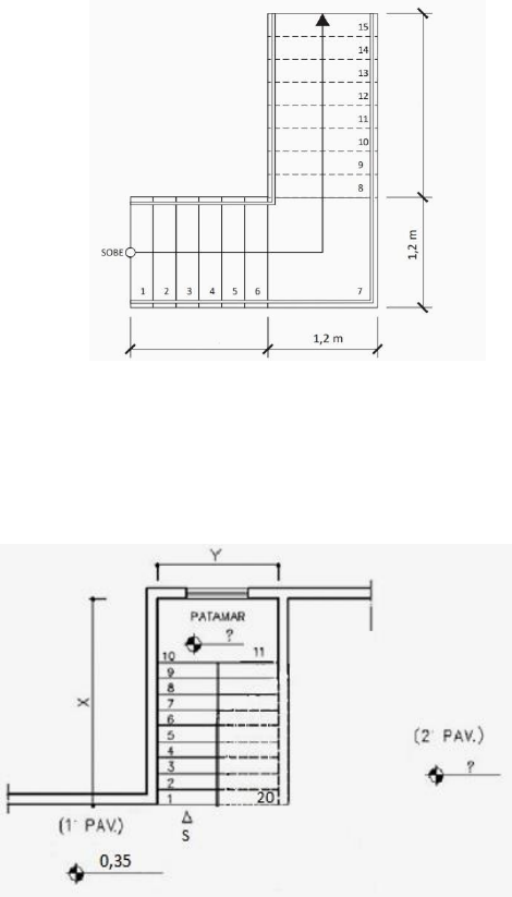 UNIVERSO ENGENHARIA CIVIL Desenho projetivo (N151) - 1ºsem2024 Profª Lúcia Rosas 1 - No dimensionamento dos componentes da escada, a relação entre os degraus e os espelhos interfere diretamente na acessibilidade e no conforto por parte dos usuários. Considerando escada de lance único, onde a altura entre os dois pisos a ser vencida é de 2,76 m e o piso de 0,27m. De acordo com a fórmula de Blondel, ache quantos degraus ela terá, qual o espelho escolhido (considere até 3 casas decimais) e o seu comprimento respectivamente. ( ) a) 17; 0,16m e 4,59m. ( ) b) 15; 0,18m e 4,05m. ( ) c) 17; 0,162m e 4,32m. ( ) d) 15; 0,184m e 3,78m. ( ) e) 16; 0,172m e 4,32m. 2 - Na elaboração do projeto de uma escada para uma edificação residencial, conforme desenho esquemático a seguir, foi utilizada a fórmula de Blondel, comumente empregada para dimensionamento de escadas na construção civil. A partir dessas informações e da imagem, considerar que o pé direito é 2,78m, a laje da edificação tenha 10 cm de espessura e a profundidade do piso da escada é 0,28m. Responda à questão: Quantos espelhos? qual a altura do espelho e qual o comprimento do primeiro lance da escada? a) 15; 0,192m; 1,68m b) 16; 0,17m; 1,68m c) 15; 0,18m; 1,96m d) 16; 0,18m; 1,68m e) 16; 0,17m; 1,96m 3 - As escadas são elementos essenciais para o funcionamento dos edifícios. Além da questão do funcionamento, também consistem em importantes elementos de composição estética. Analise a imagem do detalhe de uma escada em planta. Os pisos da escada têm a dimensão de 0,27m, os espelhos de 0,175m e o patamar de 2,40m x 1,20m. As cotas de nível do patamar e do 2º pavimento correspondem a: ( ) a) 2,41m; 3,40m. ( ) b) 2,95m; 4,70m. ( ) c) 2,10m; 3,85m. ( ) d) 1,92m; 3,67m. ( ) e) 1,75m; 3,50m.