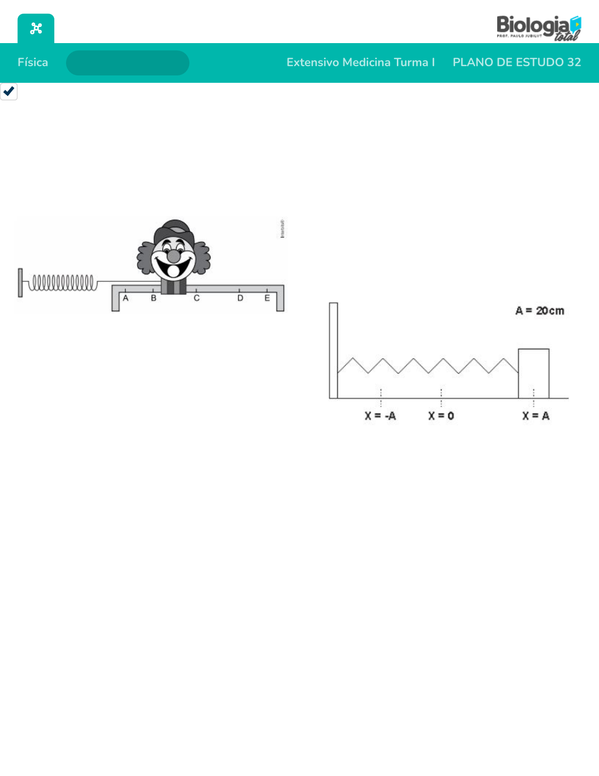 / Física Lista de Exercícios Extensivo Medicina Turma I PLANO DE ESTUDO 32 Ex. 14 Casos de MHS: Sistema Massa-Mola e Pêndulo Simples (UNESP 2016) Em um parque de diversões, existe uma atração na qual o participante tenta acertar bolas de borracha na boca da �gura de um palhaço que, presa a uma mola ideal, oscila em movimento harmônico simples entre os pontos extremos A e E, passando por B, C e D, de modo que em C, ponto médio do segmento AE a mola apresenta seu comprimento natural, sem deformação. Uma pessoa, ao fazer suas tentativas, acertou a primeira bola quando a boca passou por uma posição em que o módulo de sua aceleração é máximo e acertou a segunda bola quando a boca passou por uma posição onde o módulo de sua velocidade é máximo. Dos pontos indicados na �gura, essas duas bolas podem ter acertado a boca da �gura do palhaço, respectivamente, nos pontos Ex. 1 Casos de MHS: Sistema Massa-Mola e Pêndulo Simples (FEEVALE 2012) Um macaco tem o hábito de se balançar em um cipó de 10 m de comprimento. Se a aceleração gravitacional local for 10 m/s2, qual o período de oscilação do macaco? Ex. 25 Casos de MHS: Sistema Massa-Mola e Pêndulo Simples TEXTO PARA A PRÓXIMA QUESTÃO: As primeiras ideias sobre energia mecânica foram formuladas por Gottfried Leibnitz, �lósofo e matemático (1646-1716). Leibnitz acreditava que, para um corpo de massa m e velocidade v, a grandeza mv2 , que ele chamava “vis viva”, era uma grandeza que se conservava. Para Leibnitz um corpo lançado verticalmente sempre possuiria “vis” (força, energia), mesmo quando estivesse no ponto mais alto onde a velocidade é nula. Ao cair, sua velocidade aumenta e o corpo passa a ter novamente a “vis viva”. A grandeza mv2 de Leibnitz hoje é identi�cada como o dobro da energia cinética. O progresso das ciências físicas levou à descoberta de diferentes formas de energia: potencial gravitacional, potencial elástica, térmica, elétrica, etc. Assim, quando se consideram todas as formas de energia, a energia total de um sistema isolado é constante. Essa é a lei da conservação da energia, enunciada independentemente por Joule, Helmholtz e Mayer, por volta de 1850. (Texto adaptado de Projeto de Ensino de Física, USP, fascículo 11, coordenação de Ernest Hamburger e Giorgio Moscate, 1975.) A �gura a seguir mostra um corpo de massa m = 0,05 kg, preso a uma mola de constante elástica k = 20 N/m. O objeto é deslocado 20 cm para a direita, a partir da posição de equilíbrio sobre uma superfície sem atrito, passando a oscilar entre x = A e x = - A. (PUCMG 2009) Assinale a a�rmativa CORRETA. Ex. 28 Casos de MHS: Sistema Massa-Mola e Pêndulo Simples (ESPCEX 2012) Um objeto preso por uma mola de constante elástica igual a 20 N/m executa um movimento harmônico simples em torno da posição de equilíbrio. A energia mecânica do sistema é de 0,4 J e as forças dissipativas são desprezíveis. A amplitude de oscilação do objeto é de: Ex. 26 Casos de MHS: Sistema Massa-Mola e Pêndulo Simples (UFRGS 2014) A �gura abaixo representa o movimento de um pêndulo que oscila sem atrito entre os pontos x1 e x2. Imprimir mais exercícios por página a) A e C. b) B e E. c) C e D. d) E e B. e) B e C. a) 2 s b) 2π s c) 1 s d) π s e) 0,5 s a) Na posição x = -20 cm, a mola tem uma energia cinética de 0,4 J e a energia potencial elástica do corpo é nula. b) Na posição x = -20 cm, toda a energia do sistema vale 0,4 J e está no objeto sob a forma de energia cinética. c) Na posição x = 0, toda a energia do sistema está no corpo na forma de energia cinética e sua velocidade vale 4 m/s. d) Na posição x = 20 cm, toda a energia do sistema vale 0,8 J sendo 0,6 J na mola e o restante no objeto. a) 0,1 m b) 0,2 m c) 1,2 m d) 0,6 m e) 0,3 m / Qual dos seguintes grá�cos melhor representa a energia mecânica total do pêndulo – ET – em função de sua posição horizontal? Ex. 27 Casos de MHS: Sistema Massa-Mola e Pêndulo Simples (UDESC 2015) Um pêndulo é formado por uma haste rígida inextensível de massa desprezível e em uma das extremidades há uma esfera sólida de massa m. A outra extremidade é �xada em um suporte horizontal. A haste tem comprimento L e a esfera tem raio r. O pêndulo é deslocado da sua posição de equilíbrio de uma altura H e executa um movimento harmônico simples no plano, conforme mostra a �gura. Com relação ao movimento desse pêndulo, analise as proposições. I. A energia mecânica em A e B são iguais. II. As energias cinética e potencial em A e B são iguais. III. A energia cinética em A é mínima. IV. A energia potencial em B é máxima. Assinale a alternativa correta. Ex. 19 Casos de MHS: Sistema Massa-Mola e Pêndulo Simples (EPCAR 2013) Num local onde a aceleração da gravidade é constante, um corpo de massa m, com dimensões desprezíveis, é posto a oscilar, unido a uma mola ideal de constante elástica k, em um plano �xo e inclinado de um ângulo θ, como mostra a �gura abaixo. Nessas condições, o sistema massa-mola executa um movimento harmônico simples de período T. Colocando-se o mesmo sistema massa-mola para oscilar na vertical, também em movimento harmônico simples, o seu novo período passa a ser T’. Nessas condições, a razão T’/T é a) b) c) d) e) a) Somente as a�rmativas I e II são verdadeiras. b) Somente as a�rmativas III e IV são verdadeiras. c) Somente as a�rmativas I e III são verdadeiras. d) Somente as a�rmativas I e IV são verdadeiras. e) Todas a�rmativas são verdadeiras. a) 1 b) sen θ c) 1/2 d) 1/sen θ / Ex. 18 Casos de MHS: Sistema Massa-Mola e Pêndulo Simples (CEFET MG 2015) Um estudante utilizou uma mola de constante elástica k e um bloco de massa m para montar dois experimentos conforme ilustra a �gura. Inicialmente, o sistema foi colocado para oscilar na vertical e a frequência observada foi f. Ao Montar o sistema no plano inclinado e com atrito des