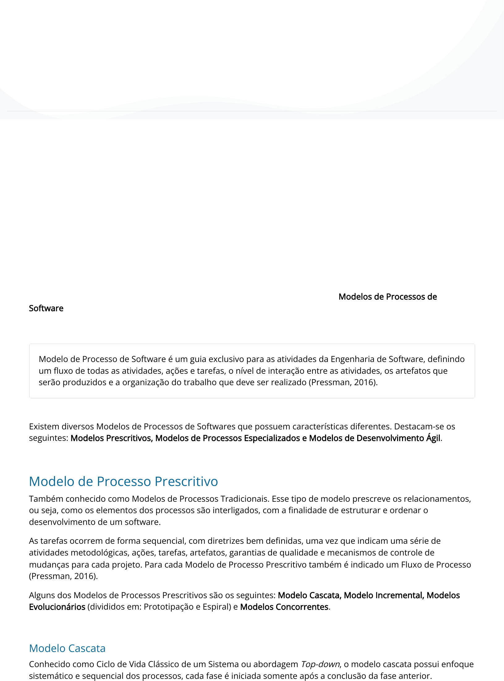 Nesta webaula vamos ver alguns Modelos de Processos de Software, disponíveis no mercado, sendo que alguns são bem antigos, mas, mesmo assim, são utilizados em vários projetos. Todos os modelos possuem a �nalidade de evitar o caos no desenvolvimento e estabelecer um Fluxo de Trabalho. Na verdade, tudo depende do tipo de software a ser produzido, combinado com as expectativas do cliente. Modelos de Processo de Software Durante a fase de desenvolvimento de um software existem muitas tarefas, que devem ser distribuídas entre os membros da equipe. Sommerville (2011) destaca que dentre as atividades do Processo de Software estão: o estudo da viabilidade, a análise dos requisitos, a especi�cação, a arquitetura de software, implementação (codi�cação), testes, documentação, suporte e treinamento e manutenção. Para o gerenciamento das atividades de Processo de Software são utilizados os Modelos de Processos de Software. Modelo de Processo de Software é um guia exclusivo para as atividades da Engenharia de Software, de�nindo um �uxo de todas as atividades, ações e tarefas, o nível de interação entre as atividades, os artefatos que serão produzidos e a organização do trabalho que deve ser realizado (Pressman, 2016). Existem diversos Modelos de Processos de Softwares que possuem características diferentes. Destacam-se os seguintes: Modelos Prescritivos, Modelos de Processos Especializados e Modelos de Desenvolvimento Ágil. Modelo de Processo Prescritivo Também conhecido como Modelos de Processos Tradicionais. Esse tipo de modelo prescreve os relacionamentos, ou seja, como os elementos dos processos são interligados, com a �nalidade de estruturar e ordenar o desenvolvimento de um software. As tarefas ocorrem de forma sequencial, com diretrizes bem de�nidas, uma vez que indicam uma série de atividades metodológicas, ações, tarefas, artefatos, garantias de qualidade e mecanismos de controle de mudanças para cada projeto. Para cada Modelo de Processo Prescritivo também é indicado um Fluxo de Processo (Pressman, 2016). Alguns dos Modelos de Processos Prescritivos são os seguintes: Modelo Cascata, Modelo Incremental, Modelos Evolucionários (divididos em: Prototipação e Espiral) e Modelos Concorrentes. Modelo Cascata Conhecido como Ciclo de Vida Clássico de um Sistema ou abordagem Top-down, o modelo cascata possui enfoque sistemático e sequencial dos processos, cada fase é iniciada somente após a conclusão da fase anterior. Análise e Modelagem de Sistemas Modelos de Processo de Software Você sabia que seu material didático é interativo e multimídia? Isso signi�ca que você pode interagir com o conteúdo de diversas formas, a qualquer hora e lugar. Na versão impressa, porém, alguns conteúdos interativos �cam desabilitados. Por essa razão, �que atento: sempre que possível, opte pela versão digital. Bons estudos! MODELO CASCATA Análise e Especi�cação Projeto Implementação e Teste de unidade Integração e Veri�cação operaç manuten Para visualizar o vídeo, acesse seu material digital. Fonte: adaptado de Sommerville (2011). O modelo em cascata é considerado o modelo mais tradicional e simples, com especi�cação das atividades de forma clara, além de ser uma base para modelos que surgiram posteriormente e de fácil gerenciamento. Todavia, o desenvolvimento de um software pode se estender ao longo de meses, dependendo da complexidade do projeto, uma vez que as tarefas são realizadas de forma sequencial e o atraso em uma das etapas re�ete nas demais. https://genial.ly/?from=watermark https://view.genial.ly/5e46ed42f89acf1c97ab3934 Modelo Incremental É um modelo iterativo que visa, a partir de requisitos iniciais, criar pequenas versões do software, que vão sendo entregues ao cliente, e posteriormente expandir o software em novas versões até o sistema ideal ser totalmente construído (Sommerville, 2011). Nesse modelo, uma versão é um incremento, e cada incremento (ou versão) incorpora parte da funcionalidade requisitada pelo cliente. No modelo incremental ao invés do cliente receber o software em uma única entrega, ele receberá “pedaços” do software (versões), a cada incremento, até que o Software seja desenvolvido por completo. Esses “pedaços” são módulos que acrescentam, ou melhoram as funcionalidades do sistema. Cada incremento (entrega) é lançado como uma nova versão, do software, até que se atinja a versão �nal. Fonte: adaptada de Sommerville (2011, p. 22). Modelo Evolucionário Esse modelo produz uma versão cada vez mais completa do software. Esse tipo de modelo é iterativo e evolui ao longo do tempo, o que se alinha perfeitamente a um o projeto do Software, pois os requisitos do negócio e do produto não são estáveis, eles mudam (evoluem) e o Software pode ser desenvolvido pensando nesta evolução (Pressman, 2016). No Modelo de Processo Evolucionário aparecem dois Modelos: Prototipação e Espiral. O Modelo de Prototipação, começa a partir da Comunicação, identi�cando quais são os objetivos e as funcionalidades do software. No Planejamento Rápido são determinados os requisitos que serão Modelados (e quais serão “deixados” para serem implementados mais tarde) e que já podem ser Modelados e Construídos. Após a Entrega, o cliente dá um Feedback e a equipe de desenvolvimento irá aprimorar os requisitos. Modelo de Prototipação Saiba Mais Fonte: Pressman (2016, p. 45). Modelo Espiral Fonte: Falbo (2012, p. 14). O Modelo Espiral (um tipo do Modelo Evolutivo) é iterativo como a prototipação, mas utiliza os aspectos sistemáticos e controlados do Modelo Cascata (Pressman, 2016). O objetivo do Modelo Espiral é fornecer um rápido desenvolvimento de versão, que a cada ciclo possa gerar versões mais completas. Modelos Concorrentes São representados gra�camente por uma série de tarefas e técnicas maiores e estados associados a elas e que são utilizados