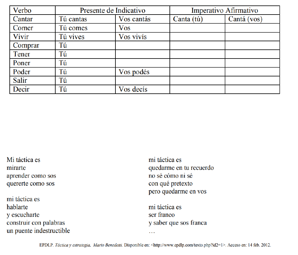 ACTIVIDADES – EL VOSEO 1. Complete el cuadro abajo conjugando los verbos que faltan. 2. El poema a continuación es de autoría del poeta uruguayo Mario Benedetti. Busque en él las formas verbales de voseo y reemplázalas por las formas de tuteo. Táctica y estrategia Mario Benedetti 3. Ponga los verbos entre paréntesis de las frases abajo en la forma adecuada de vos en Presente de Indicativo. a) Vos __________ demasiado. (hablar) b) __________ amigos de Carlos, ¿no? (Ser) c) ¿Por qué vos __________ tanto? (reírse) d) __________ temprano. Es muy importante que estemos todos. (Venir) e) No __________ miedo. (tener) f) __________ mucho. (Cantar) g) Seguro que vos __________ hacerlo. (poder) h) Vos ________ muchas manzanas. (comer)