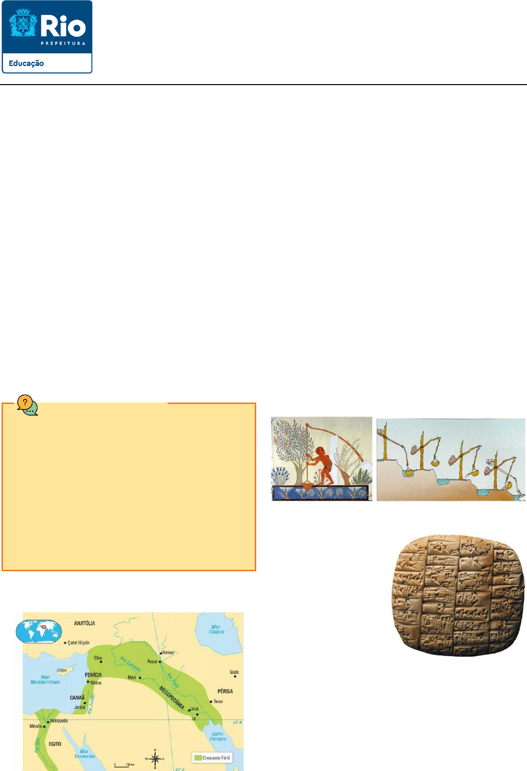 PREFEITURA DA CIDADE DO RIO DE JANEIRO Secretaria Municipal de Educação (SME) 8ª Coordenadoria Regional de Educação E. M. 08.17.028 Presidente Médici Disciplina: História | Prof.: Danilo de Lima | Ano: 6º | Turma: __________ | Data: _____/ _____/ _______ Estudante: __________________________________________________________________ Nº: _____ AS CIVILIZAÇÕES FLUVIAIS NA ÁFRICA E NA ÁSIA Conforme estudamos no 1º bimestre, durante o Paleolítico, as po- pulações mudavam constantemente de lugar – isto é, eram nômades – em busca de alimentos e melhores condições de vida. Esses grupos humanos viviam temporariamente em cavernas e outros abrigos. A fixação dos humanos no território começou a ocorrer no período Neolítico, com o desenvolvimento da agricultura e da pecuária. Esse processo de fixação em um lugar chama-se sedentarização. As mo- radias começaram a se transformar, pois passou a ser necessário construir habitações mais resistentes que abrigassem as pessoas por mais tempo. Os habitantes passaram a se organizar em grupos sociais e aos poucos foram surgindo os primeiros povoados e cidades. As primeiras cidades se formaram próximas a rios. Os vales dos rios atraíam os grupos humanos porque as terras eram férteis para a prática da agricultura e havia oferta de água para as atividades cotidianas e a criação de animais. O rio também era via de transporte para o deslocamento de pessoas e de mercadorias. Por meio dele, era possível se comunicar com outros povos, e isso facilitava a troca de informações e o comércio entre eles. Nos vales dos rios Nilo, Tigre, Eufrates, Indo, Amarelo e Azul, di- versos povos se organizaram e desenvolveram as primeiras civilizações conhecidas, entre 4.000 a.C. e 2.000 a.C. Por se desen- volverem próximo a rios, praticando atividades que dependiam deles, elas foram chamadas civilizações fluviais. Civilização é o conjunto de valores e de características culturais e materiais compartilhados por uma sociedade em determinado es- paço ao longo do tempo. Os costumes, as regras, as leis, as insti- tuições, o desenvolvimento econômico, as crenças religiosas, os va- lores sociais, tudo isso diz respeito ao conceito de civilização. En- tretanto, ao empregar essa palavra devemos ter cuidado, pois, du- rante muito tempo, o conceito de civilização foi usado como sinô- nimo de bom, culto, educado. E não ser civilizado era ser inculto, não educado. Ou seja, o conceito de civilização era utilizado para julgar (e condenar) sociedades com culturas diferentes das já co- nhecidas. Hoje sabemos que existiram e ainda existem muitas civilizações no mundo e que nenhuma delas pode ser considerada superior ou inferior às outras. Nesse material, iremos estudar duas civilizações fluviais: os povos da Mesopotâmia e o Antigo Egito. Observe o mapa a seguir: A Mesopotâmia é o nome de uma região do Oriente Médio localizada entre os rios Tigre e Eufrates. Atualmente, essa região é formada por países como Iraque, Kuwait, Síria e Irã. Na Antiguidade, no entanto, essa região atraiu diversos povos e foi ocupada (em geral, de modo violento) por eles, o que justifica a expressão “povos da Mesopotâmia”. Entre estes, destacaram-se os sumérios, babilônios, assírios e caldeus. Já a civilização egípcia se desenvolveu em uma região desértica no nordeste da África, às margens do rio Nilo. Segundo estudos ar- queológicos, desde cerca de 8.000 a.C. essa região já era ocupada por grupos seminômades, que sobreviviam praticando a caça, a pesca e a coleta de frutos e de cereais. Por volta de 5.000 a.C., vários desses grupos já haviam se tornado sedentários e aproveitavam a fertilidade propiciada pelo rio para desenvolver a agricultura e a criação de ani- mais. Ao longo do tempo, esses grupos se unificaram, formando núcleos populacionais maiores. Aos poucos, esses núcleos também se reuni- ram politicamente, dando origem a dois grandes reinos: o Baixo Egito e o Alto Egito. Em 3.100 a.C., forças militares do Alto Egito conquista- ram a região do Baixo Egito. Assim, os dois reinos foram submetidos ao comando de um único governante: o faraó. Tanto os mesopotâmicos quanto os egípcios dependiam dos rios para se desenvolver e sobreviver. Diante disso, ambas as civilizações desenvolveram técnicas de irrigação, como a construção de canais e diques, de modo que pudessem controlar as águas dos rios. O shaduf inventado pelos egípcios permitia bombear água de locais mais baixos para locais mais altos, alimentando, assim, os canais de irrigação e os reservatórios de água. As civilizações fluviais de- sempenharam um papel fun- damental no surgimento da escrita. As primeiras formas de escrita surgiram da neces- sidade de se registrar e contro- lar a produção de alimentos, facilitar as práticas comerciais, controlar os impostos arreca- dados e levantar e planejar a estrutura das obras. Na Mesopotâmia, por volta de 3.500 a.C., os sumérios criaram a escrita cuneiforme. Essa escrita envolvia o uso de mais de 700 símbolos. Os sinais eram gravados em placas úmidas de argila, que depois eram deixadas para secar ao sol. Os escribas, funcionários que faziam esses registros, tinham papel de destaque em toda a soci- edade mesopotâmica. MAS O QUE É CIVILIZAÇÃO? Comunicado real em escrita cuneiforme, peça suméria de cerca de 3.500 anos encontrada na Síria. Museu de Idlib, Síria, 2016. Assim como os sumérios, os egípcios também criaram um sistema de escrita que é considerado um dos mais antigos do mundo. No An- tigo Egito existiam três tipos de escrita: escrita hieroglífica (sagrada): utilizada nas paredes de templos e túmulos; escrita hierática (para documentos): usada em papiros e placas de barro; e escrita demótica (de uso popular). EXERCÍCIOS: “AS CIVILIZAÇÕES FLUVIAIS...” – BLOCO I ATENÇÃO: Responda às questões em seu caderno de História. 1. Com base no texto lido, 
