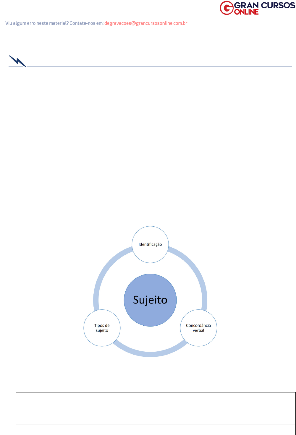 1www.grancursosonline.com.br Viu algum erro neste material? Contate-nos em: degravacoes@grancursosonline.com.br A N O TA ÇÕ E S Sujeito II LÍNGUA PORTUGUESA SUJEITO II RELEMBRANDO É necessário que se tenha três conhecimentos sobre o sujeito: • A identificação, o sujeito é o termo com o qual o verbo estabelece concordância, assim a identificação do sujeito passa pela concordância entre sujeito e o verbo, bem como por outras propriedades. • A relação entre o questionamento “o quê?” e “quem?” para se identificar o sujeito, que constitui mais uma forma, assim como saber que o sujeito é um termo não preposi- cionado, ou seja, não é iniciado por preposição, pois o núcleo do sujeito é sempre um substantivo sem preposição, bem como a existência de sujeitos oracionais (cujo o núcleo são verbos). • E que não se separa o sujeito do verbo por vírgula, ou seja, entre o sujeito e o verbo não haverá uma vírgula, mas pode ser marcado por duas vírgulas, intercalação, o que implica dizer que nem sempre a ocorrência de duas vírgulas marcará uma in- tercalação. www.grancursosonline.com.br 2www.grancursosonline.com.br Viu algum erro neste material? Contate-nos em: degravacoes@grancursosonline.com.br A N O TA ÇÕ E S Sujeito II LÍNGUA PORTUGUESA Tipos de Sujeito • Expressos: são visíveis, são sujeitos que estão verbalmente representados, estão escritos. S + V + C (sujeito + verbo + complemento) O sujeito expresso pode ser simples ou composto, que diferem apenas em relação a quantidade de núcleos. O sujeito simples possui apenas um núcleo e o sujeito composto possui mais de um núcleo. • Não Expressos: não são visíveis, não estão verbalmente representados na frase. Não apresenta o sujeito, apesar da sua posição estar marcada de alguma forma, soma- dos ao verbo e ao complemento. O sujeito não expresso marca a ocorrência do sujeito elíptico que também pode receber o nome de sujeito oculto ou desinencial. Há ainda a ocorrência do sujeito indeterminado. A dife- rença básica entre esses tipos de sujeito é a que o sujeito elíptico, apesar de não expresso, é identificável no texto ou no discurso. Enquanto o sujeito indeterminado não é identificável nem no texto e nem no discurso. 5m www.grancursosonline.com.br 3www.grancursosonline.com.br Viu algum erro neste material? Contate-nos em: degravacoes@grancursosonline.com.br A N O TA ÇÕ E S Sujeito II LÍNGUA PORTUGUESA Para entender o que é discurso, é necessário relembrar os elementos da comunicação. Entre os elementos da comunicação existe o emissor e o receptor, toda vez que ocorrer uma situação comunicativa. Além disso, o discurso marca a existência de três pessoas: a primeira pessoa do discurso, a segunda pessoa do discurso e a terceira pessoa do discurso. A primeira pessoa do discurso é aquela que fala, o emissor, que sempre é identificável. De maneira semelhante existem os receptores ou receptor que é a segunda pessoa do discurso, aquela para quem se fala ou com quem se fala, os receptores são identificáveis, pois toda vez que o emissor produz uma comunicação, o faz sabendo que há um receptor. Dessa forma, primeira e segunda pessoa do discurso serão sempre identificáveis, ou seja, eles exis- tem mesmo que não seja possível nominalizar cada um. . • Ocorrência no sujeito elíptico, oculto ou desinencial: – Verbo estará sempre na 1ª (eu e nós) ou na 2ª (tu e vós) pessoas do singular ou do plural; – Verbo na 3ª (ele/ela) pessoa do singular que servirá de indicação para saber no texto a referência desse sujeito; – Verbo no infinitivo pessoal não expresso; – Verbo na 3ª (eles/elas) pessoa do plural, apenas quando houver referente iden- tificável. • Ocorrência de sujeito indeterminado: – Verbo na 3ª (eles/elas) pessoa do plural sem referente textual; – Verbo na 3ª (eles/elas) pessoa do singular seguido do pronome “se”, que assumirá a função de índice de indeterminação do sujeito; – Infinitivo impessoal. ANÁLISE DO SUJEITO 5. Mentes tão bem. / Tu mentes tão bem. Na primeira frase “mentes tão bem” ao se perguntar “quem mente tão bem”, a resposta é “tu”, que não está verbalmente representado na frase, até porque se estivesse verbalmente representado no texto a frase seria “tu mentes tão bem”, em que “tu” seria o sujeito simples por estar verbalmente representado, mas a partir do momento que o sujeito é não expresso, 10m 15m www.grancursosonline.com.br 4www.grancursosonline.com.br Viu algum erro neste material? Contate-nos em: degravacoes@grancursosonline.com.br A N O TA ÇÕ E S Sujeito II LÍNGUA PORTUGUESA ele estará indicado pelo verbo “mentes” como sendo a 2ª pessoa do singular (tu), é o sujeito elíptico, embora não esteja expresso é identificável. O nome sujeito elíptico, decorre da elipse que é a omissão de um termo na sentença. Também chamado de desinencial por ser identificado a partir da terminação do verbo. E oculto, que não é a melhor terminologia, uma vez que o sujeito o receptor da mensagem é identificável. 6. Estamos chocados com esses crimes. “Quem – estamos chocados com esses crimes?”, a resposta é “nós”, 3ª pessoa do plural, sujeito elíptico por não estar expresso, mas ser possível a sua identificação. 7. Disseram palavras de amor. / Eles disseram palavras de amor. “Quem – disseram palavras de amor?”, a resposta é “eles ou elas”, 3ª pessoa do plural, sujeito elíptico que por não estar verbalmente representado e por não ser possível identificar o referente textual, constitui sujeito indeterminado. E, na forma da segunda frase “Eles disseram palavras de amor” constitui um sujeito simples. 8. Ouvi os poetas. Disseram palavras de amor. Aqui há dois períodos simples: Primeiro período: “Quem – ouvi os poetas?”, resposta “eu”, 1ª pessoa do singular, sujeito elíptico. Segundo período: “Quem 