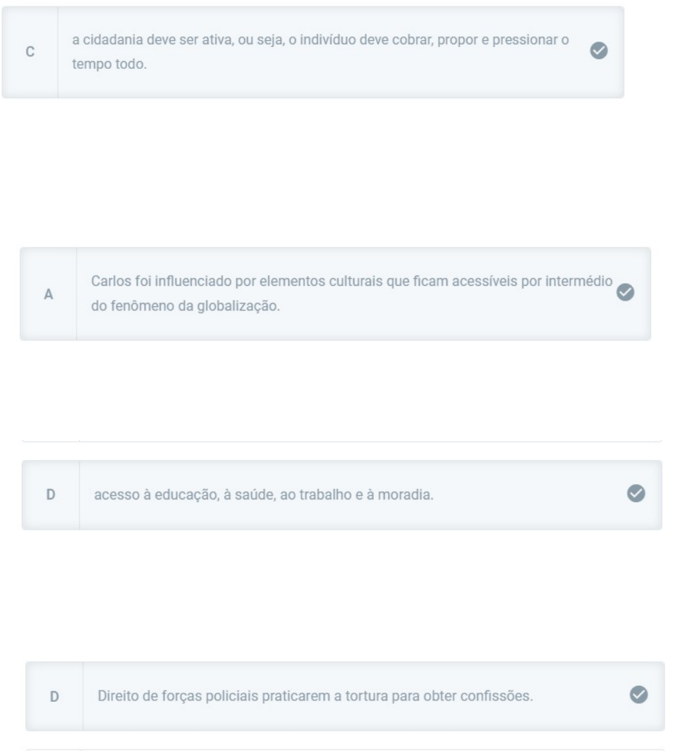 “Se devessem prevalecer os cidadãos passivos, os governantes acabariam por transformar seus súditos num bando de ovelhas dedicadas tão somente a pastar o capim uma ao lado da outra (e a não reclamar, acrescento eu, nem mesmo quando o capim é escasso” (BOBBIO, 2001, p. 21). De acordo com esse pensamento, podemos afirmar que Carlos está montando a sua agenda do fim de semana. “Mainha, sei não, acho que hoje vou na cerimônia de lavagem do Bonfim. Mais tarde, vou comer naquele restaurante novo japonês e fechar a noite no show de reggae. Oxe, viu?” A partir da leitura deste material e a partir dos planos de Carlos, podemos inferir que No Brasil, a Constituição de 1988 demonstra uma preocupação mais explícita com os valores de justiça e liberdade. Nesse contexto, o exemplo de um direito social contemplado na Constituição brasileira é a garantia de A Constituição de 1988, conhecida como Constituição Cidadã, foi considerada uma grande conquista democrática após mais de duas décadas de regimes militares por garantir amplos direitos à população brasileira, em vários âmbitos da vida social. Dito isso, aponte, entre as alternativas abaixo, qual direito não está garantido na Constituição de 1988. Toda pessoa tem direito à liberdade de opinião e expressão. Esse direito inclui a liberdade de, sem interferência, ter opiniões e de procurar, receber e transmitir informações e ideias por quaisquer meios e independentemente de fronteiras. Tal princípio está positivado na(o) A questão da cidadania atrelada aos direitos humanos é um dos aspectos mais marcantes da contemporaneidade. “A noção clássica que influencia até hoje a discussão sobre o tema, advém de Marshall (1967), que afirmava que a cidadania é aquele estatuto que se concede aos membros de pleno direito de uma comunidade. Os seus beneficiários são iguais no que respeita a direitos e obrigações” (BERAS, 2013, p. 36). A partir das informações apresentadas, avalie as afirmações a seguir: I) Ser cidadão é ter direito à vida, à liberdade, à propriedade, à igualdade perante a lei, ou seja, é ter direitos civis. II) Ser cidadão é também possuir direitos políticos, poder votar, ser votado, e expressar opiniões ideológicas diversas. III) Ser cidadão é também possuir direitos sociais, que inclui o direito à educação, ao trabalho, ao salário justo e à saúde. É correto o que se afirma em (Adaptada: FEPESE – 2011) Enchentes devastadoras, desmoronamento de encostas, destruição de pontes e estradas são algumas consequências das mudanças climáticas que estamos vivendo. Dito isso, assinale a alternativa que menciona algumas das causas desses eventos. Uma das práticas a serem adotadas visando à efetiva conservação da natureza e ao desenvolvimento sustentável é, sem dúvida, a educação ambiental. Considerando os diferentes aspectos desse processo, assinale a alternativa incorreta. A respeito das dimensões dos direitos fundamentais, assinale a alternativa correta Os direitos difusos são típicos da terceira geração de direitos fundamentais, marcada especialmente pelo ideal de solidariedade. Os direitos fundamentais podem sofrer restrições e não se sujeitam a qualquer prazo para serem exercidos”. A afirmação acima se refere a quais características dos direitos fundamentais? Relatividade e imprescritibilidade. Em relação aos destinatários, será que eles se aplicam também às pessoas jurídicas ou apenas às pessoas físicas? O entendimento majoritário é o de que esses direitos também se lhes aplicam desde que haja compatibilidade com a natureza da pessoa jurídica. O direito à vida ou de ir e vir, por óbvio, não são aplicáveis às pessoas jurídicas. Contudo, há diversos outros direitos que se estendem a elas, como o direito de propriedade, o sigilo das correspondências, dentre outros. Há, inclusive, direitos que são típicos de pessoas jurídicas, como o direito à propriedade das marcas e ao nome da empresa. A respeito da liberdade religiosa, marque a alternativa correta: A liberdade religiosa permite a prática de cultos religiosos, ainda que envolvam o sacrifício de animais. Assinale a alternativa correta a respeito dos direitos fundamentais previstos na Constituição Federal de 1988: O direito à moradia está no rol dos direitos sociais e exige que o poder público atue para garanti-lo. Ao acompanhar a história das declarações de direitos produzidas ao longo do tempo compreendemos que O conjunto de Direitos Humanos que compreendemos atualmente é fruto de uma construção histórica que se expandiu por vários países e está em constante evolução. Os Direitos Humanos possuem algumas características que os ajudam a se fortalecer e ser garantidos por um todo. Sobre essas características, é correto afirmar que: Todos os direitos são indivisíveis, ou seja, precisam ser respeitados como um todo Segundo a filósofa Hannah Arendt, apesar dos esforços para a construção dos direitos humanos, alguns acontecimentos do final do século XIX e do início do século XX causaram uma ruptura desses direitos e, por conta disso, a autora defende uma reconstrução dos Direitos Humanos. Sobre o assunto, assinale a alternativa correta: O ponto-chave na teoria da autora é a luta pelo direito a se ter direitos, pois muitas pessoas se encontram totalmente desprotegidas e sem possibilidade de recorrer a ajuda de nenhum Estado. Para se consolidarem os Direitos Humanos, foi preciso basear sua argumentação em diversas correntes filosóficas jurídicas. Sobre a fundamentação dos direitos humanos, podemos afirmar que: Não há como determinar que corrente teórica é mais importante para a consolidação dos Direitos Humanos, pois todos os argumentos reforçam a importância desses direitos. A universalidade é uma característica que levanta um amplo debate sobre a forma como os direitos humanos se apresentam ao mundo. Sendo assim, é