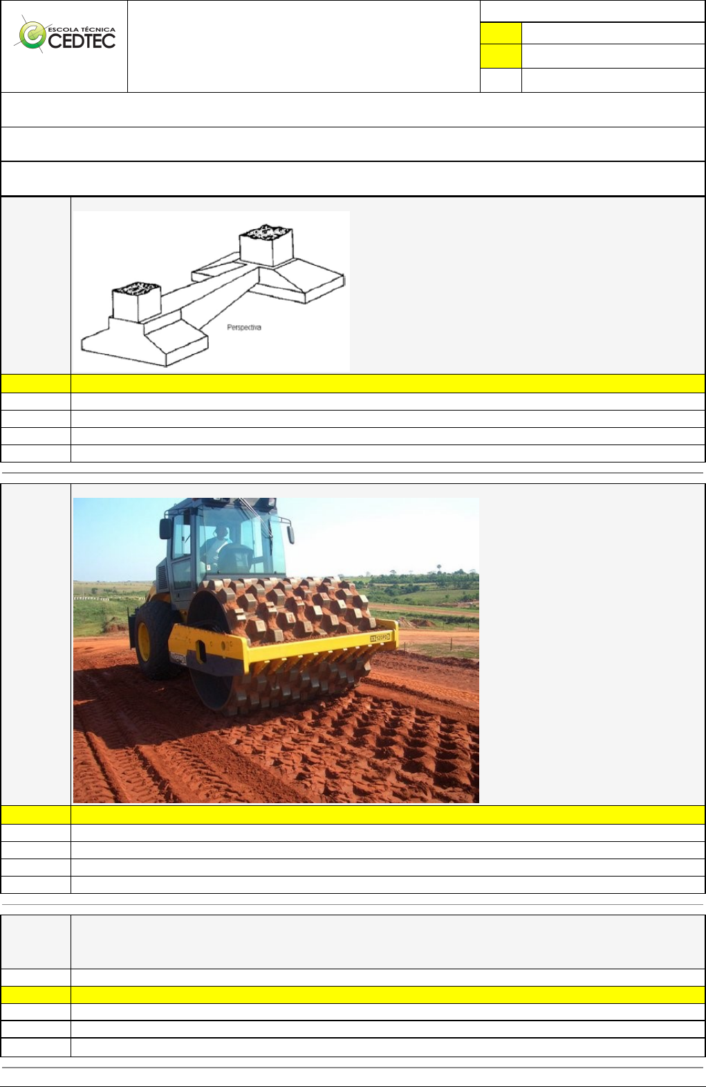 Pincel Atômico - 04/06/2024 17:01:18 1/4 INGRIDY NASCIMENTO FERNANDES Avaliação Presencial (EAD) Atividade finalizada em 06/09/2023 16:39:46 (1138703 / 1) LEGENDA Resposta correta na questão # Resposta correta - Questão Anulada X Resposta selecionada pelo Aluno Disciplina: MECÂNICA DOS SOLOS [838735] - Avaliação com 20 questões, com o peso total de 51,00 pontos [capítulos - Todos] Turma: Curso Técnico: Edificações - Grupo: EAD - 05/23 - EAD EDI [88404] Aluno(a): 91131784 - INGRIDY NASCIMENTO FERNANDES - Respondeu 13 questões corretas, obtendo um total de 33,15 pontos como nota [350162_8695 ] Questão 001 Analisando a figura, diga que tipo de fundação ela se refere. X Sapata Alavancada Blocos Sapata corrida Sapatas Radier [350162_5644 ] Questão 002 O equipamento na inagem abaixo é aconselhável para compactação de qual tipo de solo: X Solos coesivos como argilas Solos arenosos Solos secos Solos coesivos com areias Solos orgânicos [350162_8704 ] Questão 003 Calcule o Peso Específico dos Grãos (δ), utilizando como exemplo os valores: P1 = 673 g; P2 = 740,66 g e Ps = 110,99 g. 24,72 g/cm³ 25,63 g/cm³ 25,87 g/cm³ 25,51 g/cm³ X 24,99 g/cm³ Pincel Atômico - 04/06/2024 17:01:18 2/4 [350162_8678 ] Questão 004 Qual a definição correta de solo sedimentar? X São aqueles formados através da ação do intemperismo, como também confinados sob pressão da crosta terrestre. São aqueles formados por minerais laminares São os que desde a sua origem até a data de análise por amostragem permaneceram no mesmo local de formação. São aqueles em que o agregado sólido ocorre naturalmente e é constituído por um ou mais minerais. São aqueles originados em um local e transportados para outro. [350162_1055 16] Questão 005 A fundação de uma obra em estaca executada por perfuração mediante balde-sonda (piteira), com uso parcial ou total de revestimento recuperável, e posterior concretagem, é chamada de estaca: Estação Broca Injetada Tipo Franki X Tipo Strauss [350162_8686 ] Questão 006 São utilizados vários métodos para estabilizar um solo, sendo eles métodos físicos, químicos e mecânicos. Qual das alternativas refere-se a um método mecânico? Vibroflotação Asfalto Confinamento Mistura X Compactação [350162_6872 7] Questão 007 Uma amostra de solo tem volume de 60 cm³ e massa de 92,5 g. Depois de completamente seca, sua massa é de 74,3 g. A massa específica dos grãos sólidos é 2,62 g/cm³. Calcule a umidade deste solo. h = 24,00%. h = 25,50%. h = 14,50%. X h = 24,50%. h = 25,00%. [350162_8698 ] Questão 008 A seguinte definição refere-se a qual tipo de Estabilização de Talude de Corte: “São estruturas corridas que se opõem aos empuxos horizontais pelo peso próprio. Geralmente, são utilizadas para conter desníveis pequenos ou médios, inferiores a cerca de 5 m”. Muros de Alvenaria X Muros de Gravidade Muros de Flexão Muros de Concreto Muros de Gabião [350162_2265 ] Questão 009 Sobre as estacas Franki podemos afirmar: Possui grande vantagem pois não exige um estudo geotécnico do solo para a sua execução. Seu processo de execução não causa vibrações nas fundações visinhas. É considerada uma estaca pré-moldada, pois não é fabricada in loco. X É considerada mais custosa que as estacas pré–moldadas e hélice. É a estaca de custo mais baixo. [350162_5699 ] Questão 010 Sobre a tecnologia de taludes atirantados, assinale a alternativa INCORRETA: Pode ser do tipo ativo ou passivo. É muito utilizada em obras ferroviárias e rodoviárias. Pincel Atômico - 04/06/2024 17:01:18 3/4 X São estruturas de concreto armado que recebem força adicional de tirantes tracionados. São estruturas que necessitam de uma espessura maior que muros de arrimo. Antes do projeto e execução deve ser realizado um estudo geotécnico para se identificar as condições do maciço. [350163_1055 11] Questão 011 Nos solos granulares, há pouca ou nenhuma coesão entre os grãos, existindo, entretanto, atrito interno entre eles. O equipamento indicado para a compactação desse tipo de solo é o rolo: X Liso vibratório Escarificador Pneumático com rodas oscilantes Pé-de-carneiro Pé-de-carneiro vibratório [350163_2271 ] Questão 012 Sobre o adensamento do solo, marque a opção correta: É um processo químico que tem como objetivo remover em curto prazo o ar do solo. É um processo bioquímico responsável pela remoção do ar do solo. É um processo físico responsável por remover a água do solo. X É um processo físico que busca remover o ar do solo. É um processo químico que busca remover a água do solo em longo prazo. [350163_6873 2] Questão 013 Para um dado solo arenoso, ð•‘’ð•‘šáð•‘¥ = 0,75, ð•‘’ð•‘šíð•‘› = 0,46, 𕕺 = 2,68. Qual será o peso unitário úmido de compactação (kN/m³) no campo se CR = 78% e ℎ = 9%? X 18,00 kN/cm³. 18,80 g/cm³. 10,80 g/cm³. 18,80 kN/m³. 10,80 g/m³. [350163_1055 14] Questão 014 Pretende-se construir uma edificação com área total de 1 600 m2 e área de projeção horizontal no terreno de 800 m2. Antes da definição do tipo de fundação, deve-se planejar uma programação de sondagens de simples reconhecimento do solo, com o seguinte número mínimo de furos: X 4 9 2 1 6 [350163_8689 ] Questão 015 No campo, a proporção em que o aterro for sendo executado, deve-se verificar, para cada camada compactada, qual o teor de umidade empregado e compara-lo com a umidade ótima determinada em laboratório. Este valor deve atender a seguinte especificação: Wcampo -1% < Wótima < Wcampo +1% X Wcampo -2% < Wótima < Wcampo +2% Wcampo -3% < Wótima < Wcampo +3% Wcampo -5% < Wótima < Wcampo +5% Wcampo -4% < Wótima < Wcampo +4% [350163_6873 3] Questão 016 Um aterro de areia fofa não compactada tem 1,83 m de profundidade e compacidade relativa de 40%. Testes de laboratório indicaram que os índices de vazios mínimo e máximo da areia são 0,46 e 0,9
