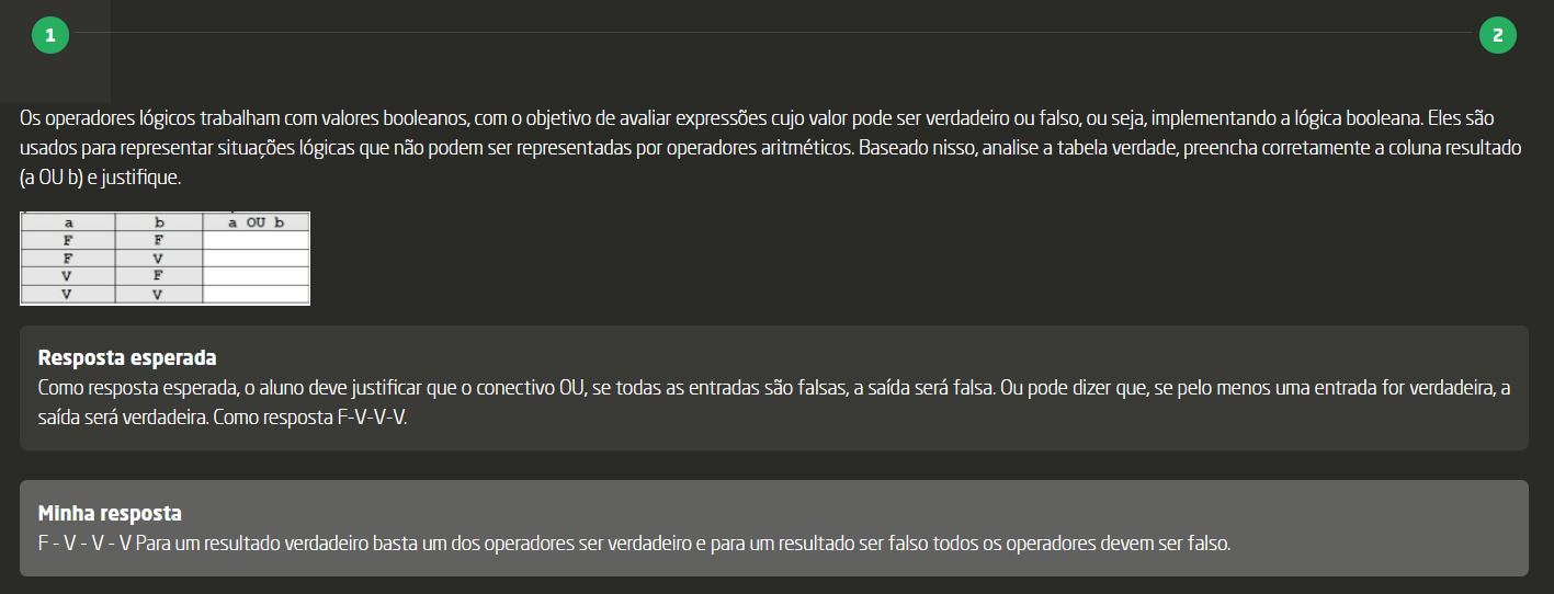 Os operadores lógicos trabalham com valores booleanos, com objetivo de avaliar expressões cujo valor pode ser verdadeiro ou falso, ou seja, implementando a lógica booleana. Eles são usados para representar situações lógicas que não podem ser representadas por operadores aritméticos. Baseado nisso, analise a tabela verdade, preencha corretamente a coluna resultado (a OU b) e justifique. a b a OU b F F F V V F V V Resposta esperada: F-V-V-V. Como resposta esperada, aluno deve justificar que conectivo OU, se todas as entradas são falsas, a saída será falsa. Ou pode dizer que, se pelo menos uma entrada for verdadeira, a saída será verdadeira. Minha resposta: F V - V - V. Para um resultado verdadeiro basta um dos operadores ser verdadeiro e para um resultado ser falso todos os operadores devem ser falso.