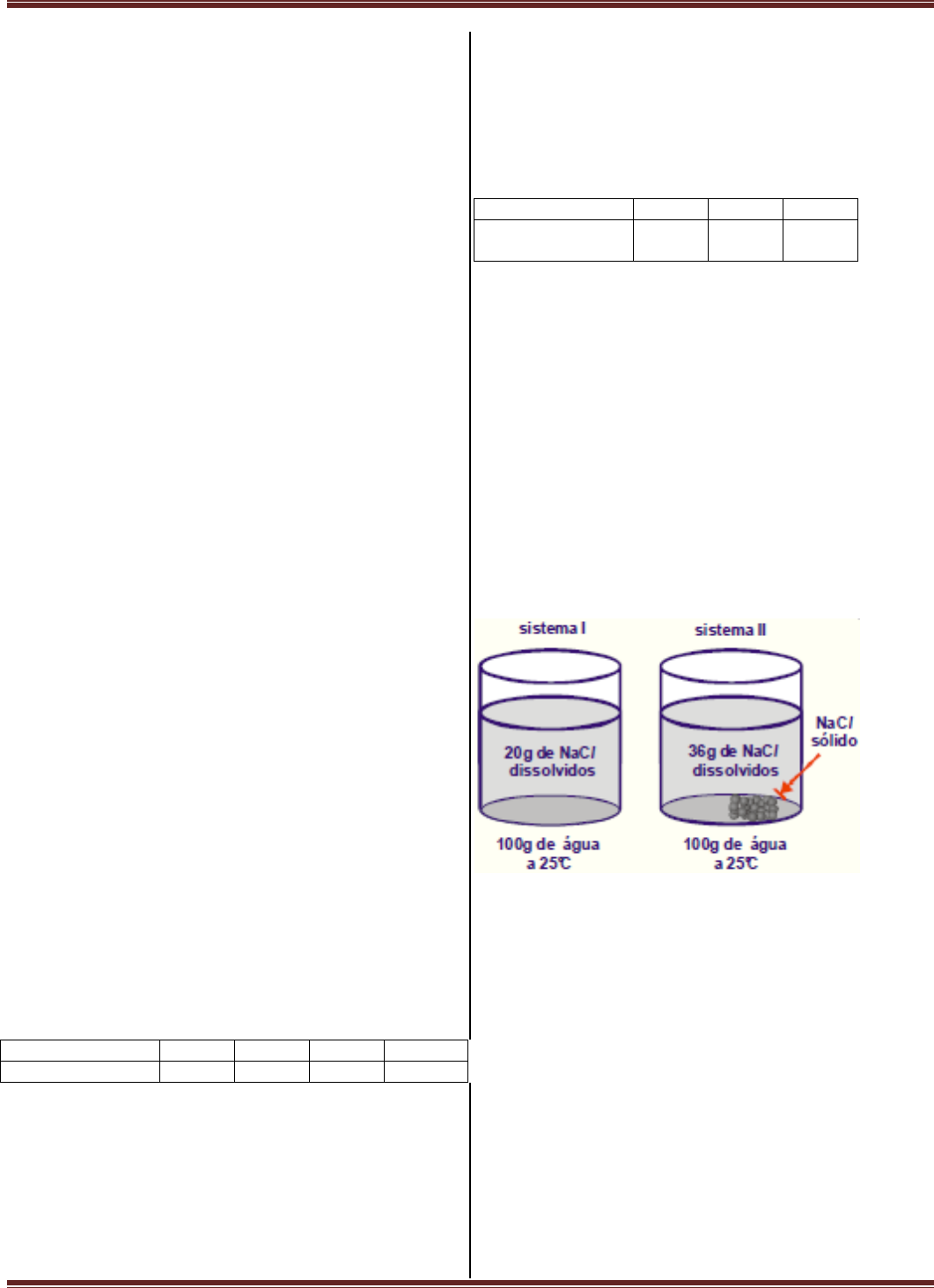 2ª SÉRIE DO ENSINO MÉDIO PROF.: RENÉ DOS REIS BORGES 1 EXERCÍCIOS DE SOLUBILIDADE 01 – Uma solução composta por duas colheres de sopa de açúcar (34,2g) e uma colher de sopa de água (18,0 g) foi preparada. Podemos dize r que: 1) A água é o solvente, e o açúcar o soluto. 2) O açúcar é o solvente, uma vez que sua massa é maior que a da água. 3) À temperatura ambiente o açúcar não pode ser considerado solvente por ser um composto sólido. Está(ão) correta(s): a) 1 apenas b) 2 apenas c) 3 apenas d) 1 e 3 apenas e) 1, 2 e 3 02 – Um determinado sal tem coeficiente de solubilidade igual a 34g/100g de água, a 20ºC. Tendo-se 450g d água a 20 ºC, a quantidade, em gramas, desse sal, que permite preparar uma solução saturada, é de: a) 484g. b) 450g. c) 340g. d) 216g. e) 153g. 03 – A solubilidade do K2Cr2O7, a 20ºC, é de 12g/100g de água. Sabendo que uma solução foi preparada dissolvendo-se 20g do sal em 100g de água a 60ºC e que depois, sem manter em repouso, ela foi resfriada a 20ºC, podemos afirmar que: a) todo sal continuou na solução. b) todo sal passou a formar um corpo de chão. c) 8g de sal foi depositado no fundo do recipiente. d) 12g do sal foi depositado no fundo do recipiente. e) 31g do sal passou a formar um corpo de chão. 04 – Após a evaporação de toda a água de 25g de uma solução saturada (sem corpo de fundo) da substância X, pesou-se o resíduo sólido, obtendo-se 5g. Se, na mesma temperatura do experimento anterior, adicionarmos 80g da substância X em 300g de água, teremos uma solução: a) insaturada. b) saturada sem corpo de fundo. c) saturada com 5g de corpo de fundo. d) saturada com 20g de corpo de fundo. e) supersaturada. 05 – Quatro tubos contêm 20 mL de água cada um. Coloca-se nesses tubos dicromato de potássio nas seguintes quantidades: A solubilidade do sal, a 20ºC, é igual a 12,5g por 100 mL de água. Após agitação, em quais dos tubos coexistem, nessa temperatura, solução saturada e fase sólida? a) em nenhum. b) apenas em D. c) apenas em C e D. d) apenas em B, C e D. e) em todos. 06 – O coeficiente de solubilidade de um sal é de 60 g por 100 g de água a 80°C. A massa em gramas desse sal, nessa temperatura, necessária para saturar 80 g de H2O é: a) 20. b) 48. c) 60. d) 80. e) 140. 07 – Considere uma solução aquosa saturada de KCl, com corpo de fundo, a 20ºC e os seguintes valores: De acordo com os dados acima, para diminuir a massa do corpo de fundo basta: I. Aquecer o sistema. II. Adicionar água e agitar. III. Agitar a solução. IV. Decantar a solução. Dessas afirmações, são corretas apenas: a) I e II. b) I e III. c) II e III. d) II e IV. e) III e IV. 08 – Observe os sistemas Agora analise estas afirmações: I. No sistema I, a solução está insaturada. II. No sistema II, a solução está saturada. III. Não existe solução saturada sem precipitado. Está(ao) correta(s) somente a(s) afirmativa(s): a) I. b) II. c) III. d) I e II. e) I e III. 09 – Colocando-se 400g de cloreto de sódio (NaCl) em 1 litro de água pura, à temperatura de 25°C, podemos afirmar que: Dado: CS = 360g de NaCl / L de água, a 25°C. a) O sal se dissolve totalmente. b) O sal não se dissolve. c) Parte do sal se dissolve e o excesso se deposita, formando uma solução saturada. d) O cloreto de sódio, a 25°C, é insolúvel. e) Precisaríamos de 200g de cloreto de sódio a mais para que ele se dissolvesse totalmente. Tubo A Tubo B Tubo C Tubo D Massa de K2Cr2O7 1,0g 2,5g 5,0g 7,0g 10°C 20°C 30°C Solubilidade do KCl/1kg de água 1,0g 2,5g 5,0g 2ª SÉRIE DO ENSINO MÉDIO PROF.: RENÉ DOS REIS BORGES 2 10 – Observe a seqüência abaixo, em que o sistema I se encontra a 25°C com 100g de água: Analise agora as seguintes afirmativas: I. A 25°C, a solubilidade do sal é de 20g/100g de á gua. II. O sistema III é uma solução supersaturada. III. O sistema I é uma solução insaturada. IV. Colocando-se um cristal de sal no sistema III, este se transformará rapidamente no sistema I. Está(ao) correta(s) somente a(s) afirmativa(s): a) II e IV. b) I e III. c I e II. d) I, II e III. e) II, III e IV. 11 – (MACKENZIE-SP) T (°C) Solubilidade do KCl (g/100g de água) 0 27,6 20 34,0 40 40,0 60 45,5 Em 100g de água a 20°C, adicionam-se 40,0g de KCl. Conhecida a tabela acima, após forte agitação, observa-se a formação de uma: a) solução saturada, sem corpo de chão. b) solução saturada, contendo 34,0g de KCl, dissolvidos em equilíbrio com 6,0g de KCl sólido. c) solução não saturada, com corpo de chão. d) solução extremamente diluída. e) solução extremamente concentrada. 12 – Prepararam-se duas soluções, I e II, através da adição de 5,0 g de cloreto de sódio, NaCl, e 5,0 g de sacarose, C12H22O11, respectivamente, a 10 g de água e a 20°C, em cada recipiente. Considerando que as solubilidades (g do soluto/ 100 g de H2O) do NaCl e da C12H22O11 são 36 e 203,9, respectivamente, em relação às soluções I e II, pode-se afirmar que: a) a solução I é saturada e todo o soluto adicionado se dissolveu. b) a solução II é insaturada e todo o açúcar adicionado se dissolveu. c) ambas são saturadas e nem todo o soluto adicionado se dissolveu. d) ambas são instauradas e todo o soluto adicionado se dissolveu. e) ambas são supersaturadas. 13 – As curvas de solubilidade têm grande importância no estudo das soluções, já que a temperatura influi decisivamente na solubilidade das substâncias. Considerando as curvas de solubilidade dadas pelo gráfico, é correto afirmar que: a) há um aumento da solubilidade do sulfato de cério com o aumento da temperatura. b) a 0ºC o nitrato de sódio é menos solúvel que o cloreto de potássio. c) o nitrato de sódio é a substância que apresenta a maior solubilidade a 20ºC. d) resfriando-se uma solução saturada de KClO3, preparada com 100 g de água, de 90ºC para 20ºC, observa-se a precipitação de 30 g desse sal. e) dissolvendo-se