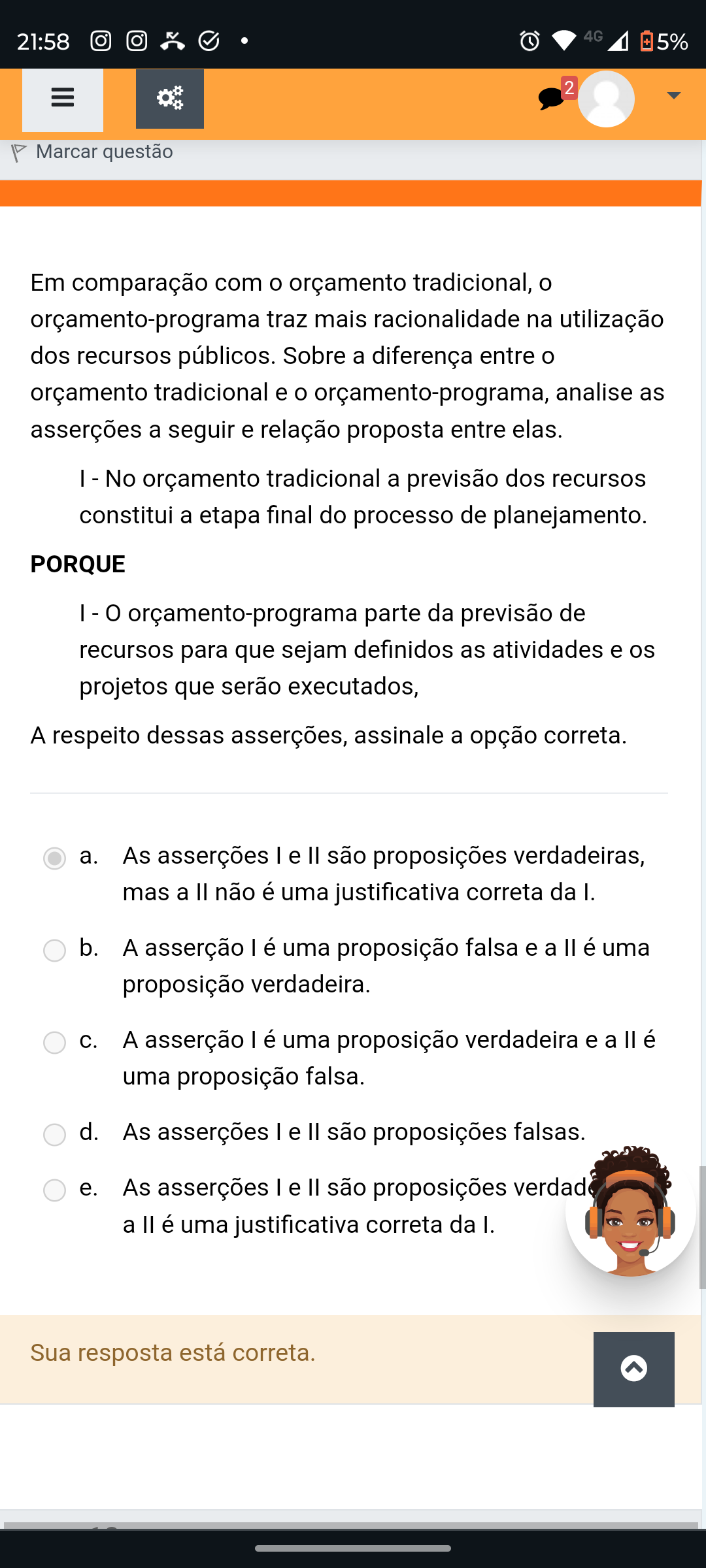 Em comparação com o orçamento tradicional, o orçamento-programa traz mais racionalidade na utilização dos recursos públicos. Sobre a diferença entre o orçamento tradicional e o orçamento-programa, analise as asserções a seguir e relação proposta entre elas. - No orçamento tradicional a previsão dos recursos constitui a etapa final do processo de planejamento. PORQUE - - orçamento-programa parte da previsão de recursos para que sejam definidos as atividades e os projetos que serão executados, A respeito dessas asserções, assinale a opção correta.