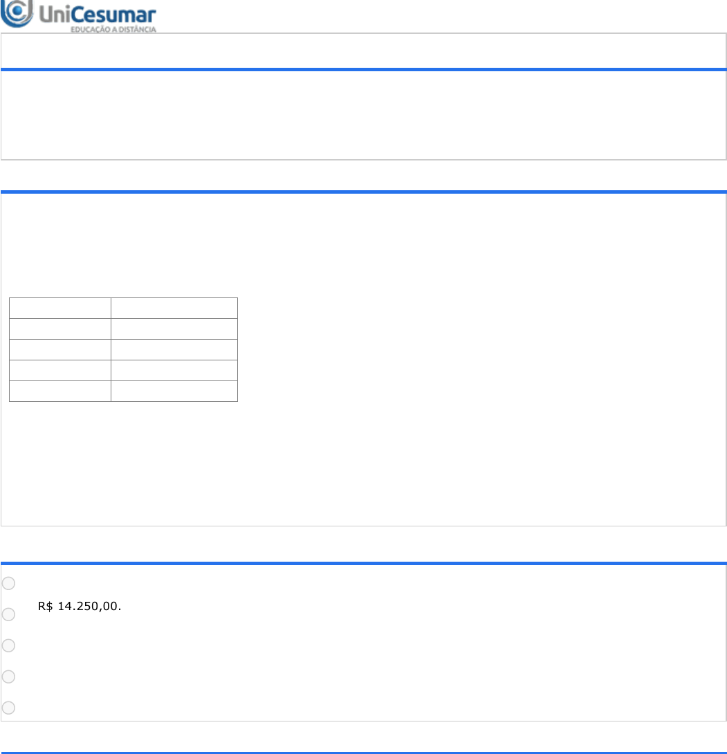 ATIVIDADE 2 - LOG - GESTÃO DOS CUSTOS LOGÍSTICOS - 52_2024 Período:10/06/2024 08:00 a 30/06/2024 23:59 (Horário de Brasília) Status:ABERTO Nota máxima:0,50 Gabarito:Gabarito será liberado no dia 01/07/2024 00:00 (Horário de Brasília) Nota obtida: 1ª QUESTÃO (Situação hipotética) O almoxarifado de uma indústria é classificado como departamento de serviço, ou seja, ele participa do processo produtivo de forma indireta. Neste sentido, imagine que em uma empresa os gastos realizados pelo almoxarifado no mês de outubro totalizaram R$ 57.000,00. Neste período, o departamento atendeu às seguintes requisições: DepartamentoNº de Requisições X 95 Y 152 Z 76 W 57 Fonte: Elaborado pelo professor, 2020. Considerando estes dados, calcule o rateio dos gastos do almoxarifado com base no número de requisições atendidas para cada departamento. Em seguida, assinale a alternativa que apresenta o valor rateado ao departamento X. ALTERNATIVAS R$ 22.800,00. R$ 14.250,00. R$ 18.750,00. R$ 11.400,00. R$ 8.550,00. 2ª QUESTÃO 27/06/2024, 10:25 Unicesumar - Ensino a Distância about:blank 1/7 rafaela.anjos Realce (Situação hipotética) A classificação dos gastos em despesas ou custos é o primeiro passo para apurar o custo de um produto ou de um serviço. Durante o mês de dezembro de 20X0 ocorreram os seguintes gastos na empresa ProdMat: Comissão de vendedores R$ 4.500,00 Depreciação de máquinas industriais R$ 2.300,00 Despesas bancárias R$ 920,00 Energia elétrica da área administrativa R$ 800,00 Energia elétrica da fábrica R$ 2.100,00 Matéria-prima consumida R$ 23.400,00 Depreciação dos móveis do escritório R$ 780,00 Salários e encargos do pessoal da fábrica R$ 14.700,00 Salários e encargos da administração R$ 9.400,00 Honorários da diretoria R$ 5.600,00 Material secundário consumido R$ 10.500,00 Fonte: Elaborado pelo professor, 2020. Considerando as informações apresentadas, assinale a alternativa que apresente o valor total das despesas e, o valor total dos custos, respectivamente. ALTERNATIVAS R$ 12.600,00 e R$ 62.400,00. R$ 17.500,00 e R$ 57.500,00. R$ 22.000,00 e R$ 53.000,00. R$ 26.400,00 e R$ 48.600,00. R$ 36.700,00 e R$ 38.300,00. 3ª QUESTÃO Durante o processo produtivo é comum ocorrer sobras de matéria-prima ou de materiais. Contudo, essas sobras podem ocorrer de forma normal e previsível, ou seja, dentro do que se espera no processo, ou podem ocorrer de forma anormal e inesperada. Sendo assim, a forma com que essas sobras são geradas, interfere na maneira em que a contabilidade deverá realizar seu registro. Fonte: Elaborado pelo professor, 2020. A respeito das sobras e, a sua correta contabilização, analise as seguintes asserções e a relação proposta entre elas. I. As sobras normais e as sobras anormais recebem tratamento contábil diferente. PORQUE II. As sobras normais, como já são esperadas, são contabilizadas como custo do processo produtivo. Já as sobras anormais, como são imprevisíveis, são classificadas como perda e contabilizadas como despesa no período em que ocorrem. A respeito dessas asserções, assinale a alternativa correta. 27/06/2024, 10:25 Unicesumar - Ensino a Distância about:blank 2/7 rafaela.anjos Realce ALTERNATIVAS As asserções I e II são proposições verdadeiras, e a II é uma justificativa correta da I. As asserções I e II são proposições verdadeiras, mas a II não é uma justificativa correta da I. A asserção I é uma proposição verdadeira, e a II é uma proposição falsa. A asserção I é uma proposição falsa, e a II é uma proposição verdadeira. As asserções I e II são proposições falsas. 4ª QUESTÃO (Situação hipotética) Para não faltar tecido para fabricação de peças de roupa, a indústria Veste Bem estoca no mínimo a quantidade necessária para 15 dias de produção. Por esse motivo a indústria comprou 6.000m de um determinado tecido pelo valor total de R$ 36.000,00, deste valor a empresa pode recuperar R$ 4.320,00 de ICMS. Além desse gasto, a empresa ainda teve que desembolsar R$ 1.500,00 para pagar o frete. Fonte: Elaborado pelo professor, 2020. Considerando essas informações, podemos afirmar que o custo de aquisição dessa matéria-prima foi de: ALTERNATIVAS R$ 30.180,00. R$ 33.180,00. R$ 31.680,00. R$ 36.000,00. R$ 37.500,00. 5ª QUESTÃO Uma indústria de confecções, tem um funcionário que atua na linha de produção, cujo o salário mensal é de R$ 1.408,00, para uma jornada de 176 horas mensais (8 x 22 dias), sendo que o custo de hora trabalhada é de R$8,00. No relatório mensal do setor, foi constato que, o funcionário trabalhou 115 horas confeccionando bolsa e 45 horas confeccionando carteira. Fonte: adaptada de: FRAGALLI, Adriana Casavechia; MORAES, Juliana da Silva; PARDO, Paulo. Gestão dos custos Logísticos. Maringá: UniCesumar, 2020. Considerando o caso hipotético acima, avalie as afirmativas abaixo referente aos custos de mão de obra que a empresa terá que pagar: I. O custo de mão de obra indireta que a indústria terá que pagar, será de R$ 128,00. II. O custo total da mão de obra direta que a indústria terá que pagar, será de R$ 1.408,00. III. O custo de mão de obra direta que a indústria terá que pagar confeccionando a bolsa, será de R$ 920,00. IV. O custo de mão de obra direta que a indústria terá que pagar confeccionando a carteira, será de R$ 360,00. É correto o que se afirma em: ALTERNATIVAS 27/06/2024, 10:25 Unicesumar - Ensino a Distância about:blank 3/7 rafaela.anjos Realce rafaela.anjos Realce I, apenas. II e IV, apenas. III e IV, apenas. I, III e IV, apenas. I, II, III e IV. 6ª QUESTÃO O método de custeio variável é amplamente usado por ser bastante simples e objetivo. O custo variável, como a própria nomenclatura sugere, é aquele que varia de acordo com a produção da empresa. Esse tipo de custeio é frequentemente usado para identificar o número de itens que precisam ser vendidos para que o neg
