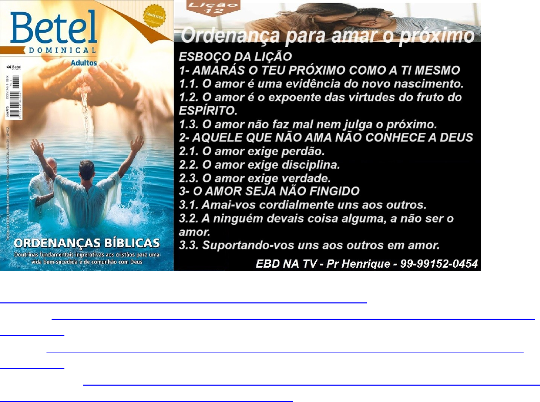 Lição 12, Betel, Ordenança para amar o próximo, 2 Tr24, Pr Henrique, EBD NA TV Para me ajudar PIX 33195781620 (CPF) Luiz Henrique de Almeida Silva EBD, Revista Editora Betel, 2° Trimestre De 2024, TEMA, ORDENANÇAS BÍBLICAS – Doutrina Fundamentais Imperativas aos Cristãos para uma vida bem-sucedida e de Comunhão com DEUS, Escola Bíblica Dominical. https://youtu.be/o-Ug_k0C_2s?si=tIE1TO76JwVzGybR Vídeo Escrita https://ebdnatv.blogspot.com/2024/06/escrita-licao-12-betel-ordenanca-para.html Slides https://ebdnatv.blogspot.com/2024/06/slides-licao-12-betel-ordenanca-para.html PowerPoint https://pt.slideshare.net/slideshow/slides-licao-12-betel-ordenanca-para-amar-o-proximo-2tr24-pptx/269795519 ESBOÇO DA LIÇÃO 1- AMARÁS O TEU PRÓXIMO COMO A TI MESMO 1.1. O amor é uma evidência do novo nascimento. 1.2. O amor é o expoente das virtudes do fruto do ESPÍRITO. 1.3. O amor não faz mal nem julga o próximo. 2- AQUELE QUE NÃO AMA NÃO CONHECE A DEUS 2.1. O amor exige perdão. 2.2. O amor exige disciplina. 2.3. O amor exige verdade. 3- O AMOR SEJA NÃO FINGIDO 3.1. Amai-vos cordialmente uns aos outros. 3.2. A ninguém devais coisa alguma, a não ser o amor. 3.3. Suportando-vos uns aos outros em amor. TEXTO ÁUREO “O meu mandamento é este: Que vos ameis uns aos outros, assim como eu vos amei.” João 15.12 VERDADE APLICADA O amor de DEUS derramado em nós pelo Seu ESPÍRITO deve ser expressado em nosso relacionamento com DEUS e com o próximo. OBJETIVOS DA LIÇÃO Mostrar que amar o próximo é um mandamento. - Ressaltar que quem não ama não conhece a DEUS. - Conscientizar de que o amor não pode ser de fingimento. TEXTO DE REFERÊNCIA – Mc 12.31; Rm 13.8; 1Jo 3.11; 1Jo 4.11 MARCOS 12 31 E o segundo, semelhante a este, é: Amarás o teu próximo como a ti mesmo. Não há outro mandamento maior do que estes. ROMANOS 13 8 A ninguém devais coisa alguma, a não ser o amor com que vos ameis uns aos outros; porque quem ama aos outros cumpriu a lei. 1 JOÃO 3 11 Porque esta é a mensagem que ouvistes desde o princípio: que nos amemos uns aos outros. 1 JOÃO 4 11 Amados, se DEUS assim nos amou, também nós devemos amar uns aos outros. LEITURAS COMPLEMENTARES SEGUNDA | 1 Co 13.7 O amor tudo sofre, tudo crê, tudo espera. TERÇA | Rm 12.9 O amor seja não fingido. QUARTA | Rm 12.10 Amai-vos cordialmente uns aos outros. QUINTA | Rm 13.10 O amor não faz mal ao próximo. SEXTA | 1 Jo4.3 Aquele que não ama não conhece a DEUS. SÁBADO | 1 Jo 4.20 Quem não ama a seu irmão, não ama a DEUS. HINOS SUGERIDOS: 35, 175, 396 MOTIVO DE ORAÇÃO Ore para que possamos amar o próximo e fazer o bem, sem olhar a quem. PONTO DE PARTIDA – Devemos amar uns aos outros. ))))))))))))))))))))))))))))))))))))))))))))))))))))) SUBSÍDIOS EXTRAS PARA A LIÇÃO )))))))))))))))))))))))))))))))))))))))))))))))))))) Lição 3 - O (Atributo do) Fruto Do ESPÍRITO - Amor: o Fruto Excelente DINÂMICA AS OBRAS DA CARNE E O FRUTO DO ESPÍRITO Texto Áureo: "Amados, amemo-nos uns aos outros, porque a caridade é de DEUS; e qualquer que ama é nascido de DEUS e conhece a DEUS." (1Jo 4.7) Verdade Prática: O amor é a essência de todas as virtudes morais de CRISTO originadas pelo ESPÍRITO SANTO, e implantadas no crente Leitura Diária: Segunda: Cl 3.14 O Amor é o vínculo da perfeição 1 Pedro 4.8 Mas, sobretudo, tende ardente caridade uns para com os outros, porque a caridade cobrirá a multidão de pecados, João 13.34 Um novo mandamento vos dou: Que vos ameis uns aos outros; como eu vos amei a vós, que também vós uns aos outros vos ameis. Romanos 13.8 A ninguém devais coisa alguma, a não ser o amor com que vos ameis uns aos outros; porque quem ama aos outros cumpriu a lei. Terça: 1Jo 4.7 O Amor confirma a filiação divina 4.7 AMEMO-NOS UNS AOS OUTROS. Embora o amor seja um aspecto do fruto do ESPÍRITO (Gl 5.22,23) e uma evidência do novo nascimento (2.29; 3.9,10; 5.1), é também algo que temos a responsabilidade de desenvolver. Por essa razão, João nos exorta a amar uns aos outros, a termos solicitude por eles e procurar o bem-estar deles. João não está falando apenas em sentimento de boa-vontade, mas em disposição decisiva e prática, de ajudar as pessoas nas suas necessidades (3.16-18; cf. Lc 6.31). João nos admoesta a demonstrar amor, por três razões: (1) O amor é a própria natureza de DEUS (vv. 7-9), e Ele o demonstrou ao dar seu próprio Filho por nós (vv. 9,10). Compartilhamos da sua natureza porque nascemos dEle (v. 7). (2) Porque DEUS nos amou, nós, que temos experimentado o seu amor, perdão e ajuda, temos a obrigação de ajudar o próximo, mesmo com grande custo pessoal. (3) Se amamos uns aos outros, DEUS continua a habitar em nós, e o seu amor é em nós aperfeiçoado (v. 12). Quarta: 1Co 13.13 O Amor é a essência das virtudes cristãs 13.13 A MAIOR... É A CARIDADE. Este capítulo deixa claro que um caráter semelhante ao de CRISTO, DEUS o enaltece acima do ministério, da fé ou da posse dos dons espirituais. (1) DEUS valoriza e destaca o caráter que age com amor, paciência (v. 4), benignidade (v. 4), altruísmo (v. 5), aversão ao mal e amor à verdade (v.6), honestidade (v.6), e perseverança na retidão (v. 7), muito mais do que a fé que move montanhas ou realiza grandes feitos na igreja (vv. 1,2,8,13). (2) Os maiores no reino de DEUS serão aqueles que aqui se distinguem em piedade interior e no amor a DEUS, e não aqueles que se notabilizam pelas realizações exteriores (ver Lc 22.24-30). O amor de DEUS derramado dentro do coração do crente pelo ESPÍRITO SANTO, é sempre maior do que a fé, a esperança, ou qualquer outra coisa (Rm 5.5). Quinta: Rm 12.9 O Amor combate a hipocrisia Hb 1.9 AMASTE A JUSTIÇA E ABORRECESTE A INIQÜIDADE. Não basta o crente amar a justiça; ele deve, também, aborrecer o mal. Vemos esse fato claramente na devoção de CRISTO à justiça (Is 11.5) e, na sua aversão à iniquidade; na sua vida, no seu ministério e na sua m