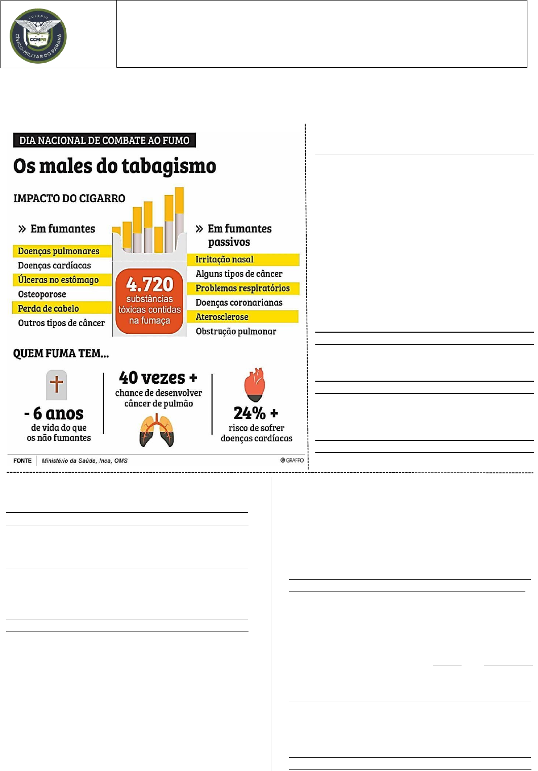 ATIVIDADE DE LÍNGUA PORTUGUESA Leia o texto abaixo e responda às questões 1 – 14. 6. Cite duas informações secundárias apresentadas no texto. 7. Quais são os órgãos responsáveis pelo texto e pela veracidade das informações apresentadas? 8. Cite, pelo menos, duas informações responsáveis em trazer um forte impacto ao leitor e convencê-lo a não fazer uso de tabaco. 9. Sobre os impactos do cigarro em fumantes e fumantes passivos, conforme o texto, assinale a alternativa que não apresenta embasamento textual. a) Em fumantes passivos, os impactos do cigarro são piores. b) As doenças provocadas pelo uso do cigarro são semelhantes. c) Esses dois grupos estão sujeitos ao aparecimento de câncer. d) As doenças respiratórias estão presentes nos dois grupos. 10. No texto, a palavra IMPACTO poderia ser substituída, sem prejuízo no sentido, por: a) Conflito. b) Repercussão. c) Resultado. d) Impulso. 11. Que elementos não verbais são responsáveis por tornar o texto mais atrativo e despertar a atenção do leitor? 12. O uso das reticências em “QUEM FUMA TEM...” marca a) uma interrupção. b) uma hesitação. c) um chamamento. d) uma continuidade. 13. Reescreva o trecho “Os males do tabagismo” substituindo as expressões grifadas por sinônimos, sem prejudicar o sentido original do texto. 14. Em sua opinião, por que é importante incentivar campanhas publicitárias para combater o uso de cigarros na sociedade? 1. Como se chama o gênero desse texto? 2. Qual dos itens abaixo não representa uma finalidade do texto? a) Sistematizar e organizar informações complexas em simples. b) Estabelecer informações de uma forma fácil de entender. c) Hierarquizar os conteúdos, tornando-os muito mais atrativos. d) Delimitar ideias e organizar opiniões para convencer o leitor. 3. Qual acontecimento motivou a publicação desse texto para os leitores? 4. Onde é comum encontrar esse tipo de texto? 5. Qual a informação principal trazida pelo texto? COLÉGIO CÍVICO MILITAR PRESIDENTE KENNEDY Ensino Fundamental e Médio Aluno(a): ________________________________________nº______ Turma: _______ Data: ___/___/2024.