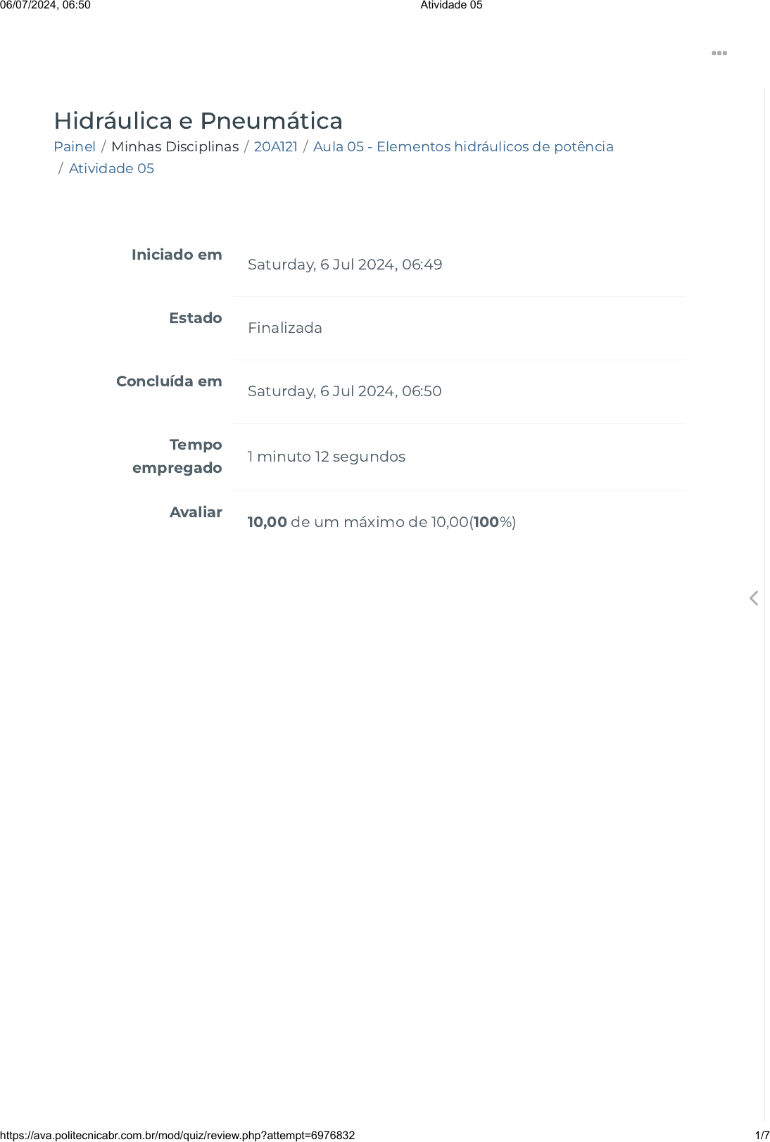 Painel / Minhas Disciplinas / 20A121 / Aula 05 - Elementos hidráulicos de potência / Atividade 05 Hidráulica e Pneumática Iniciado em Saturday, 6 Jul 2024, 06:49 Estado Finalizada Concluída em Saturday, 6 Jul 2024, 06:50 Tempo empregado 1 minuto 12 segundos Avaliar 10,00 de um máximo de 10,00(100%) 06/07/2024, 06:50 Atividade 05 https://ava.politecnicabr.com.br/mod/quiz/review.php?attempt=6976832 1/7 https://ava.politecnicabr.com.br/my/ https://ava.politecnicabr.com.br/my/ https://ava.politecnicabr.com.br/course/view.php?id=958 https://ava.politecnicabr.com.br/course/view.php?id=958#section-7 https://ava.politecnicabr.com.br/mod/quiz/view.php?id=33185 https://ava.politecnicabr.com.br/ Questão 1 Correto Atingiu 2,00 de 2,00 Na aplicação de uma direção hidráulica de caminhão, para girar as rodas do veículo, é utilizado: Escolha uma opção: a. cilindro de simples ação. b. cilindro de dupla ação. c. cilindro de haste passante. d. cilindro de simples ação com retorno por mola. e. cilindro telescópico. 06/07/2024, 06:50 Atividade 05 https://ava.politecnicabr.com.br/mod/quiz/review.php?attempt=6976832 2/7 https://ava.politecnicabr.com.br/ Questão 2 Correto Atingiu 2,00 de 2,00 Em cilindros hidráulicos de dupla ação, a força de avanço é maior que a força de retorno. A explicação desse fato deve-se: Escolha uma opção: a. ao tipo de montagem de cilindro escolhido. b. à área do pistão igual nos dois c. ao retorno por mola. d. à existência da haste no retorno. e. à haste passante. 06/07/2024, 06:50 Atividade 05 https://ava.politecnicabr.com.br/mod/quiz/review.php?attempt=6976832 3/7 https://ava.politecnicabr.com.br/ Questão 3 Correto Atingiu 2,00 de 2,00 Sendo força o produto da pressão vezes a área (F = p × A), para um cilindro de 20,2 cm² de área em uma pressão de 140 kg/ cm², qual a força resultante? Escolha uma opção: a. 3240 kg b. 2240 kg c. 1240 kg d. 2828 kg e. 4228 kg 06/07/2024, 06:50 Atividade 05 https://ava.politecnicabr.com.br/mod/quiz/review.php?attempt=6976832 4/7 https://ava.politecnicabr.com.br/ Questão 4 Correto Atingiu 2,00 de 2,00 Para um caminhão basculante, para o qual é necessário um cilindro hidráulico com grande extensão e curso com tamanho reduzido, o cilindro mais aconselhado é: Escolha uma opção: a. cilindro de dupla ação. b. cilindro de haste passante. c. cilindro de simples ação com retorno por mola. d. cilindro de simples ação. e. cilindro telescópico. 06/07/2024, 06:50 Atividade 05 https://ava.politecnicabr.com.br/mod/quiz/review.php?attempt=6976832 5/7 https://ava.politecnicabr.com.br/ Questão 5 Correto Atingiu 2,00 de 2,00 Para uma pressão de 210 bar no circuito e força da carga de 170000 N ou 17000 kg, o diâmetro do cilindro deve ser, pelas tabelas do fabricante: Escolha uma opção: a. três polegadas e �⁄� (82,6 mm). b. cinco polegadas (127,0 mm). c. quatro polegadas (101,6 mm). d. seis polegadas (182,4 mm). e. duas polegadas (50,8 mm). Entre em Contato https://www.politecnicabr.com.br 0800 084 2627 0800 084 2627 Links Úteis Dicas da nossa Diretora Acadêmica Planner de Estudos Declaração de Matrícula Orientações do AVA Abertura de Ticket Fale com o Tutor Cronograma de Estudos Manual de Estágio Manual de Competência Siga-nos nas redes sociais 06/07/2024, 06:50 Atividade 05 https://ava.politecnicabr.com.br/mod/quiz/review.php?attempt=6976832 6/7 https://www.politecnicabr.com.br/ https://soundcloud.com/user-501638417/sets/escola-politecnica-brasileira https://soundcloud.com/user-501638417/sets/escola-politecnica-brasileira https://storage.googleapis.com/sirius-pubstore/semestre_plannerdeestudo%20poli.pdf https://storage.googleapis.com/sirius-pubstore/semestre_plannerdeestudo%20poli.pdf https://storage.googleapis.com/sirius-pubstore/declaracao_matricula.pdf https://storage.googleapis.com/sirius-pubstore/declaracao_matricula.pdf https://storage.googleapis.com/sirius-pubstore/orientacoes_ava.pdf https://storage.googleapis.com/sirius-pubstore/orientacoes_ava.pdf https://storage.googleapis.com/sirius-pubstore/abertura_ticket.pdf https://storage.googleapis.com/sirius-pubstore/abertura_ticket.pdf https://storage.googleapis.com/sirius-pubstore/fale_com_tutor.pdf https://storage.googleapis.com/sirius-pubstore/fale_com_tutor.pdf https://storage.googleapis.com/sirius-pubstore/cronograma_estudos.pdf https://storage.googleapis.com/sirius-pubstore/cronograma_estudos.pdf https://storage.googleapis.com/sirius-pubstore/manual_estagio.pdf https://storage.googleapis.com/sirius-pubstore/manual_estagio.pdf https://storage.googleapis.com/sirius-pubstore/manual_competencia.pdf https://storage.googleapis.com/sirius-pubstore/manual_competencia.pdf https://ava.politecnicabr.com.br/ © 2022 - Escola Politécnica Brasileira 06/07/2024, 06:50 Atividade 05 https://ava.politecnicabr.com.br/mod/quiz/review.php?attempt=6976832 7/7 https://ava.politecnicabr.com.br/mod/quiz/0 https://ava.politecnicabr.com.br/mod/quiz/0 https://www.facebook.com/politecnicabr https://www.instagram.com/politecnicabr_oficial https://ava.politecnicabr.com.br/